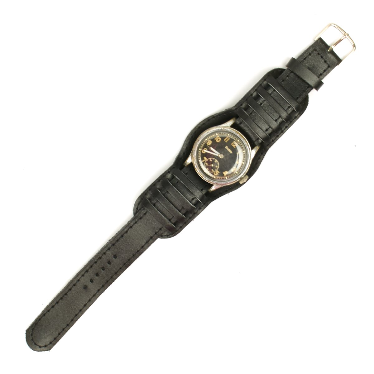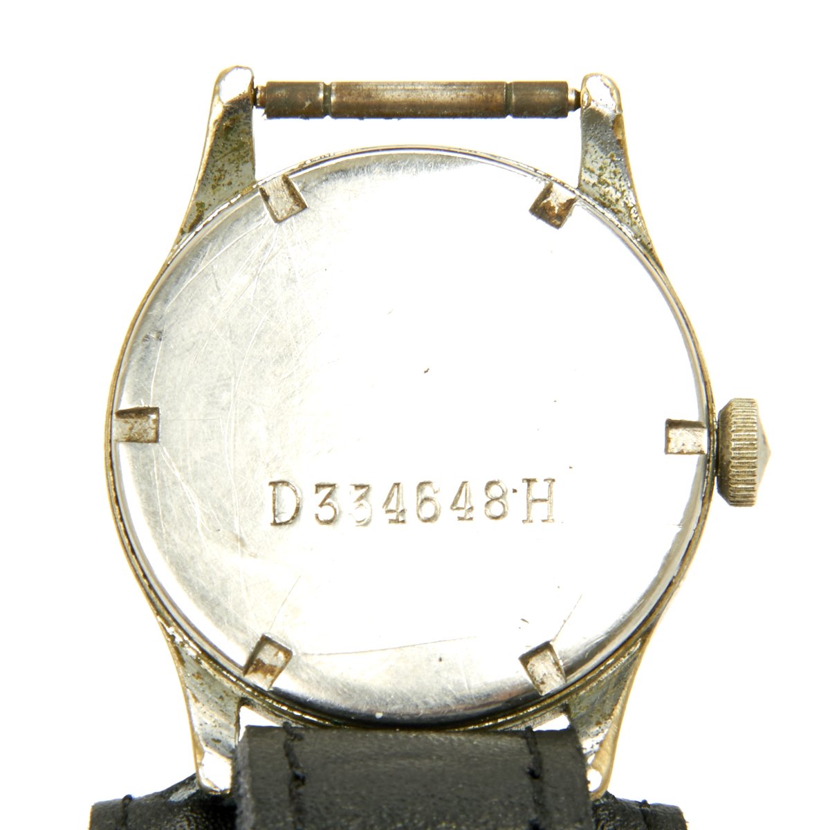 The pocket as well as the wristwatch had screwed backs and were shock resistant. The dial was black with a small second hand with radium digits and hands. The back was marked "D.H." (Deutsches Heer), with the case number. The watches were partly deployed and written into the soldier's book, and also sold to army staff. It is not entirely clear what D H stands for. Some writers suggest the D stands for Deutsches (Germany) and the H for Heer (Army). Some prefer the interpretation given by Konrad Knirim (http://www.knirim.de/english.htm), who has written that the D stands for Dienstuhr (Service Watch) and the H = Heer (Army). However, it is not entirely clear that DH watches were originally intended for the Army alone, given documented instances where the service record books of members of the Luftwaffe (Air Force) have been found with DH watch serial numbers written as issued to these troops. In addition to watches marked with DH, there are some identical watches with only the letter D in front of the serial number and no H after the number. Collectors speculate that these D only watches were for the Luftwaffe. Others speculate that these watches were used by Para-military personnel such as those working in railroads. However, given that the WWII German records have been lost we really don’t know for sure how these watches were issued.