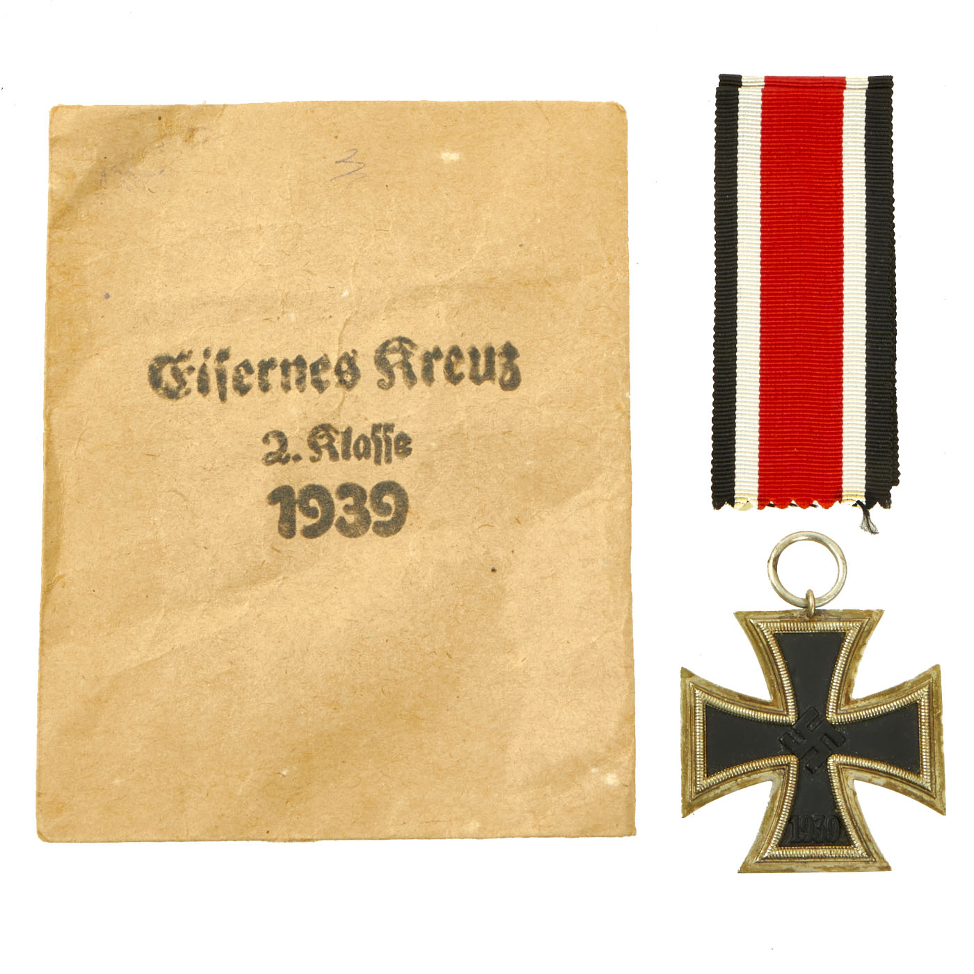 Original Item: Only One Available. This is a fantastic example of a nearly unissued German WWII Iron Cross 2nd Class 1939 (Eisernes Kreuz II. Klasse 1939) in its original paper packet with original red, black, and white ribbon. The cross itself is a very fine example with crisp beading. The silvering to the frame is oxidized to a nice dark patina, showing it is real silver. The core paint on the iron center is also virtually all present, on both sides. The cross comes with its original full length ribbon, still crisply folded. The original paper bag is brown paper version and is complete with no issues, and the correct markings in German Black Letter Typeface: