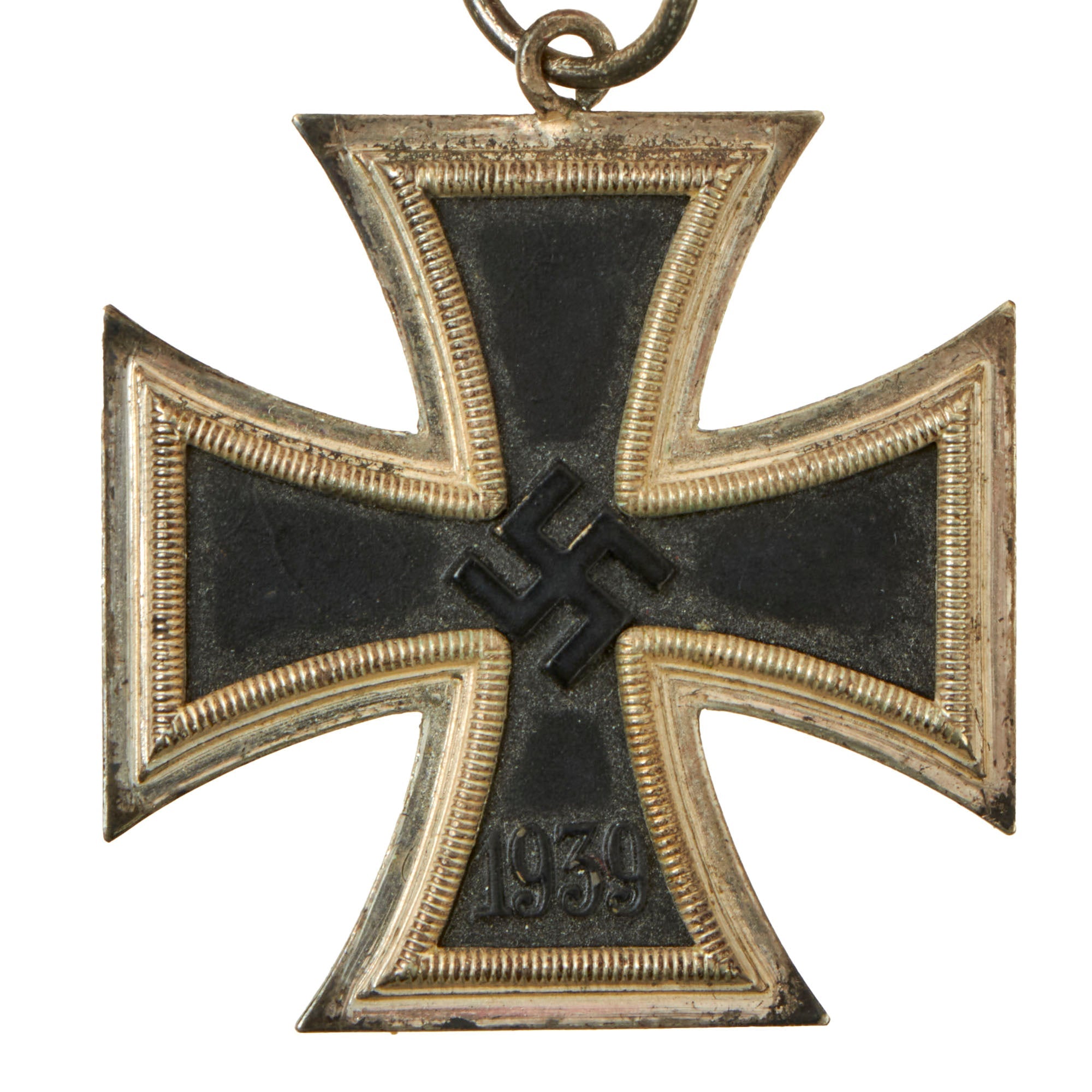 The basic design of the WWII crosses is a central Tatzenkreuz (cross pattée) struck from iron and mounted in a silver frame which has a raised crenulated decorative border. The obverse of the cross bears the date 1939 under a "mobile" swas. Second class crosses would have a ring at the top where a ring was attached, and had more markings on the back. The first class award, however, was meant to attach directly to the front of the uniform.