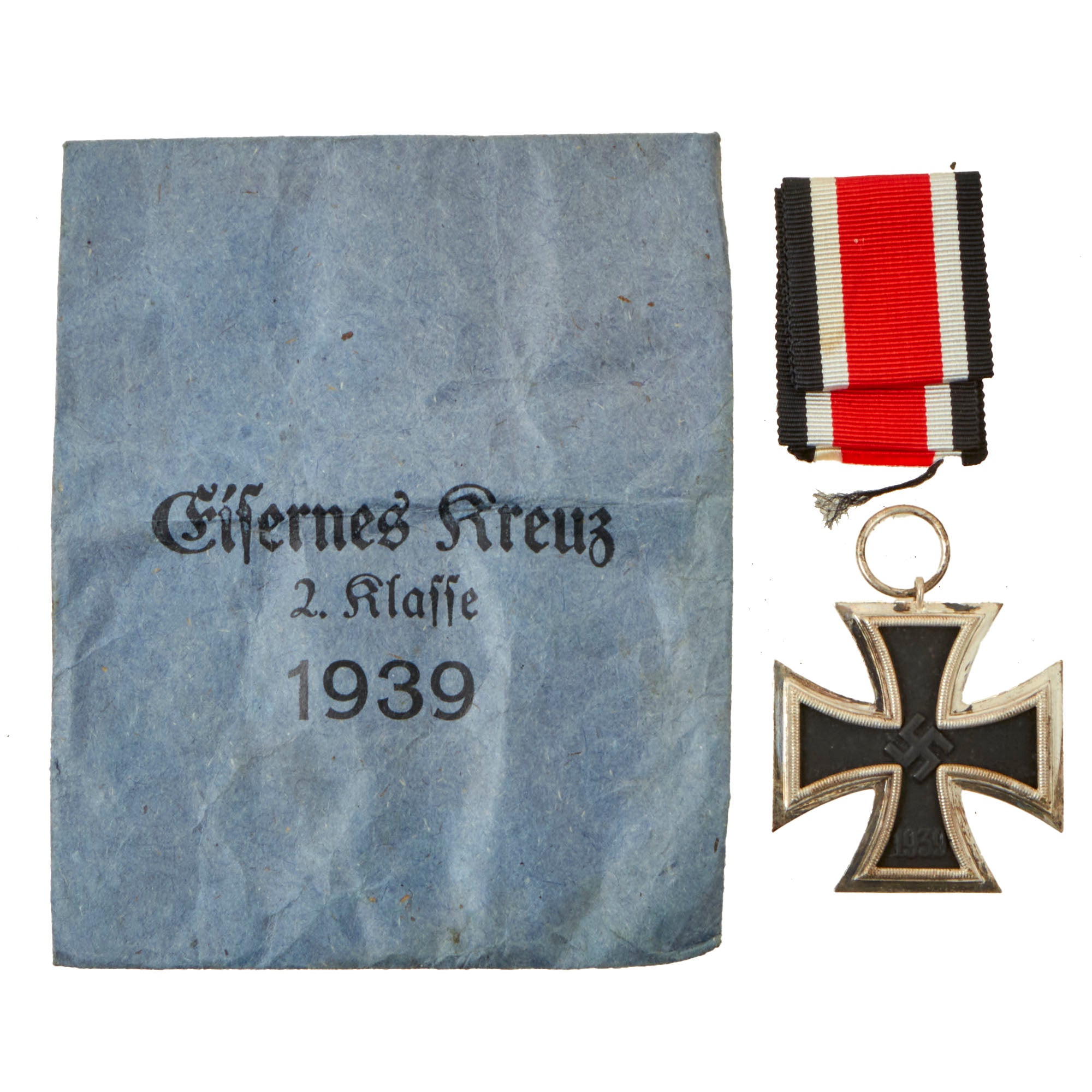 The cross comes with its original ribbon, still folded up as it was inside the packet, with no signs of use. The original paper packet is the blue paper version, and shows some wear and a bit of past wrinkling, however there are no tears and the top flap is fully intact. It has the correct markings in German Black Letter Typeface: