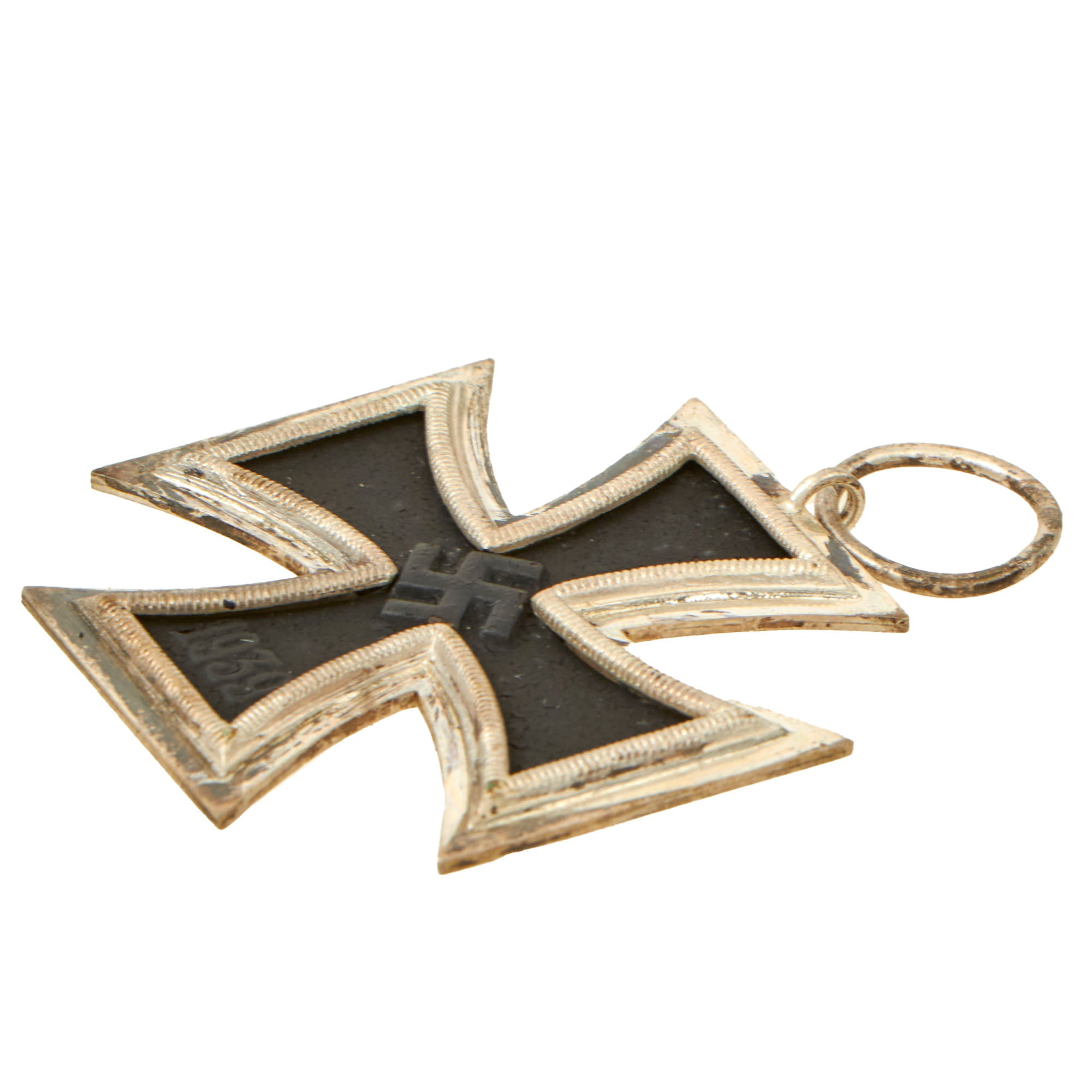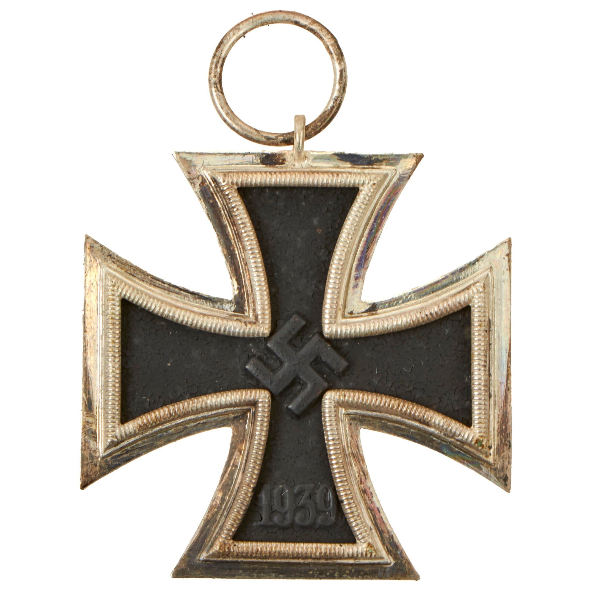 The basic design of the WWII crosses is a central Tatzenkreuz (cross pattée) struck from iron and mounted in a silver frame which has a raised crenulated decorative border. The obverse of the cross bears the date 1939 under a "mobile" swas. Second class crosses would have a ring at the top where a ring was attached, and had more markings on the back. The first class award, however, was meant to attach directly to the front of the uniform.