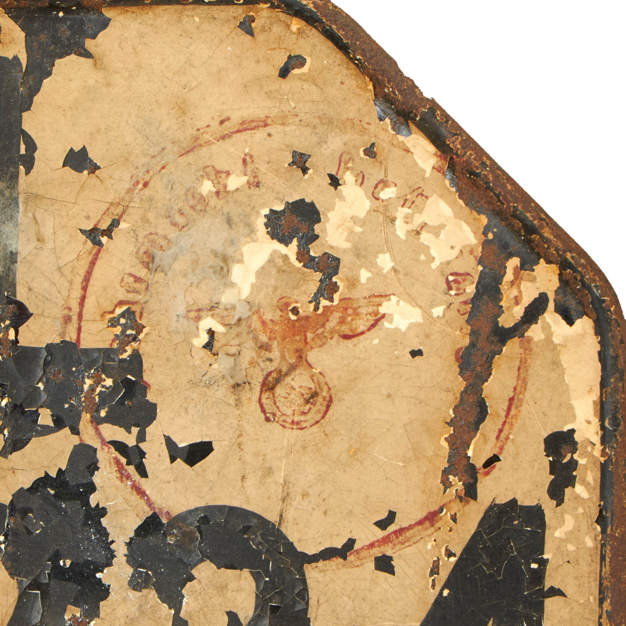 The license plate shows decay from age and service, as well as long storage, probably in a barn or attic somewhere. The plate is slightly bent, and there is definitely some flaking of the paint, as the black base layer looks to be baked on enamel, which often does not take paint well. The number is still fully legible, an the top and bottom brackets are fully intact.
