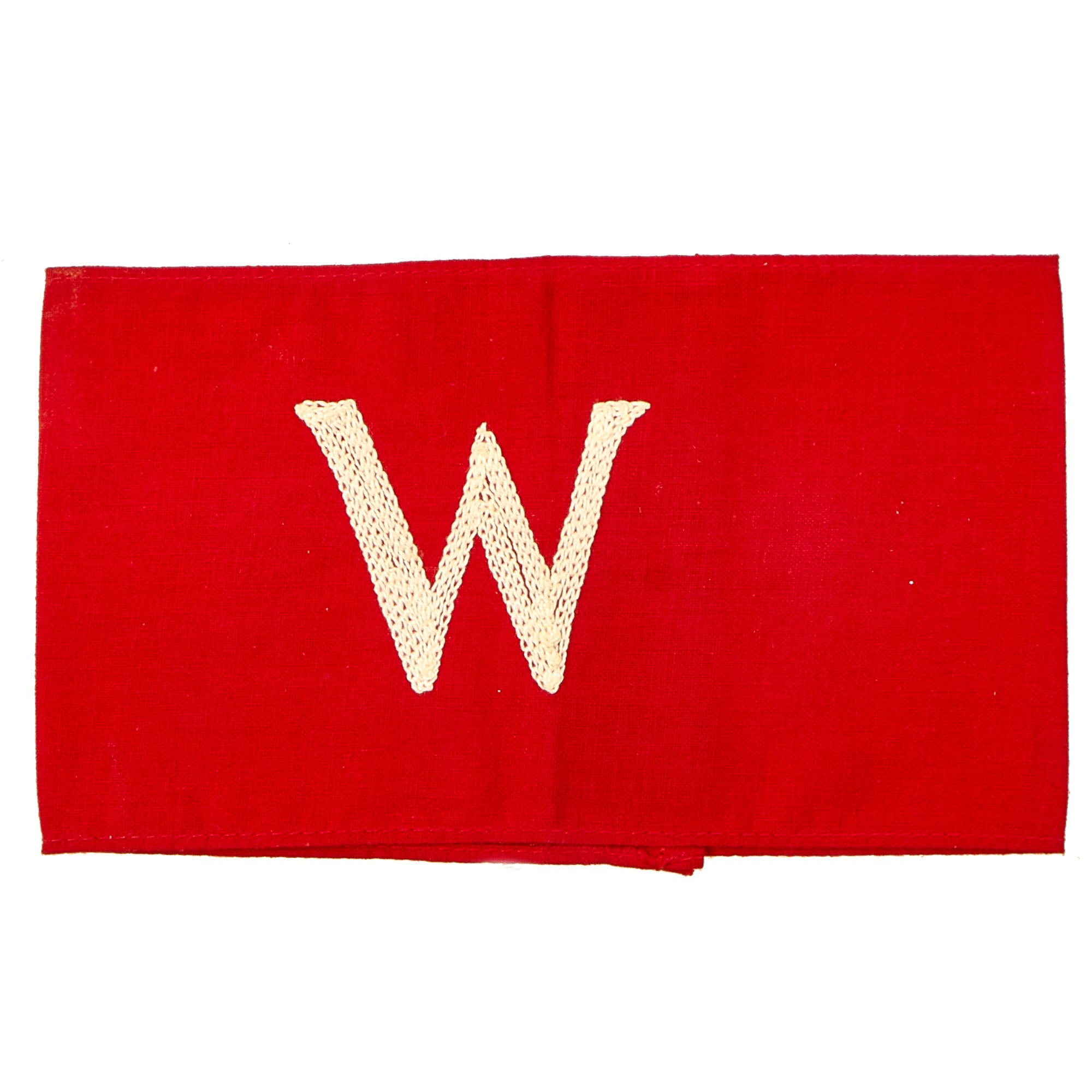 Original Item: Only One Available. This is very nice German WWII Werkluftschutz (Factory Air Raid Protection) Warden armband (Ärmelbinde), made from what we believe is machine woven cotton. This pattern of armband is one of several that were used by specialized personnel of the Reichsluftschutzbund, the German air raid defense organization during WWII. The design features a red band with a white rayon machine embroidered letter W, which indicates that they are a "Warden", though there is some disagreement over what the "W" stands for in German. The armband measures approximately 14 1/2" x 4 1/8", and is sewn together in the back.