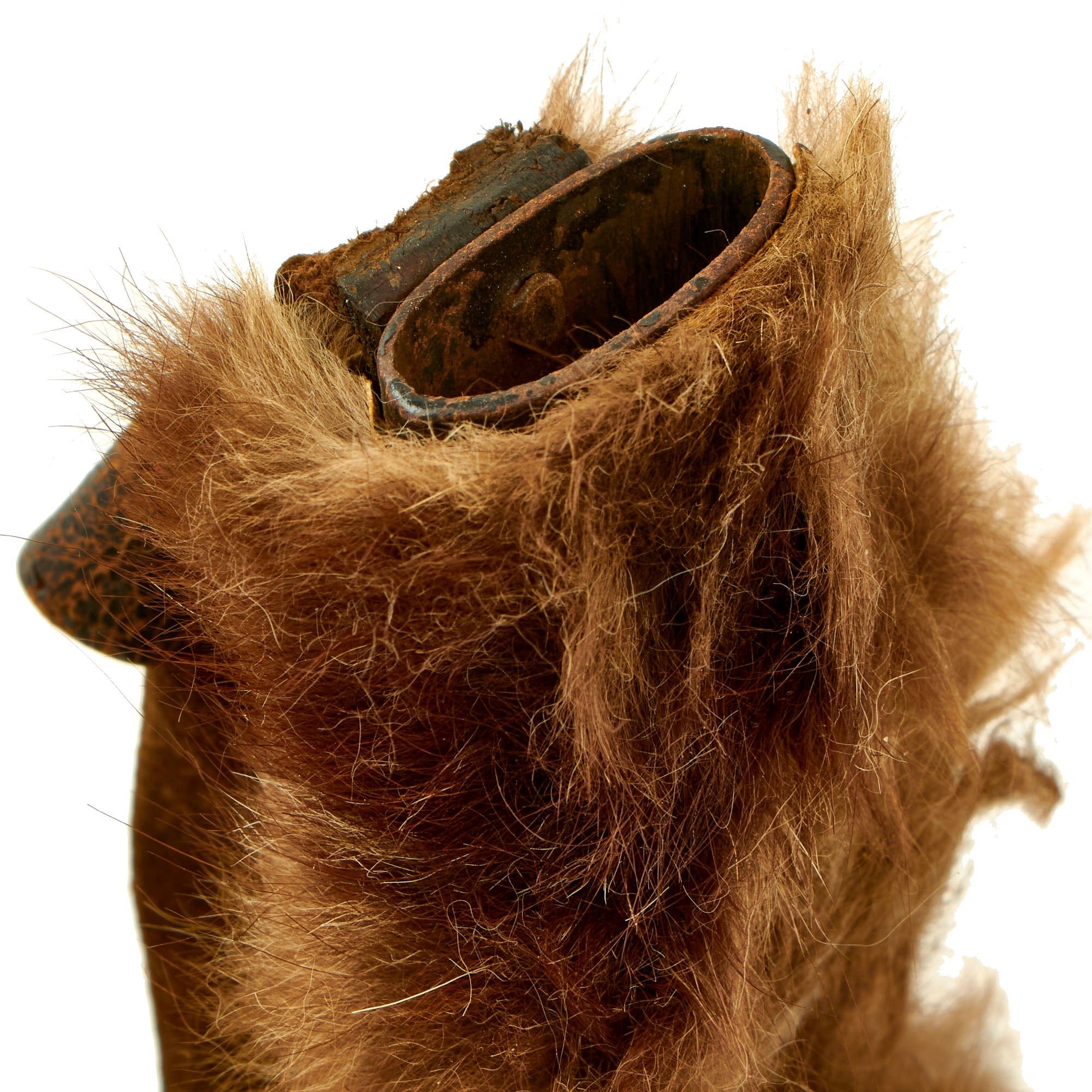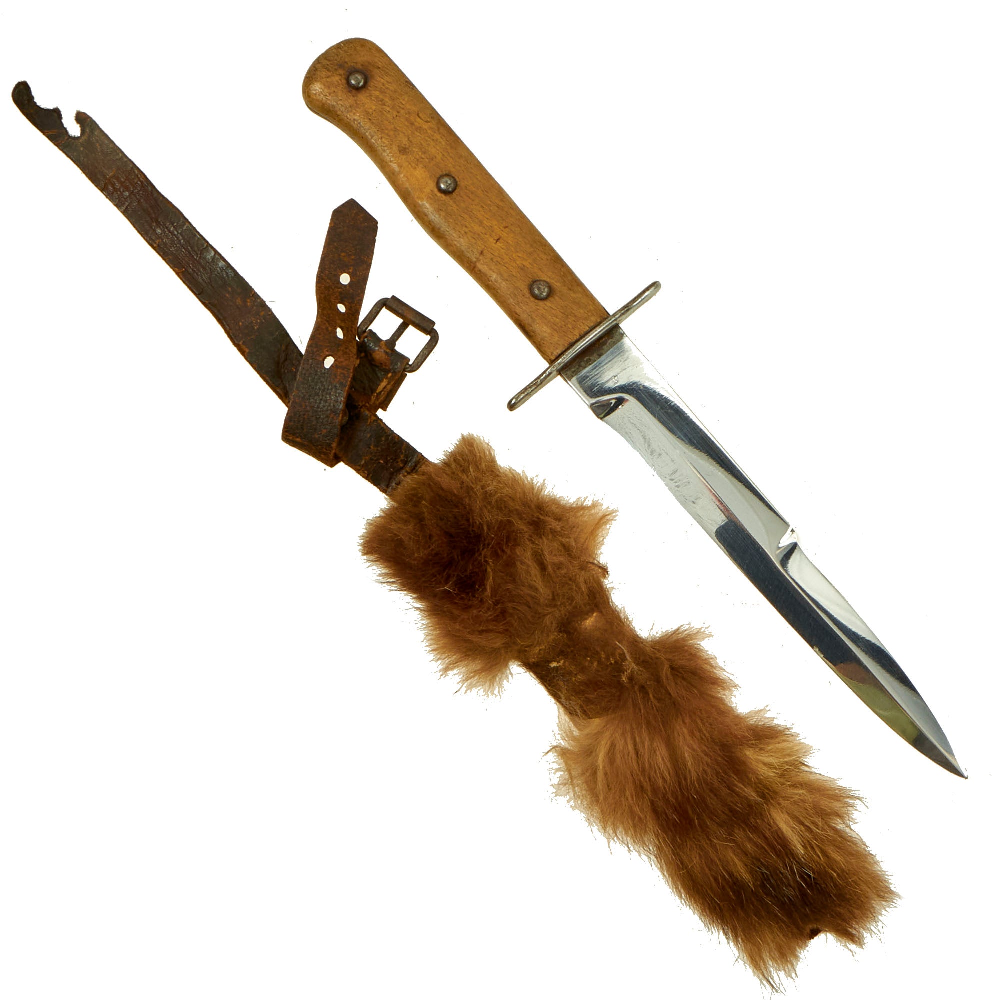 Original Item: Only One Available. Fitted with a single-edged spear point blade, this is an original German WWII Nahkampfmesser close fighting knife, with a great fur covered scabbard. This basic design was used by Imperial German in WWI, and was popular during WWII as well. Many WWI knives were even reissued for WWII, however this definitely is a WWII production example.