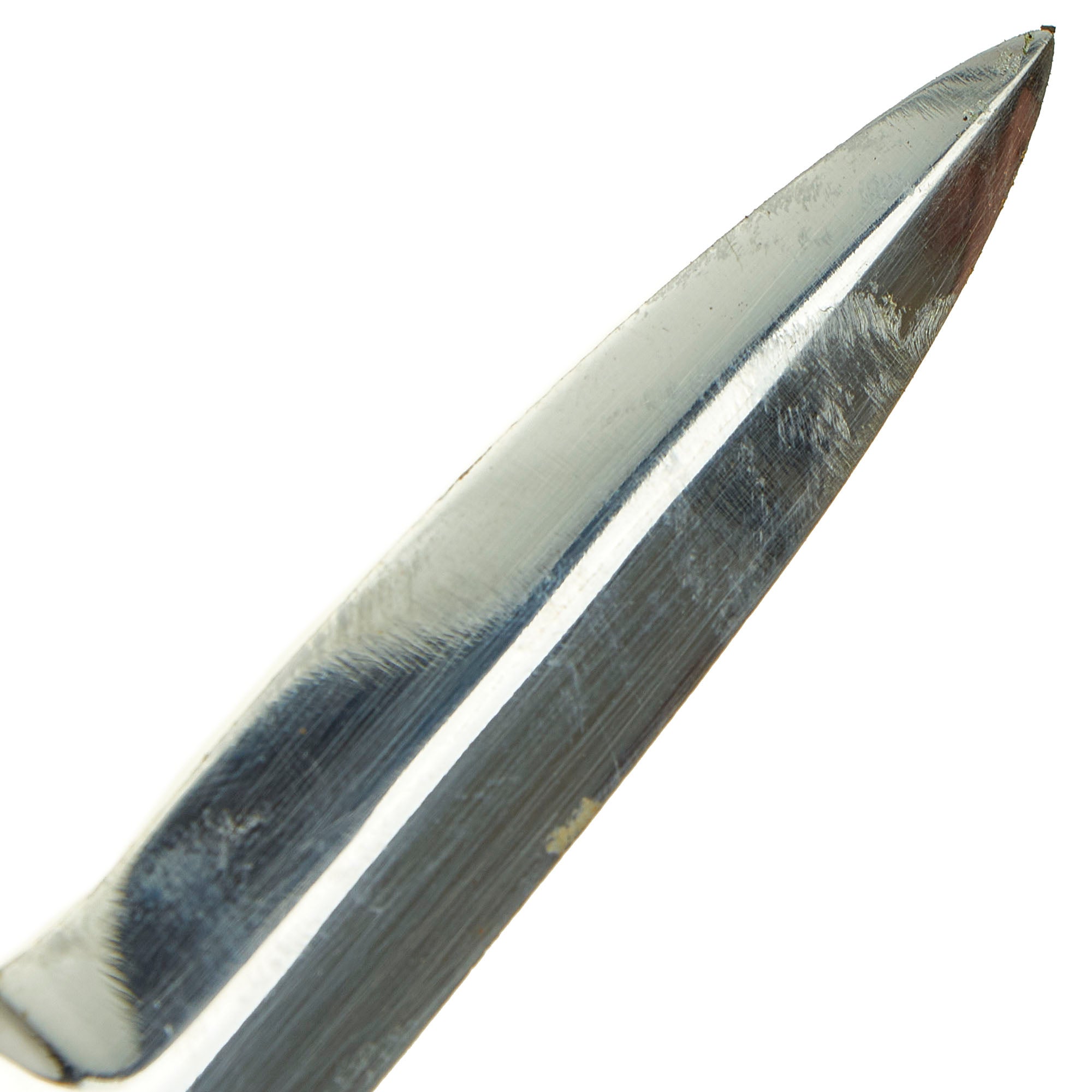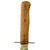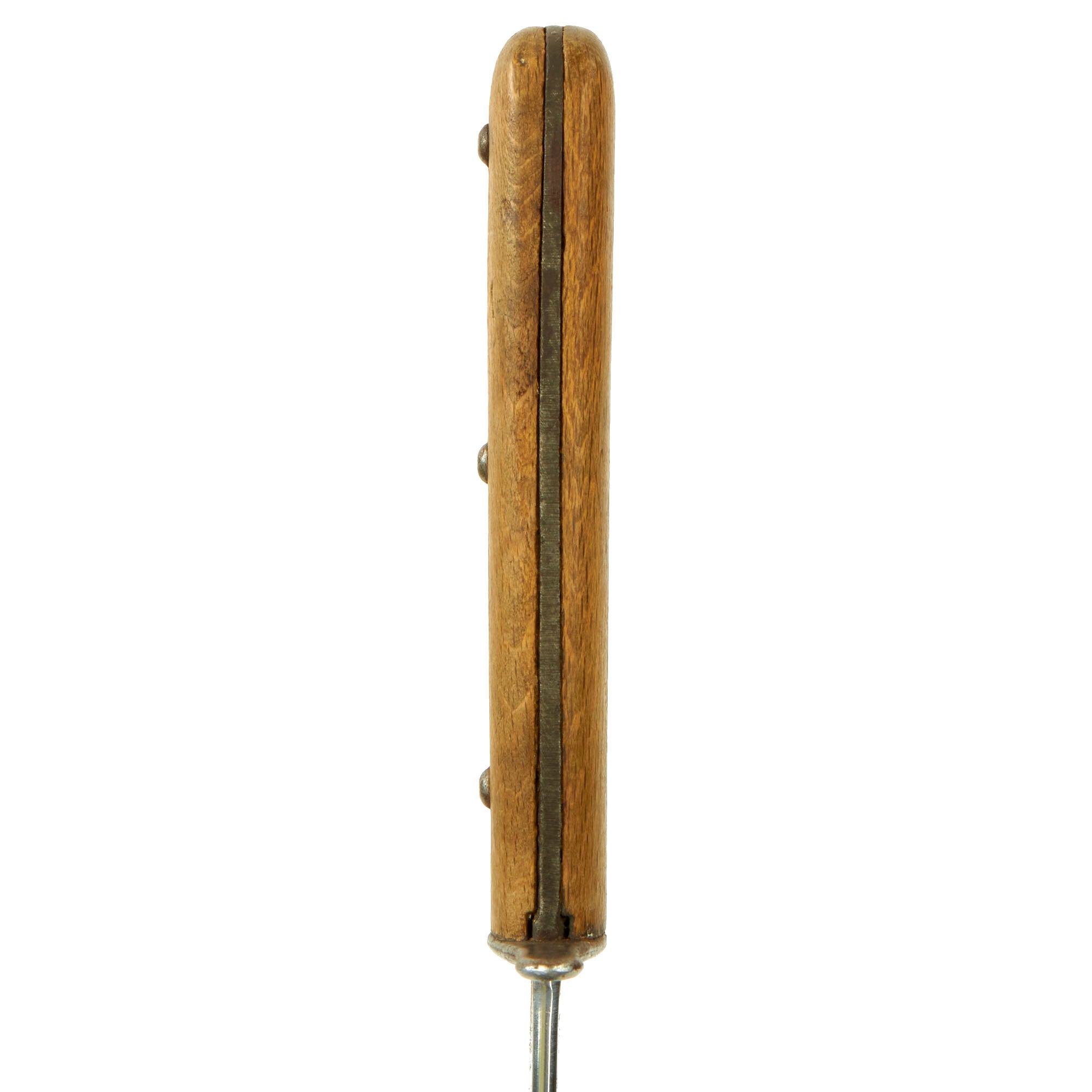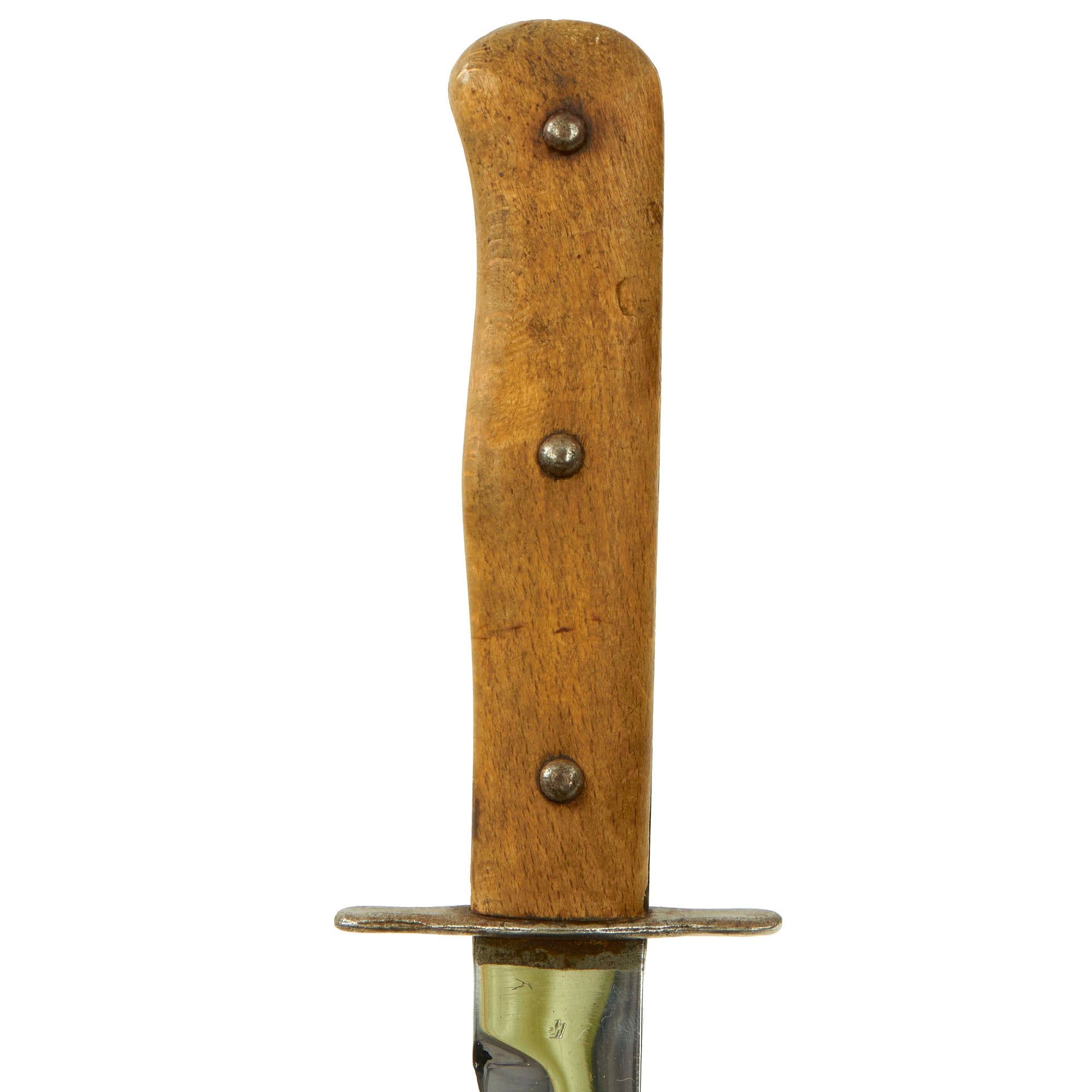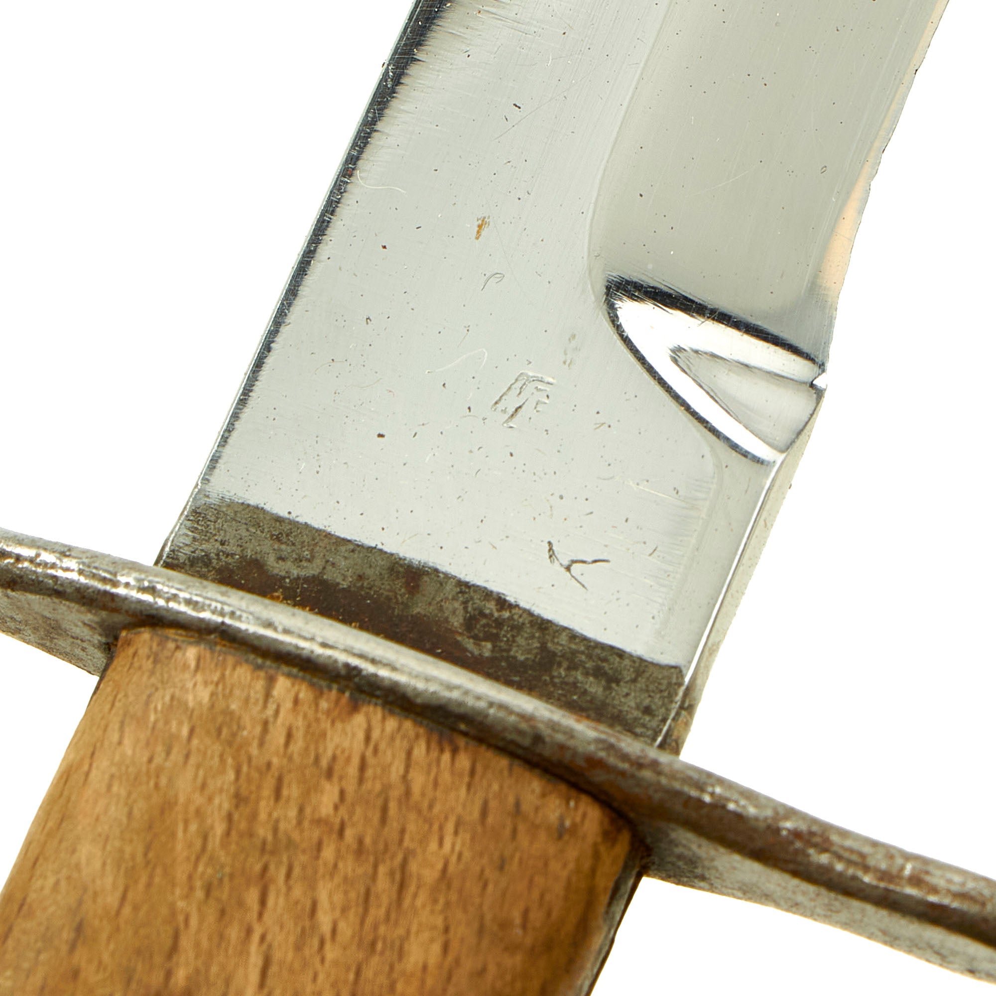 In very good lightly used condition, this knife has a smooth wooden grip secured by three rivets. Grip scales are in very good condition, with no cracks or major chips, and a nice color. The blade is full length on the bottom of the blade, while the top has a false edge which was sharpened, altering the appearance slightly. There is however still some of the original factory crossgrain on the ricasso and flat of the blade rear of the "false edge". Overall length is now 10 5/8 inches with a 6 1/8 inch blade. No markings are present on the ricasso, except for an unknown partial marking.
