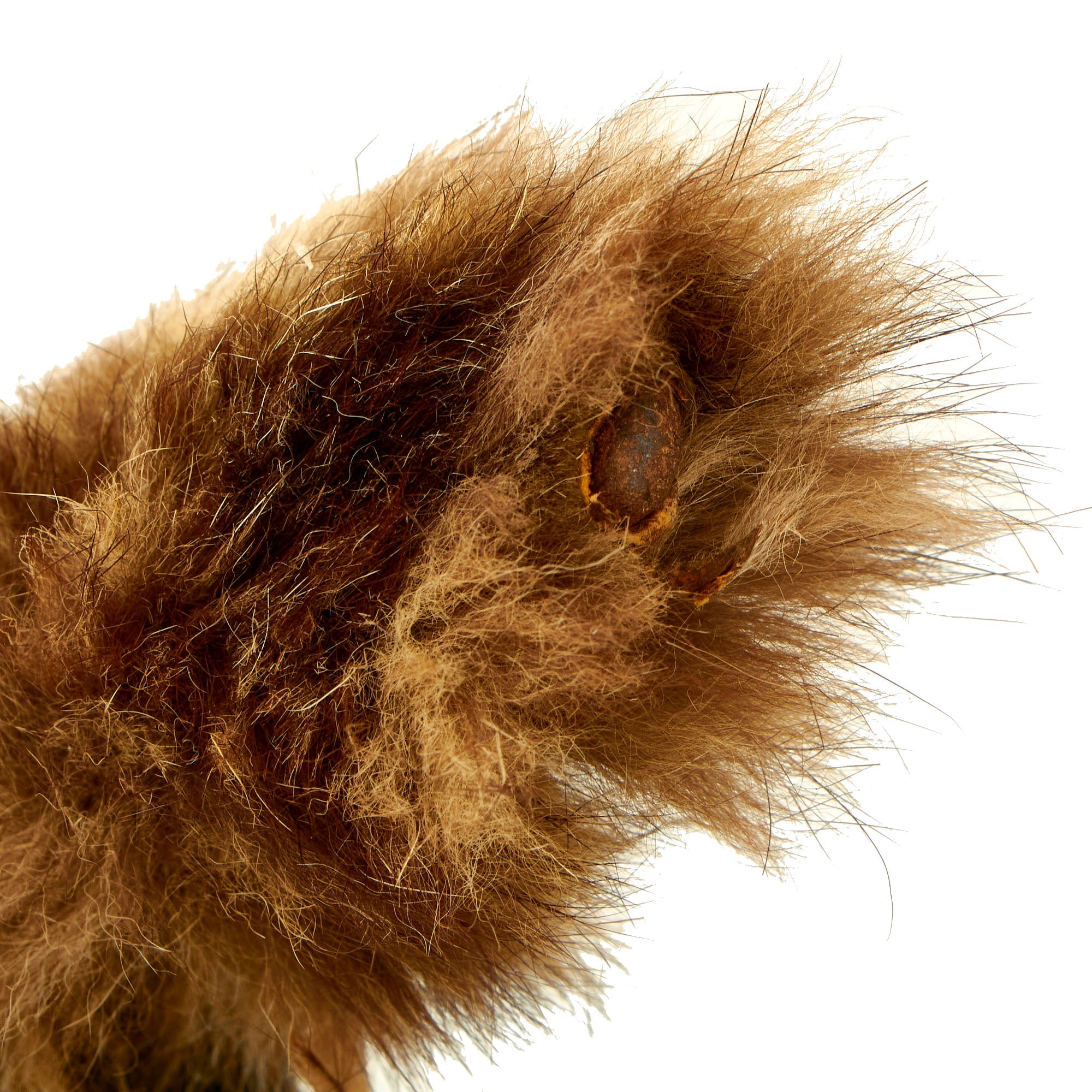 The knife comes in a genuine rolled steel WWII scabbard with a leather retaining strap and broken belt loop.. The finish on the scabbard cannot be seen as it was covered with fur. The fur is in good condition with matting only really present in the center.