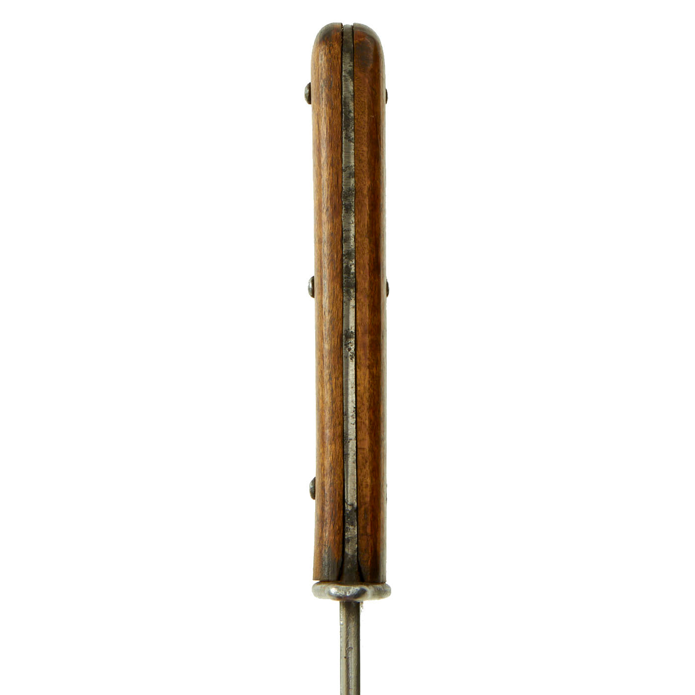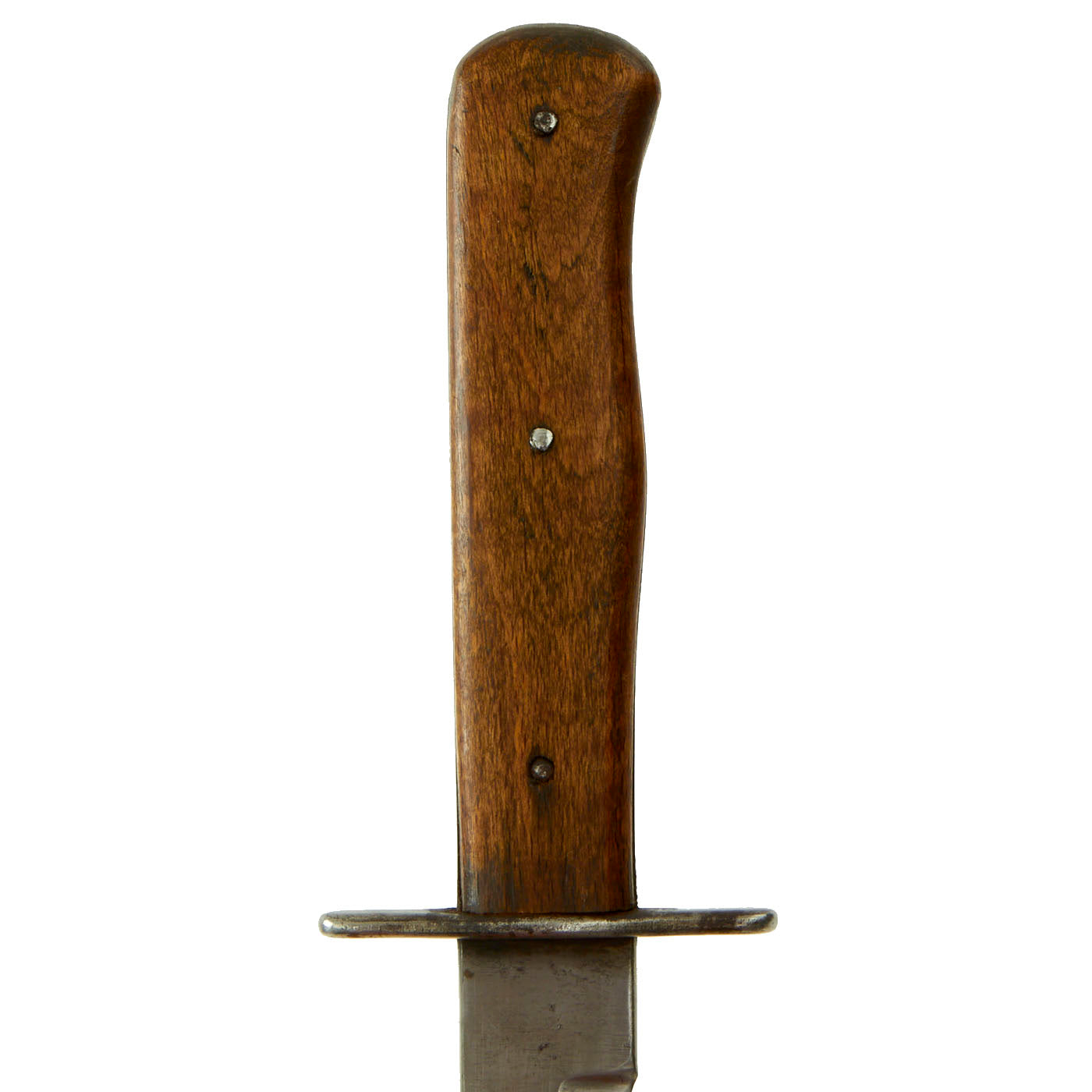 In very good lightly used condition, this knife has a smooth wooden grip secured by three rivets. Grip scales are in very good condition, with no cracks or major chips, and a nice color. The blade is full length on the bottom of the blade, while the top has a false edge. The blade has been used quite a bit, and sharpened multiple times, changing the blade profile somewhat. It has also reduced the overall blade length by about 1/2". There is however still some of the original factory crossgrain on the ricasso and flat of the blade rear of the "false edge". Overall length is now 10 5/8 inches with a 6 1/8 inch blade. No markings are present on the ricasso, except for the letter S, a marking we have seen before.