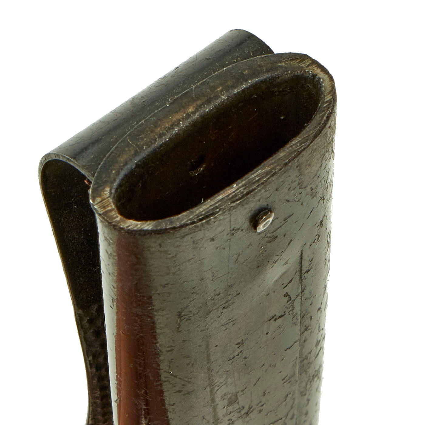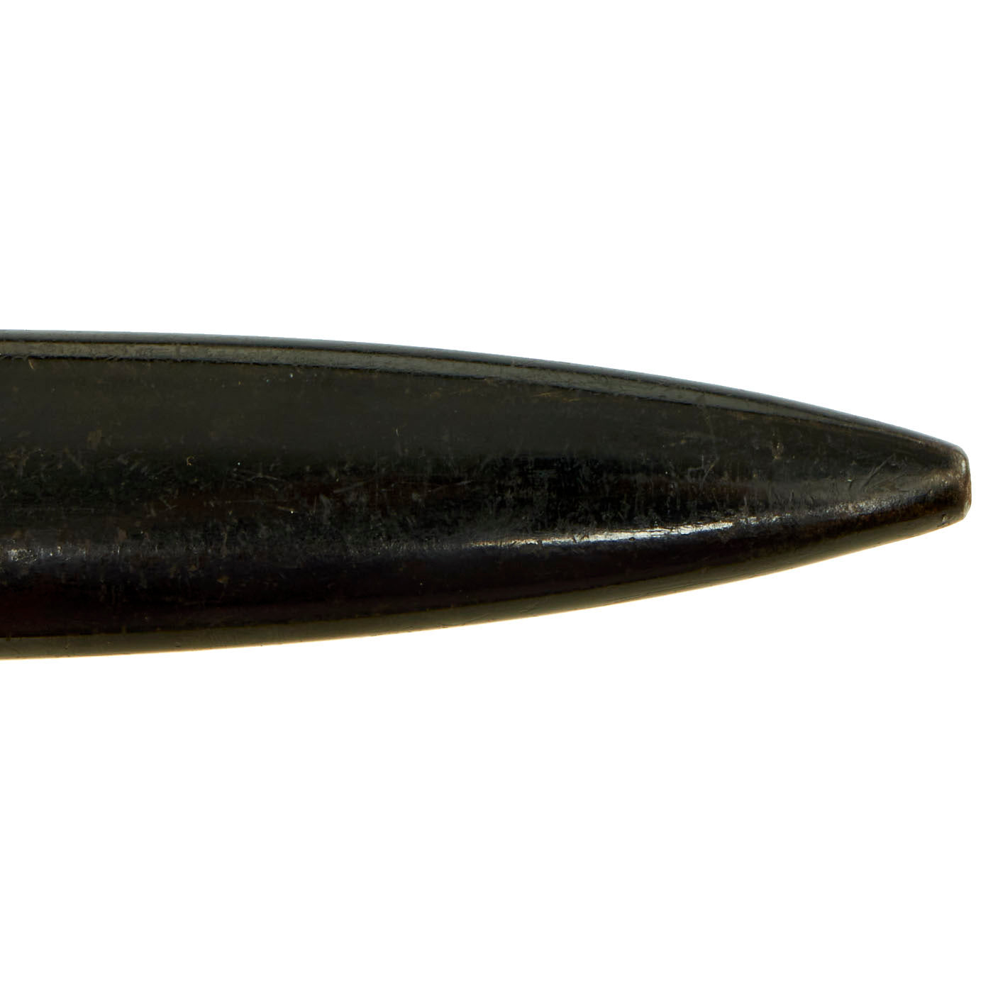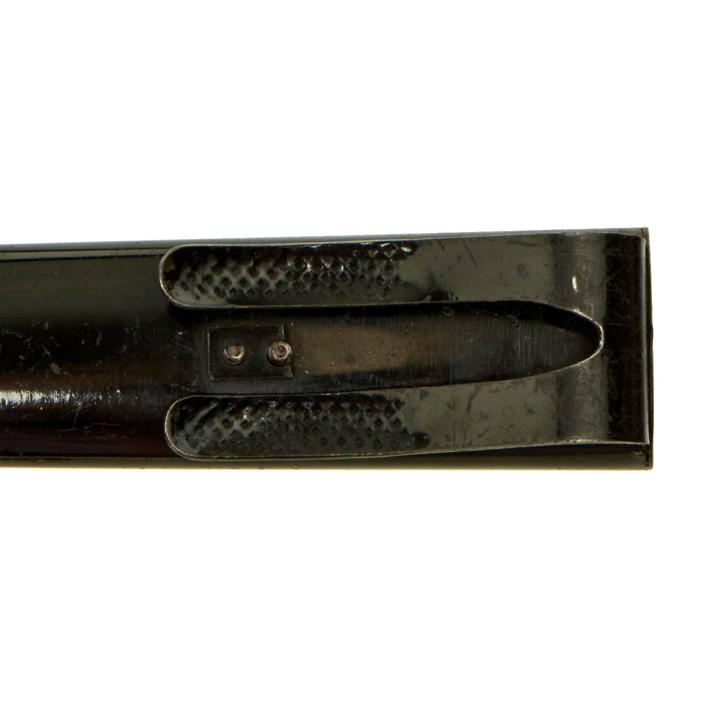 The knife comes in an genuine rolled steel WWII scabbard with a spring steel "boot" clip on the back, which would allow attachment to the the side of a boot or to a belt. This style of attachment held by pressure, and could also be mounted on other parts of the uniform. The finish on the scabbard is very good, with just a bit of crazing and wear, without any dents. There is some chipping on the front, but not enough to really detract from the piece.