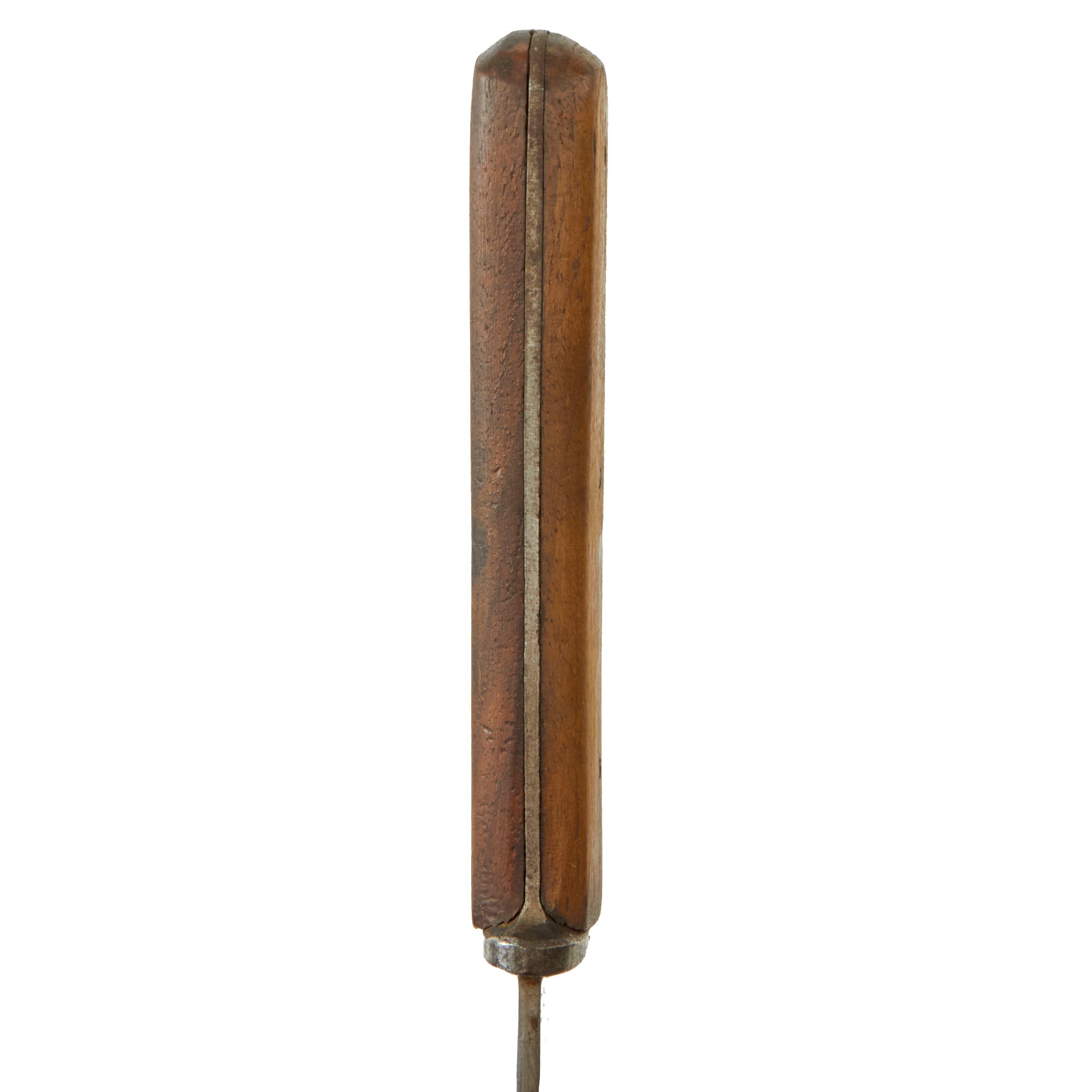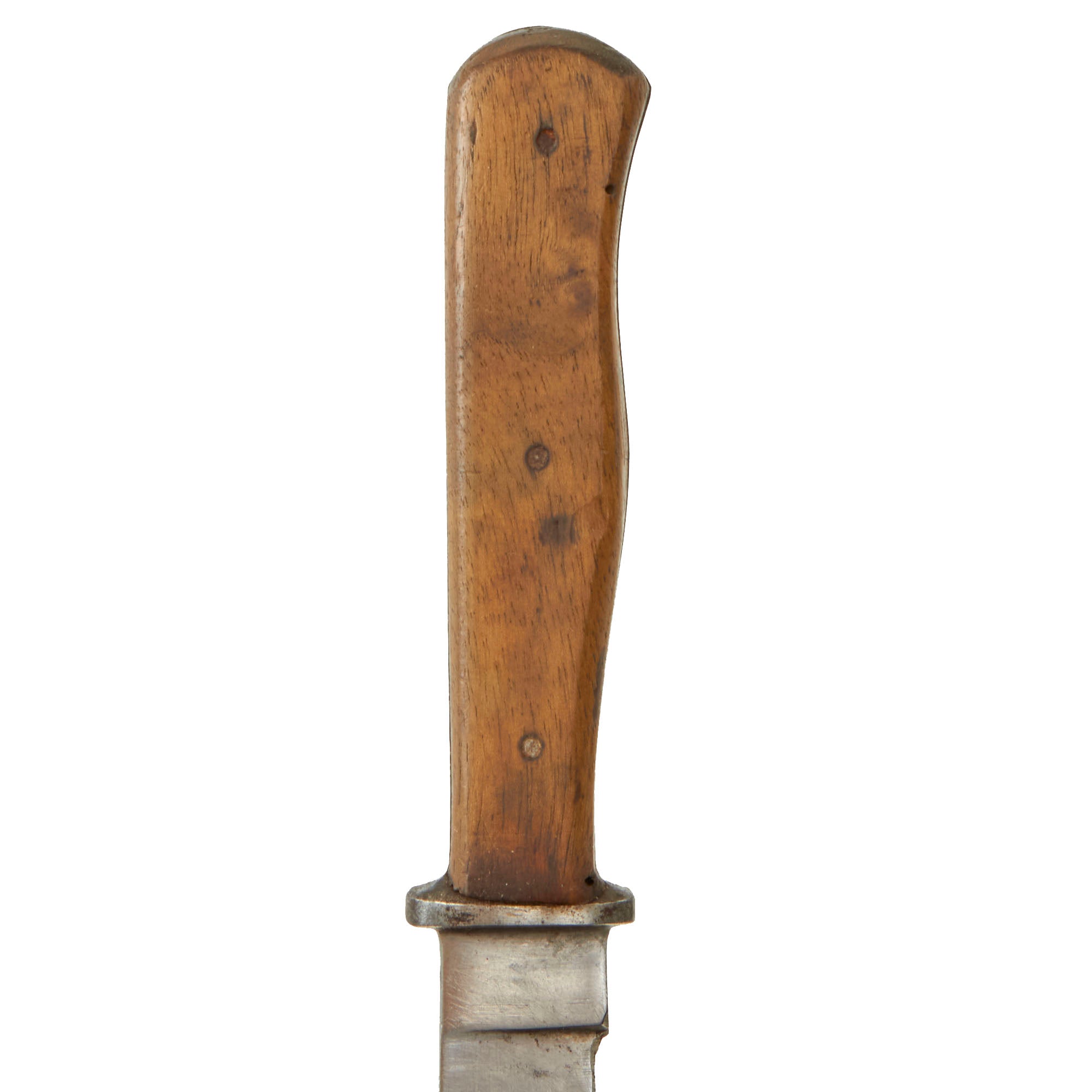 In good service used condition, this knife has a smooth wooden grip secured by three rivets. Grip scales are in very good condition, with no cracks or chips, and a nice color with some light staining. The blade is full length on the bottom of the blade, while the top has a false edge, which has correctly not been sharpened. The main edge however has been sharpened multiple times, changing the shape somewhat and reducing the blade length. Overall length is now 10 inches with a 5 ⅝ inch blade. No markings are present on the ricasso, which is typical, and the cross guard has had the sides removed, so would provide minimal protection.