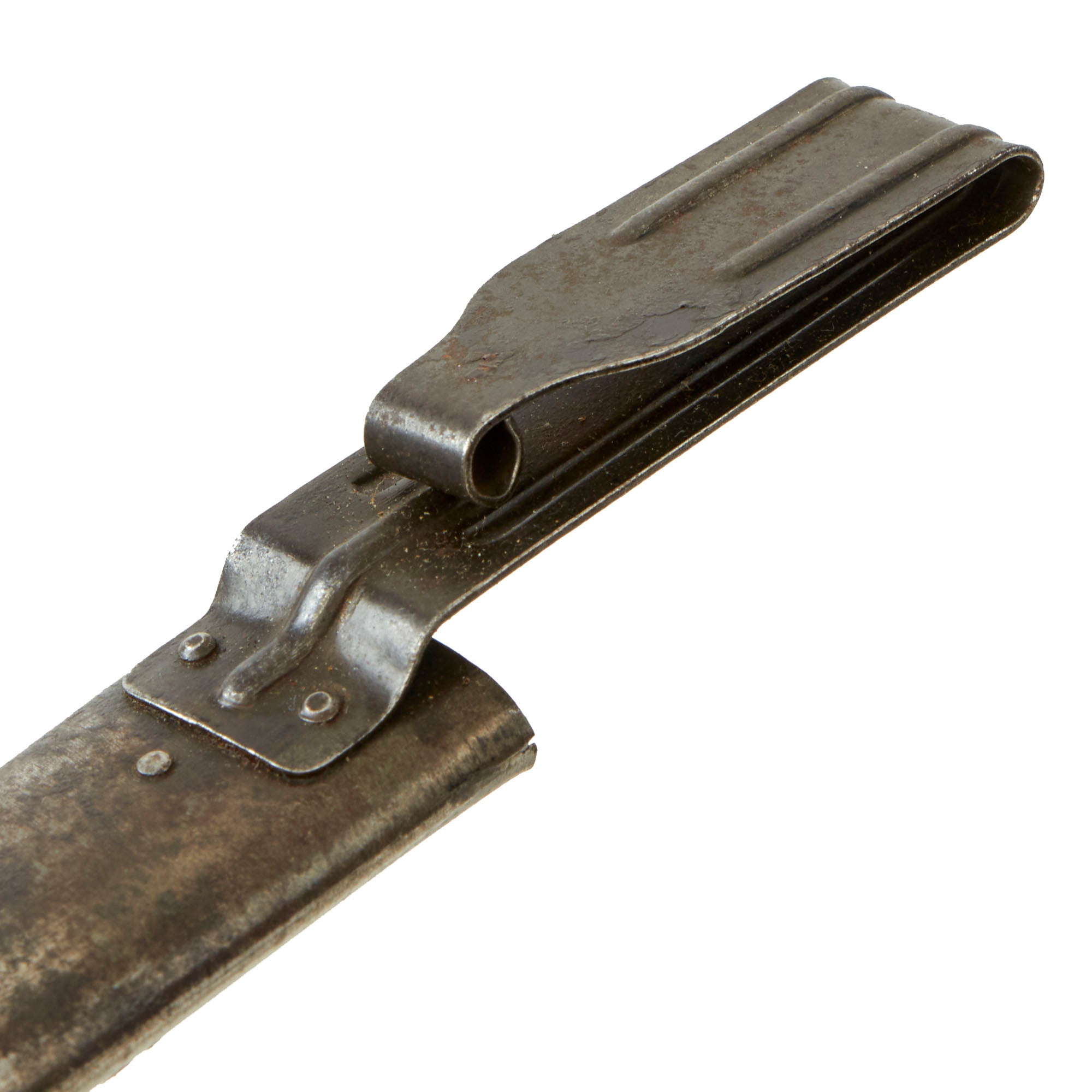 The original WWII scabbard is in very good condition, with a faded blued finish on the metal shell, which still shows the rolled steel texture in some areas. There are areas of oxidation and minor pitting, but no dents or major damage. The clip on the back, which could be used to secure to knife to a boot or any number of locations, is in great shape with just a bit of finish loss.