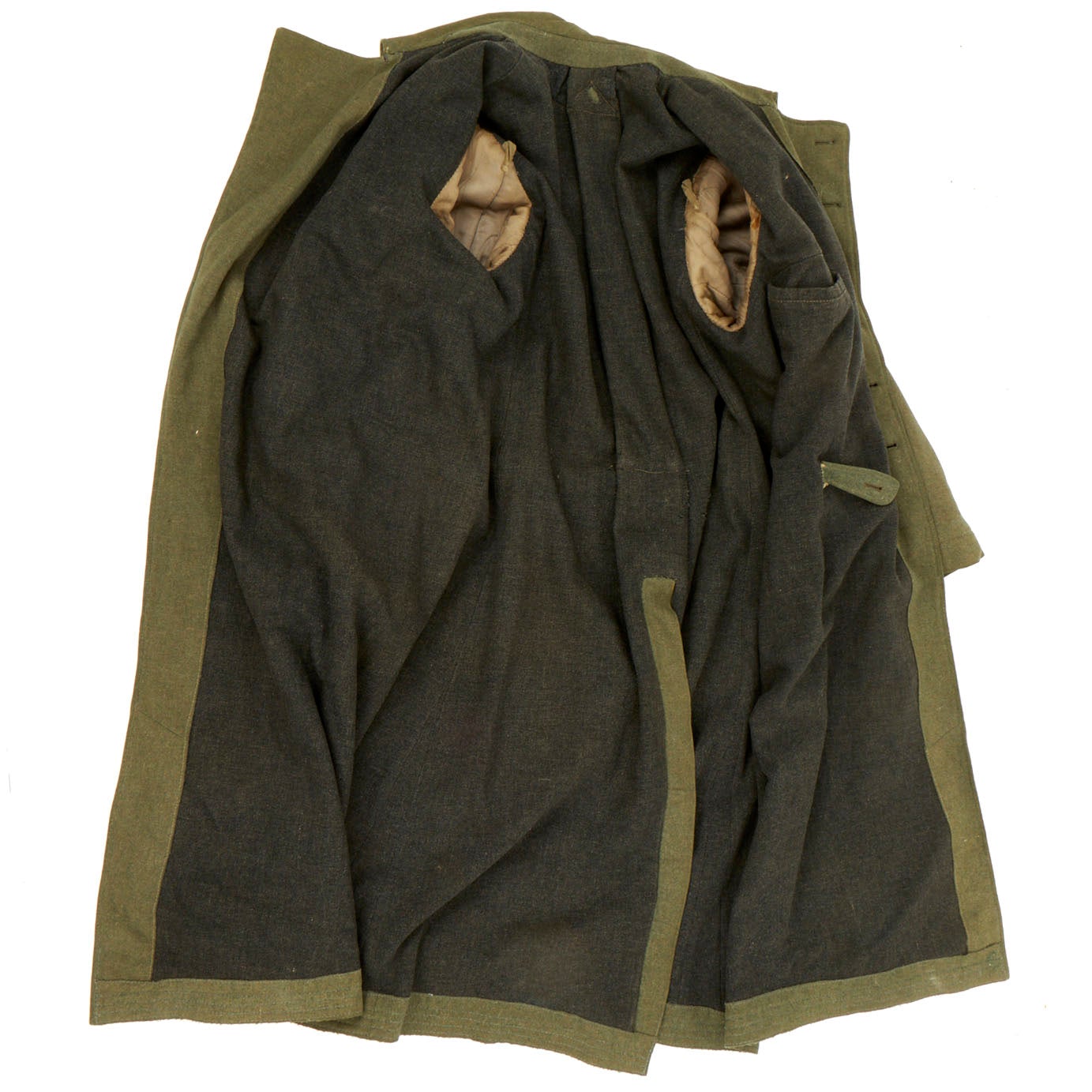 This is a very nice German World War Two SS Enlisted Man's M40 great coat or overcoat, constructed with an outer shell of heavy wool. No maker marks or stamps can be found on either the jacket or the painted pebbled buttons. The Eagle Sleeve insignia is a “hammerhead” style Waffen SS Enlisted man Sleeve Eagle. The insignia has faded slightly but is still in great condition without any thread fraying or coming loose. There are a few moth nips throughout the coat, but nothing major. There appears to be minor field repairs done to the coat, small tears hastily stitched up.