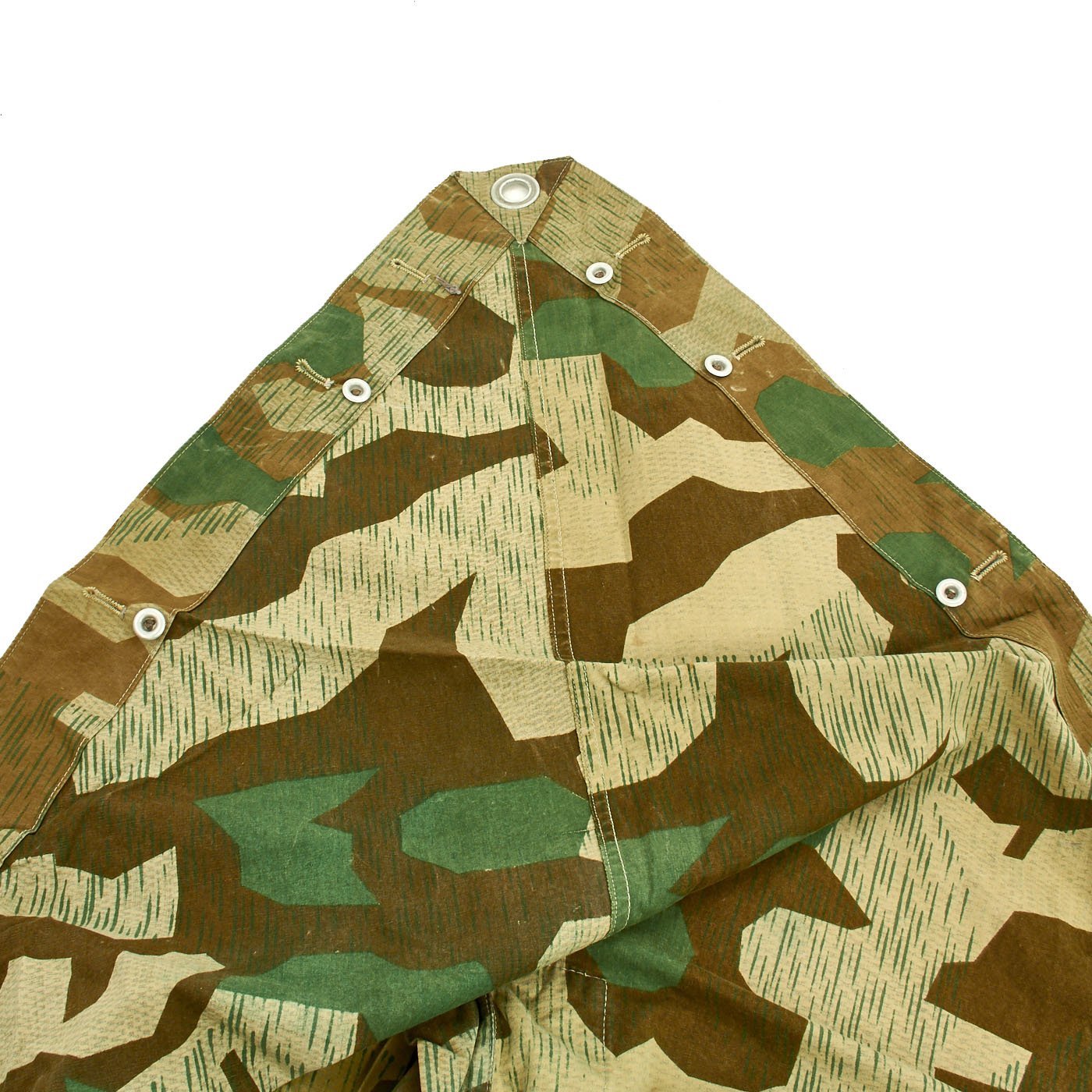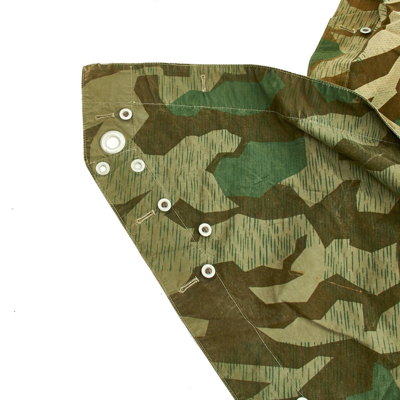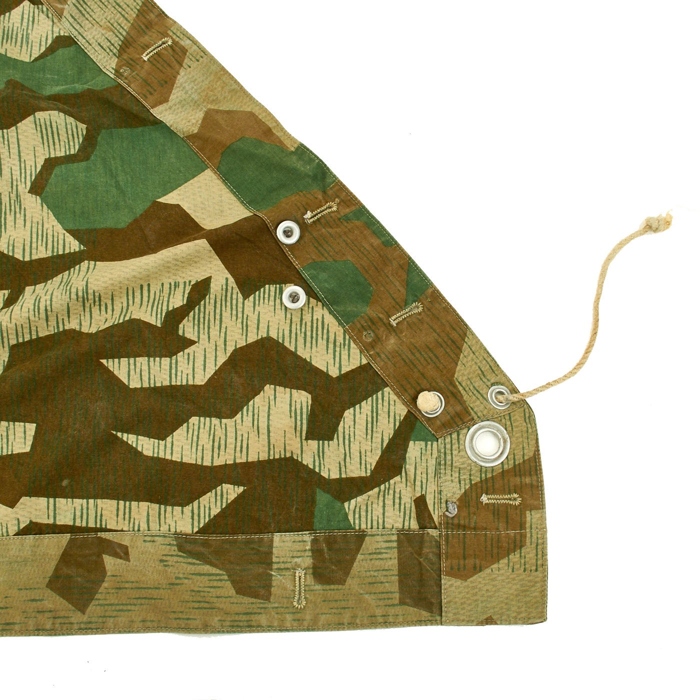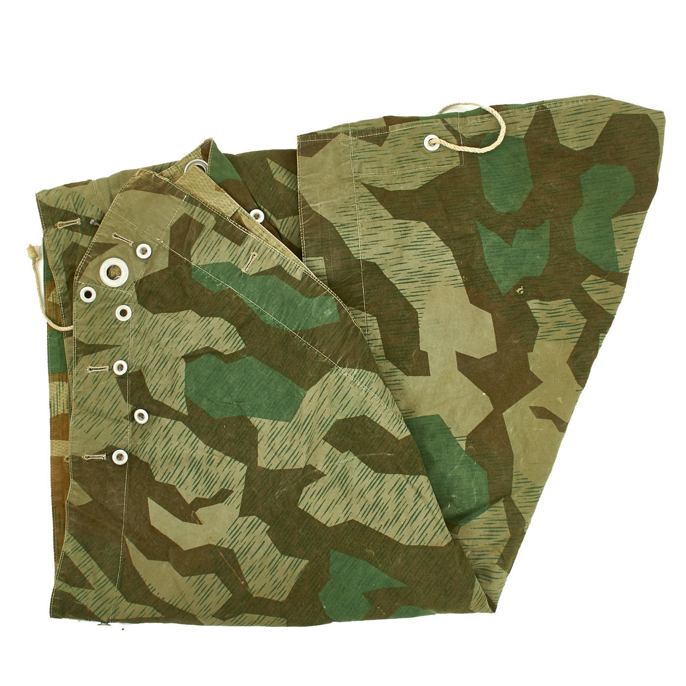 Original Item: Only One Available. The German Zeltbahn or Army Tent Quarter was a multi-purpose piece of German army regulation equipment that was issued to Wehrmacht soldiers during WWII. This piece of camouflaged material could be combined with three other to make a proper tent, or other quantities to construct shelters of various sizes, it was also used for camouflage, as a poncho or even a stretcher. This example comes in the very attractive reversible German Army Splinter pattern, with most of the original aluminum buttons still present.