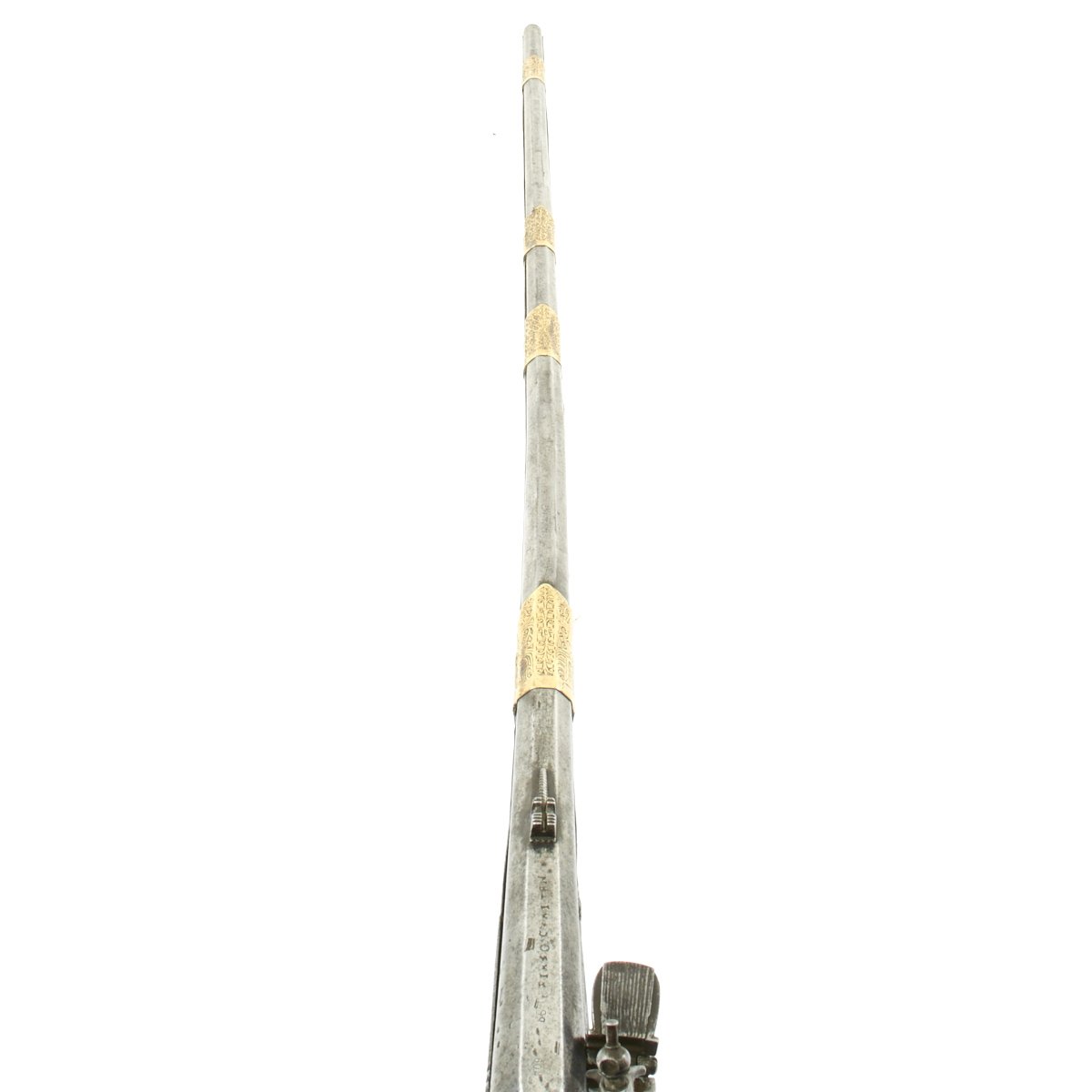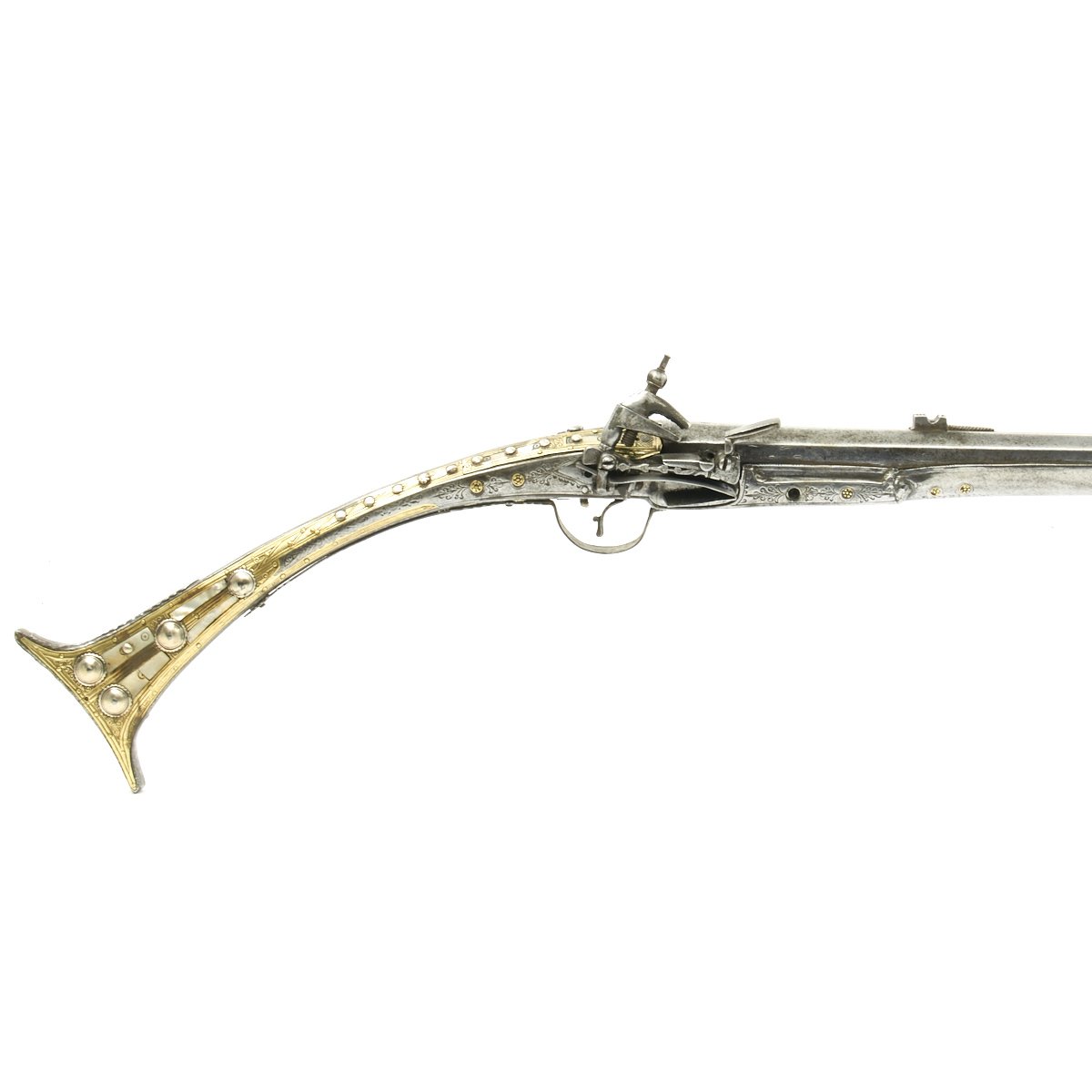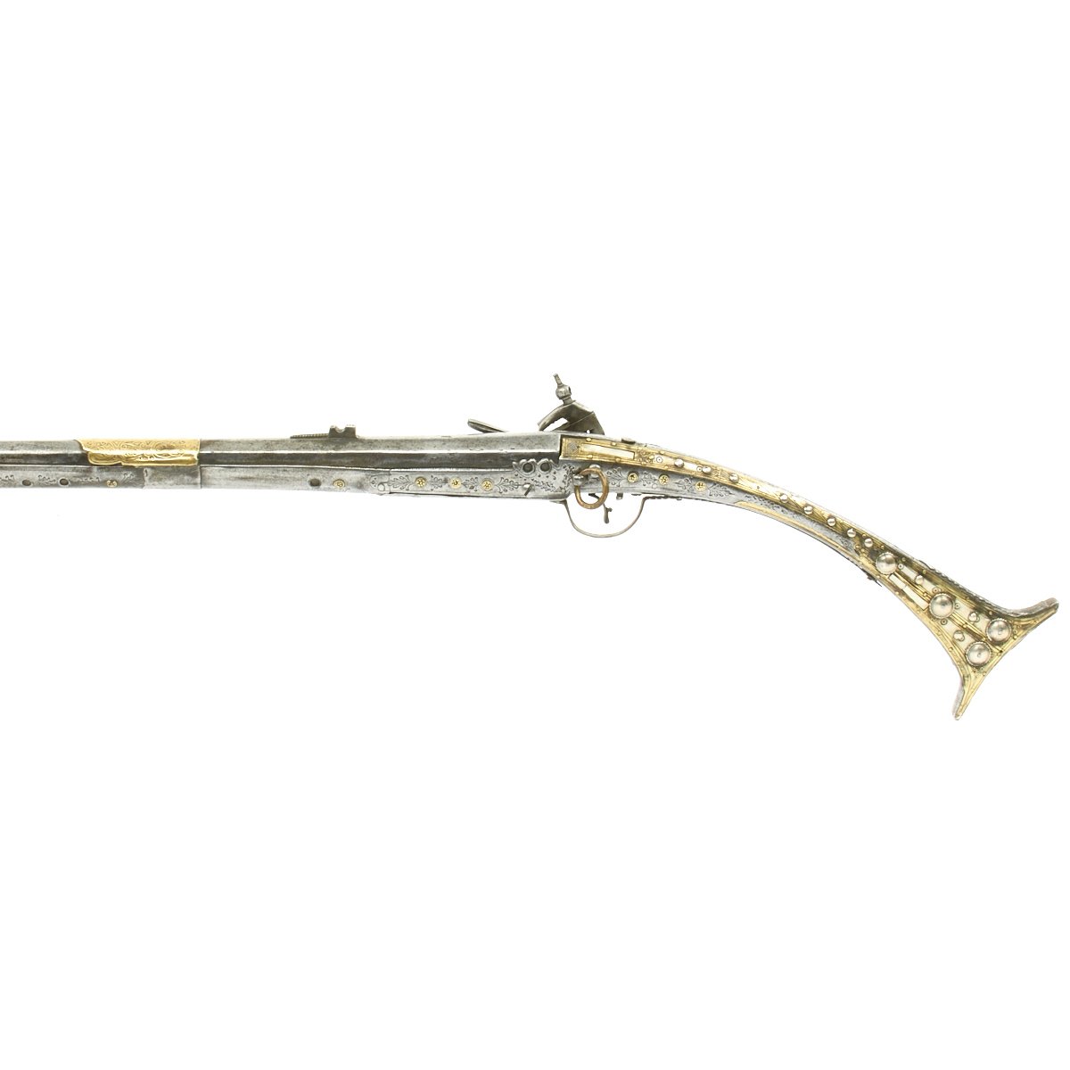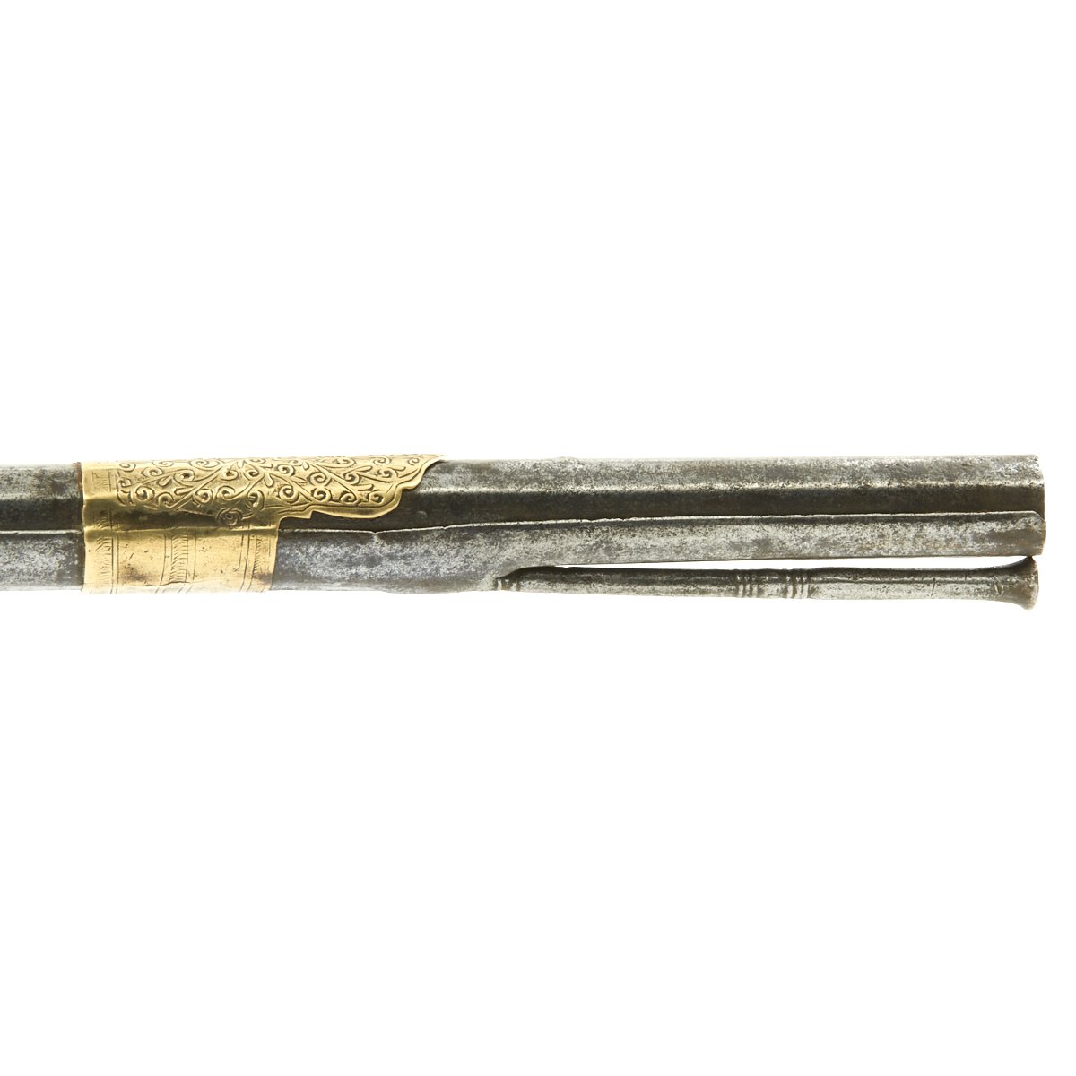 Measuring 66" in overall length, the barrel alone is 52" long. Complete with its original all steel ramrod this really is a truly excellent example of this very unusual weapon that plagued European travelers who ventured into that region of the Ottoman Empire.