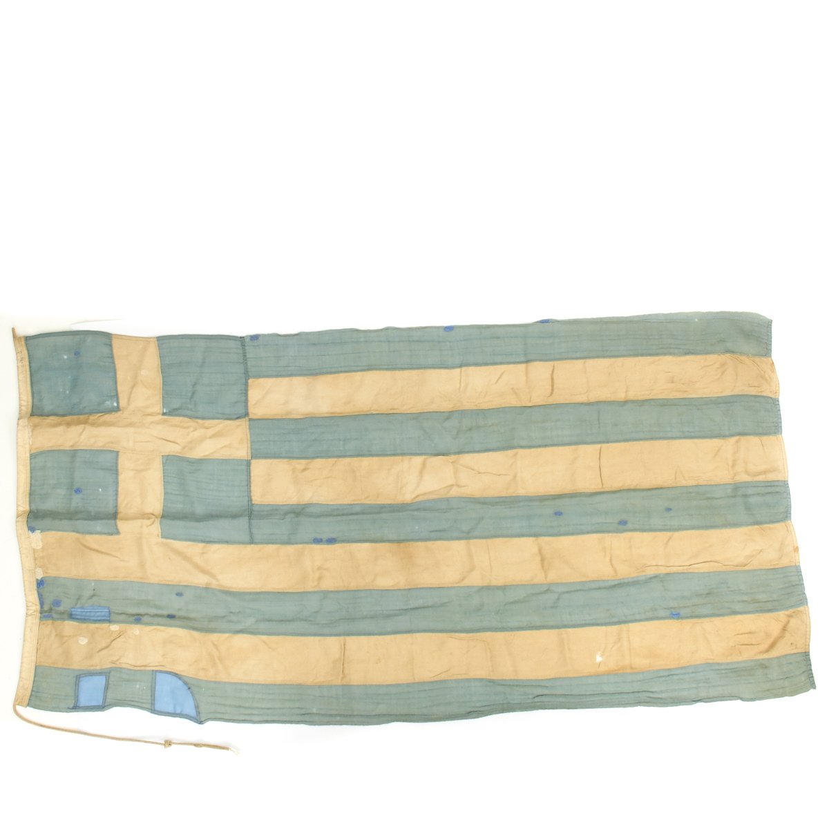 Original Item: Only One Available. Brought back by a USGI after WW2 this is an incredible genuine 1930s Greek Civil Ensign (now the National flag of Greece) in multi-piece wool construction that measures 69 inches x 33 inches (175 cm x 84 cm).