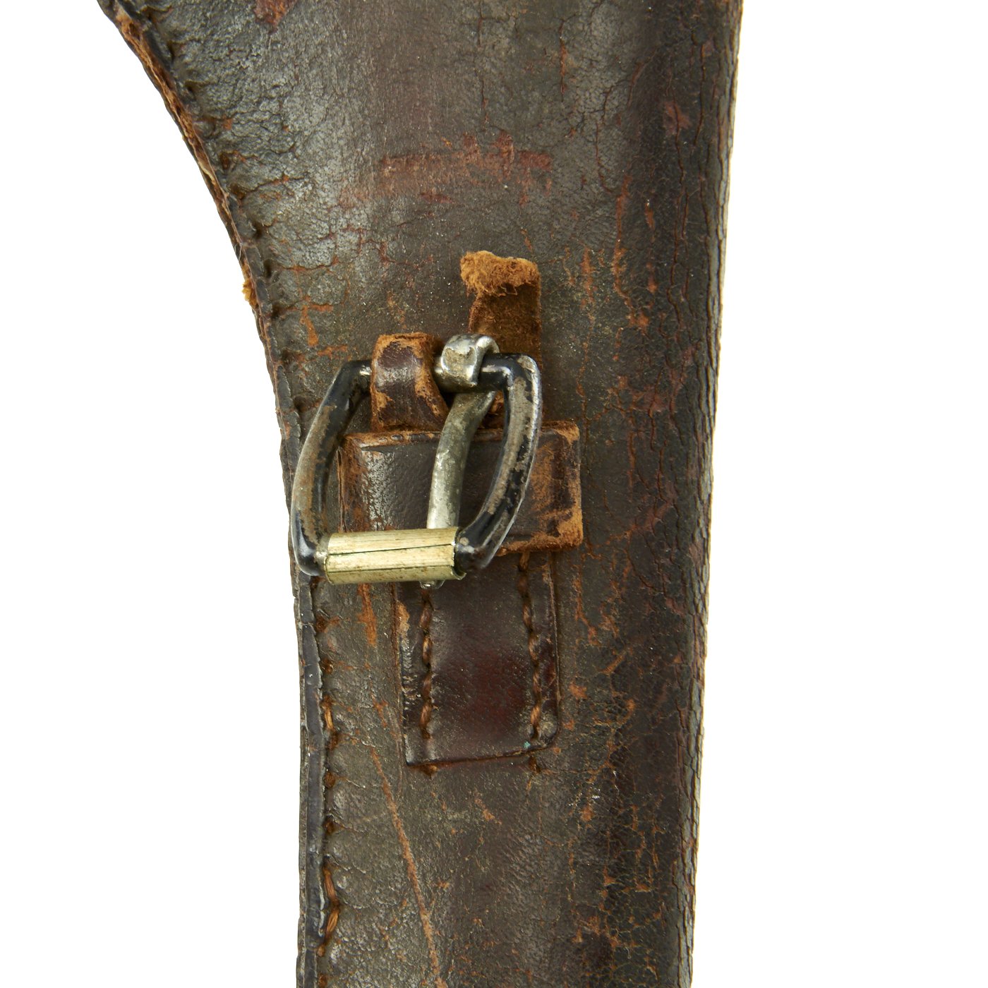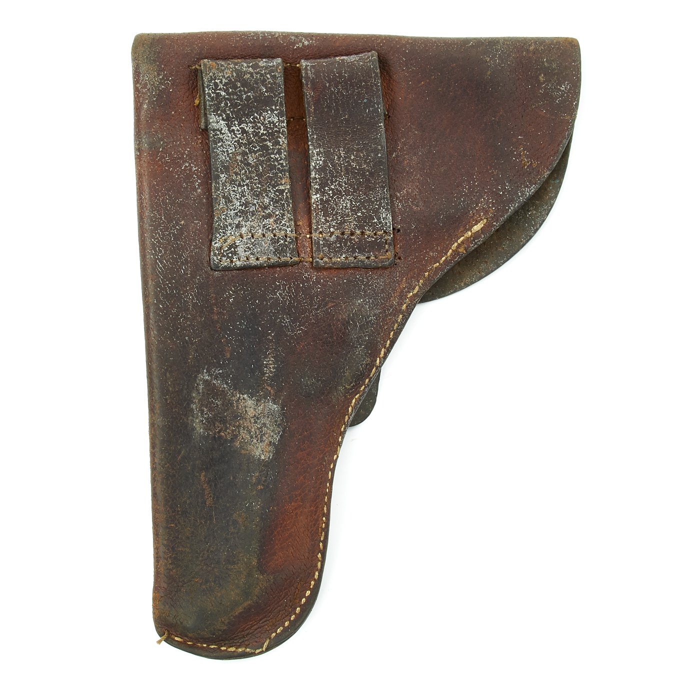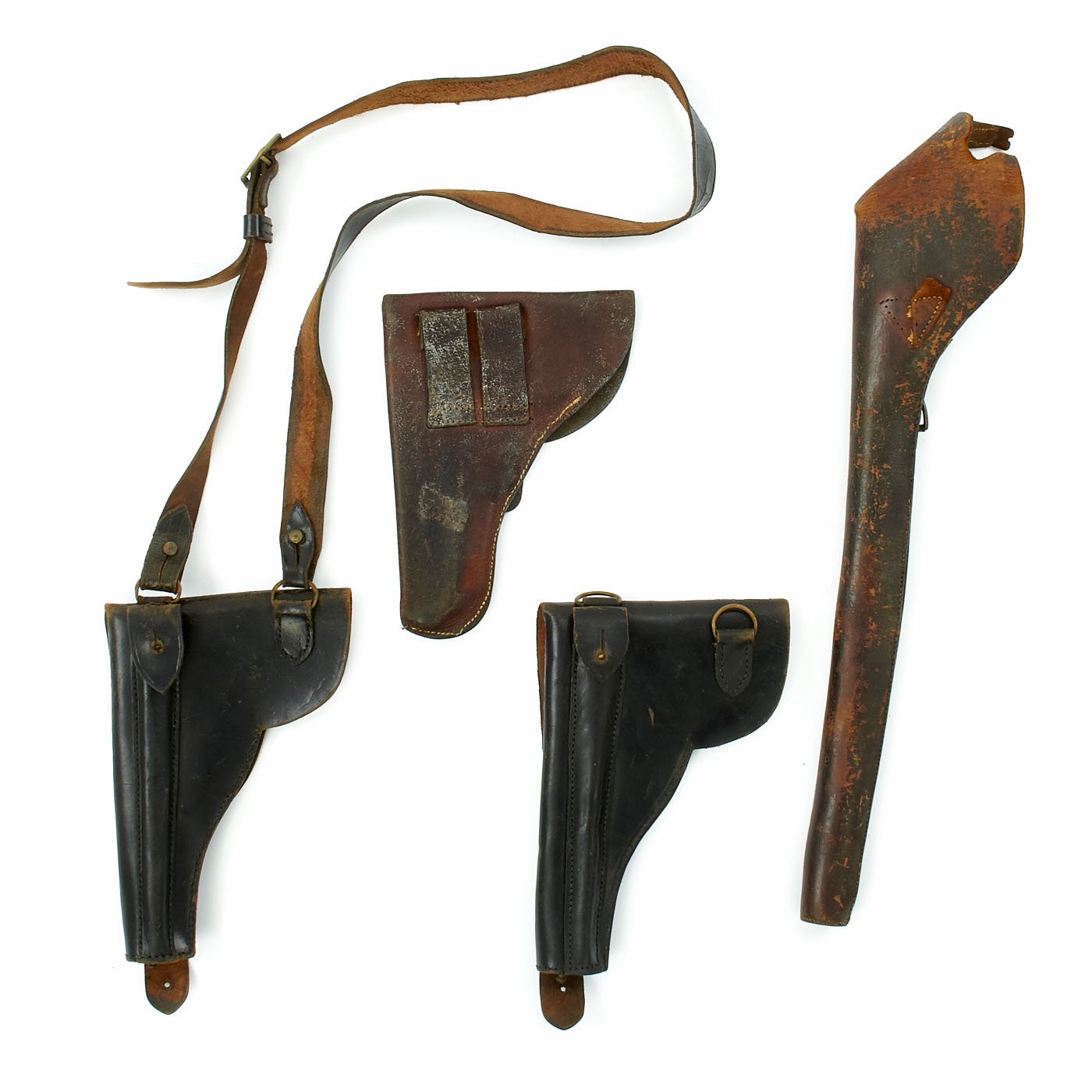 The holster second is WWII era, probably 9mm or 9mm largo pistol flap top brown leather holster.