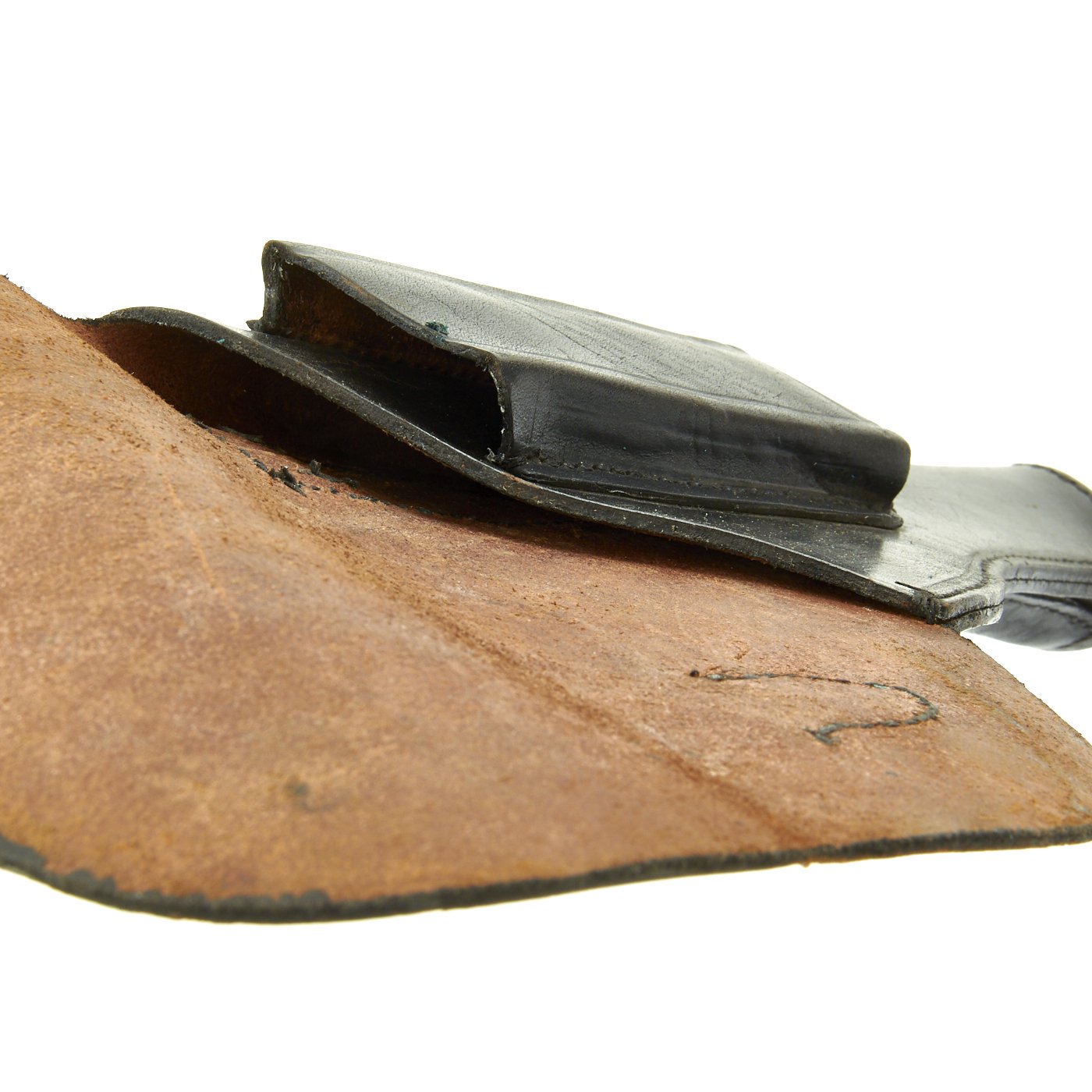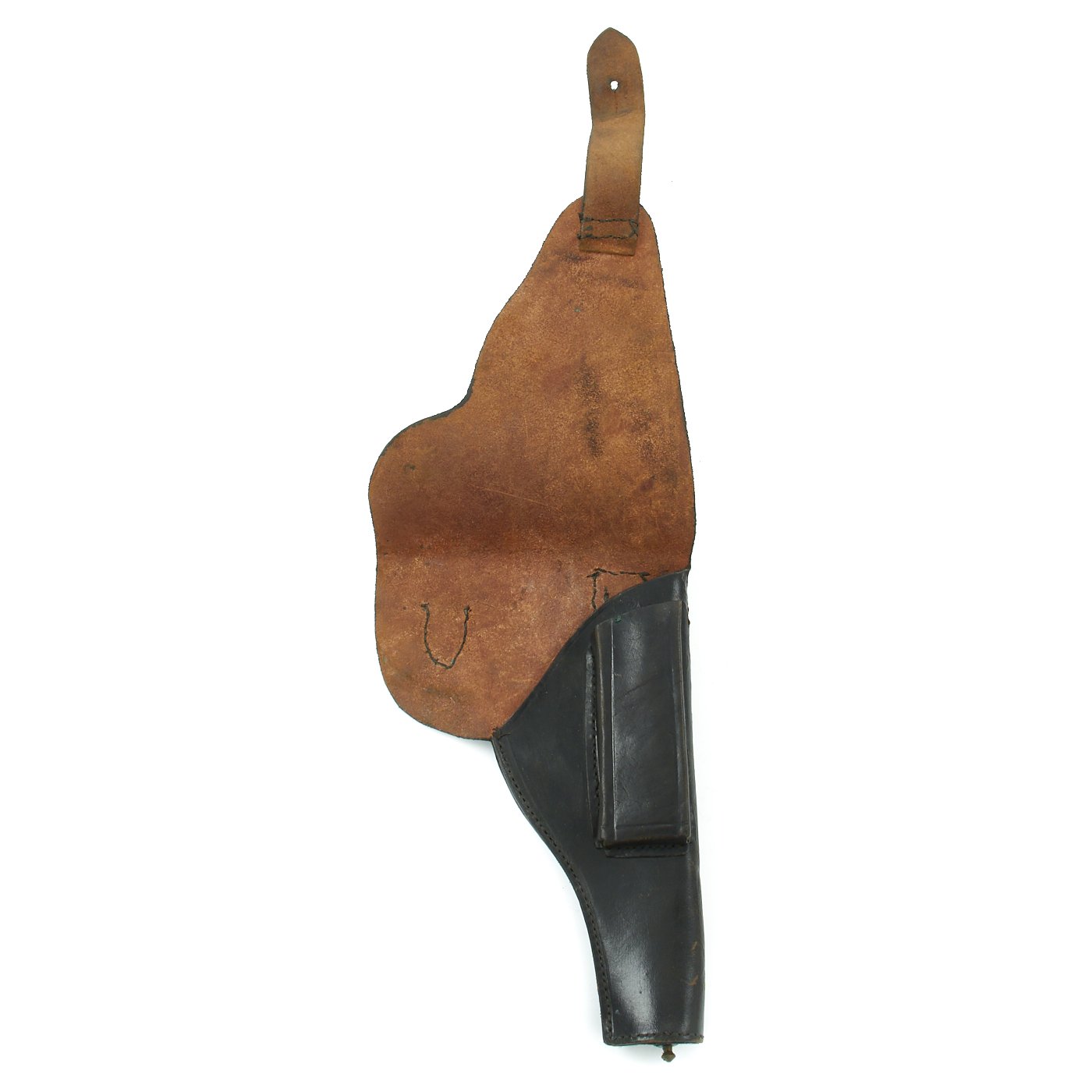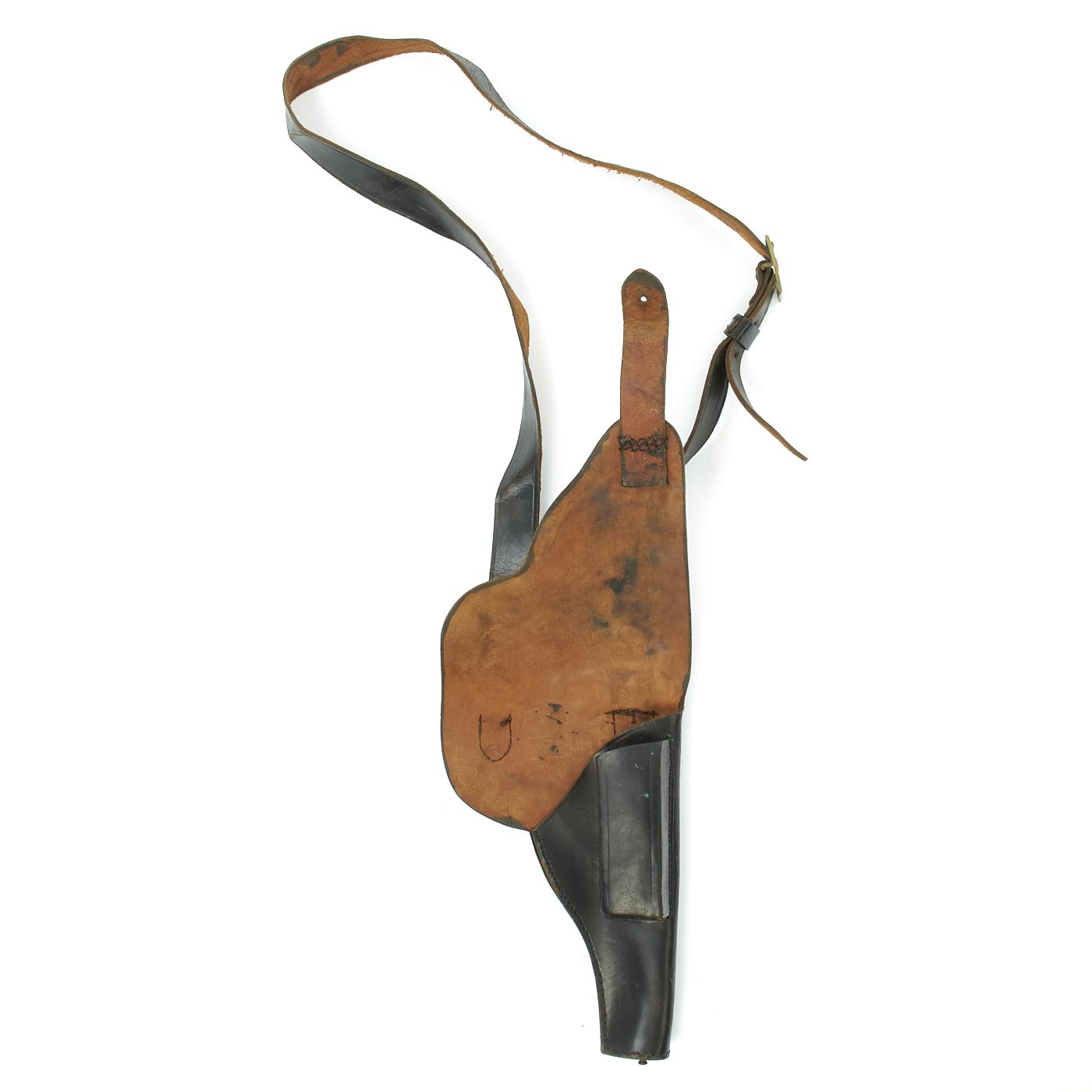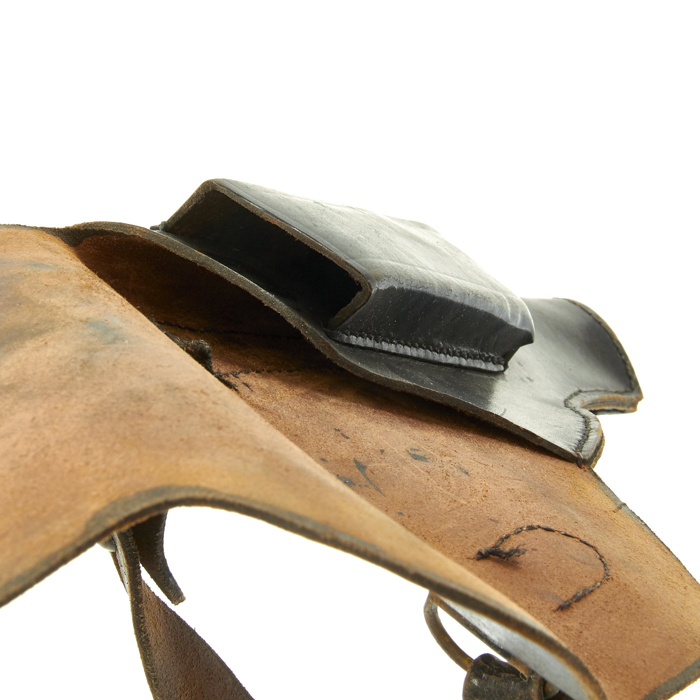 The final two could be late WWII or early Cold War black leather holsters, one of which has a body strap attached to the back loops. They are otherwise identical in design. These have full front leather cover, a spare magazine pocket and a cleaning rod pocket, all empty we're afraid.