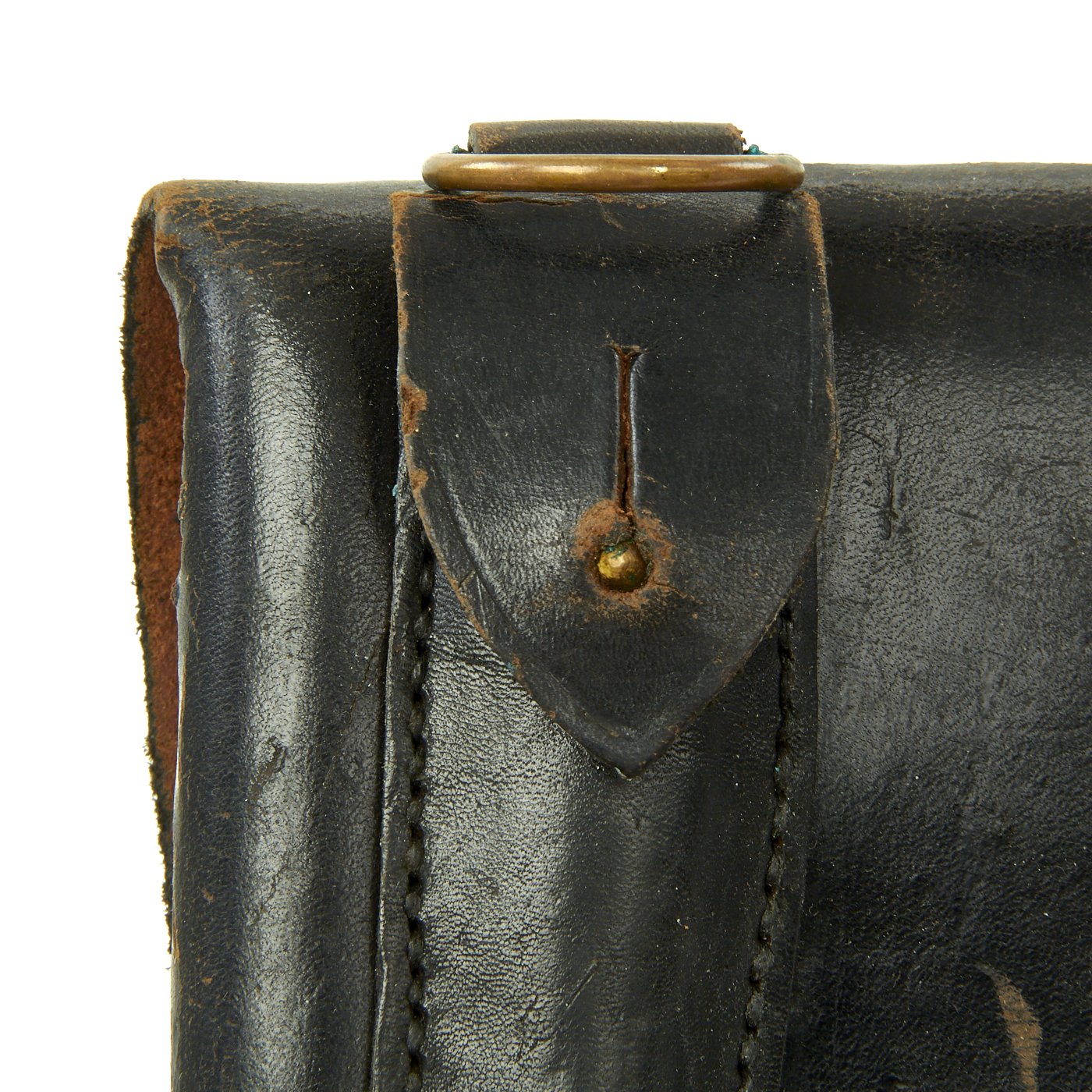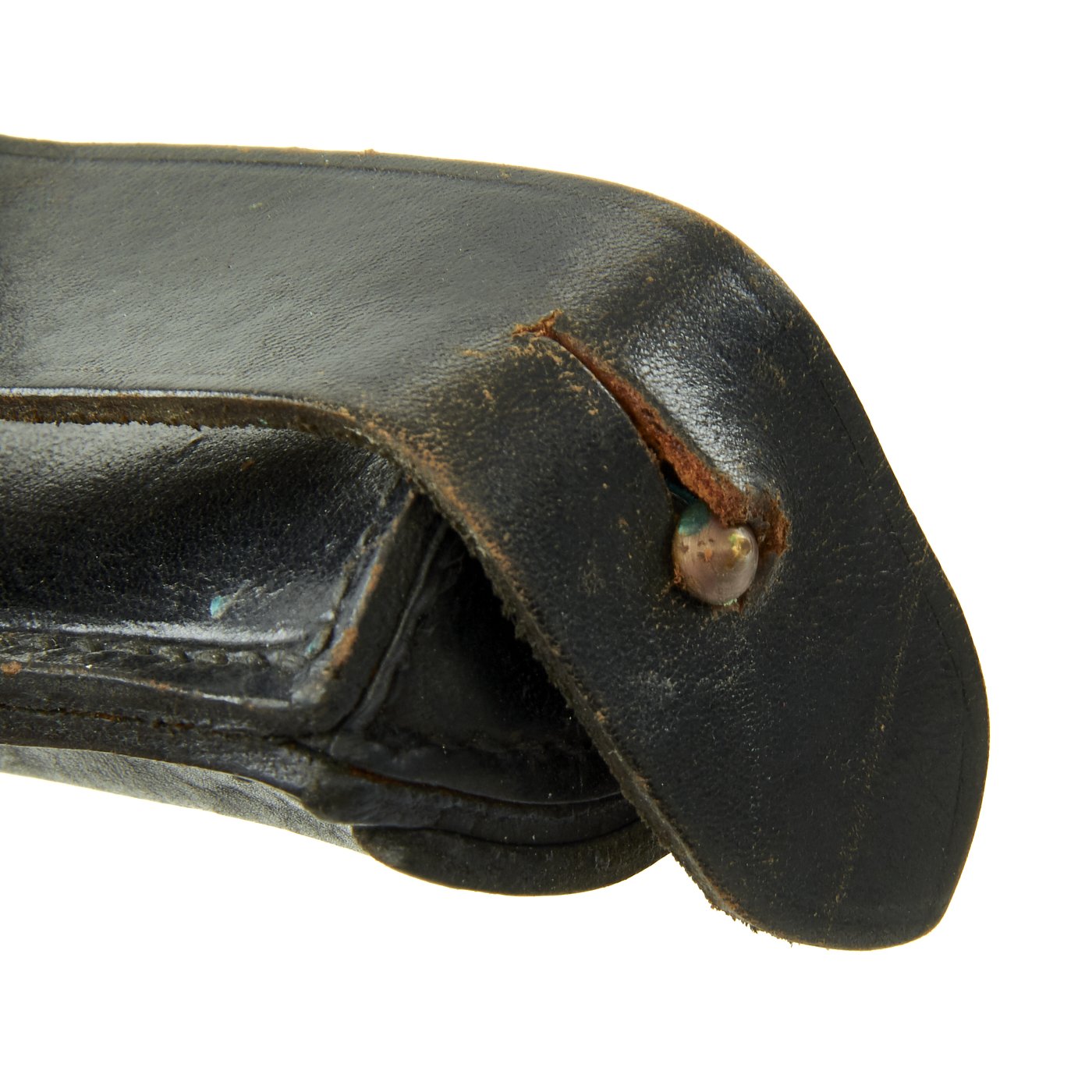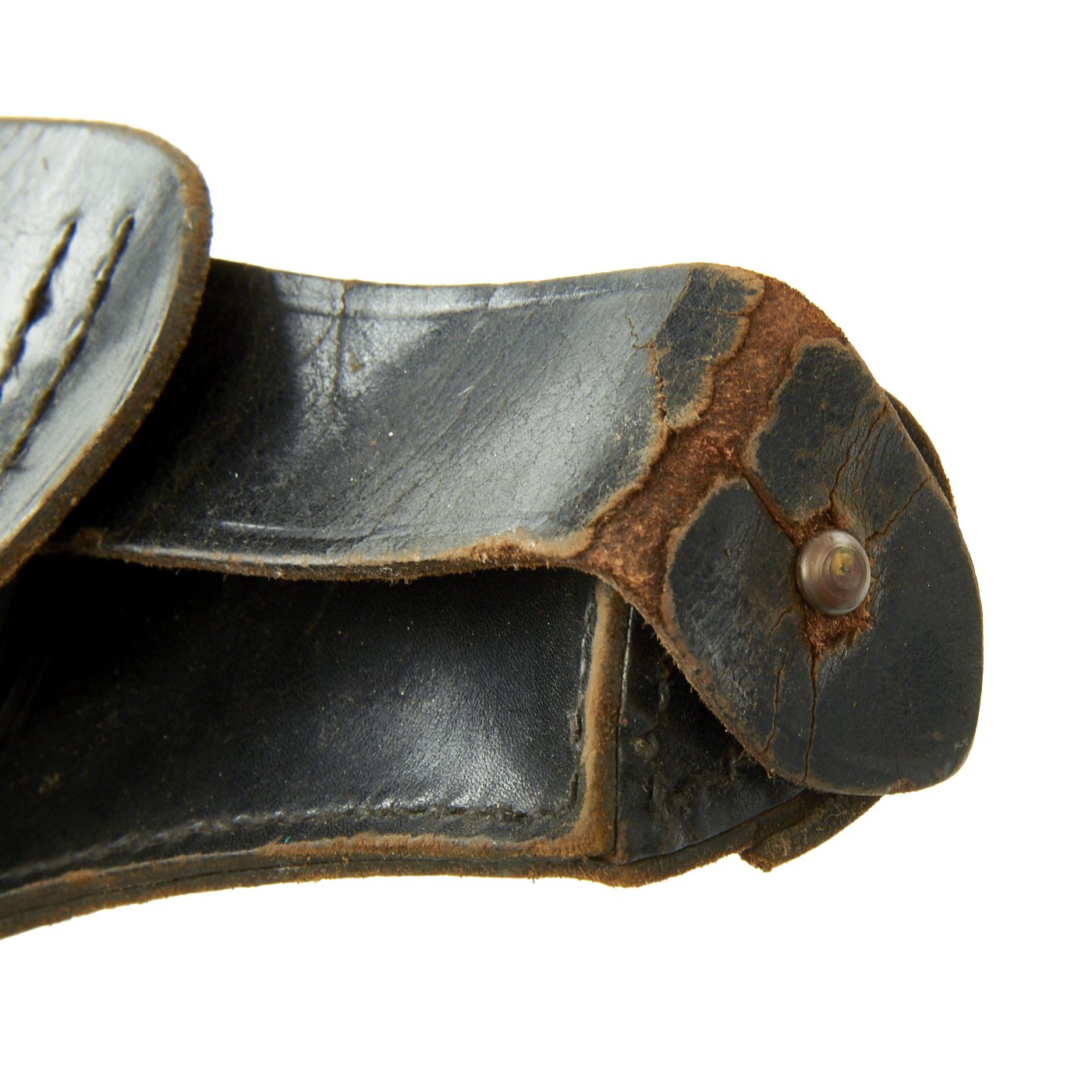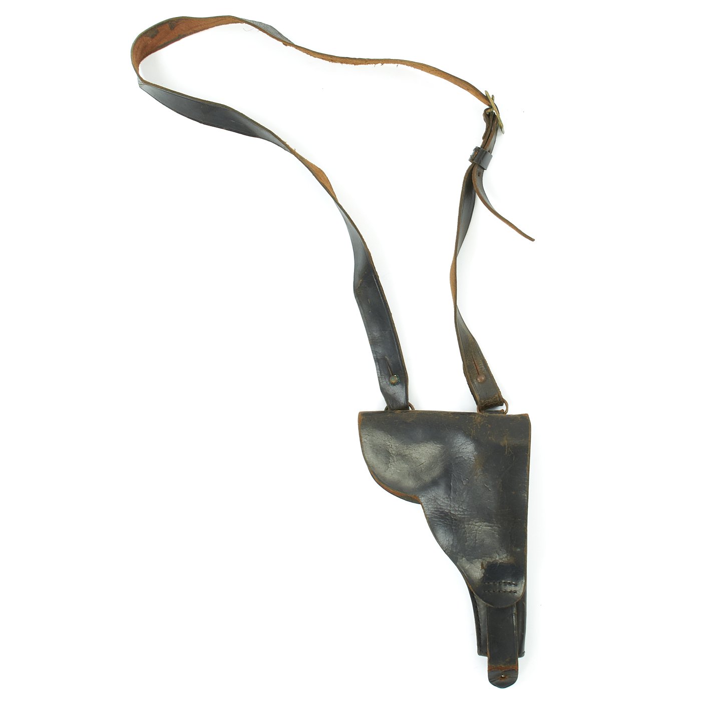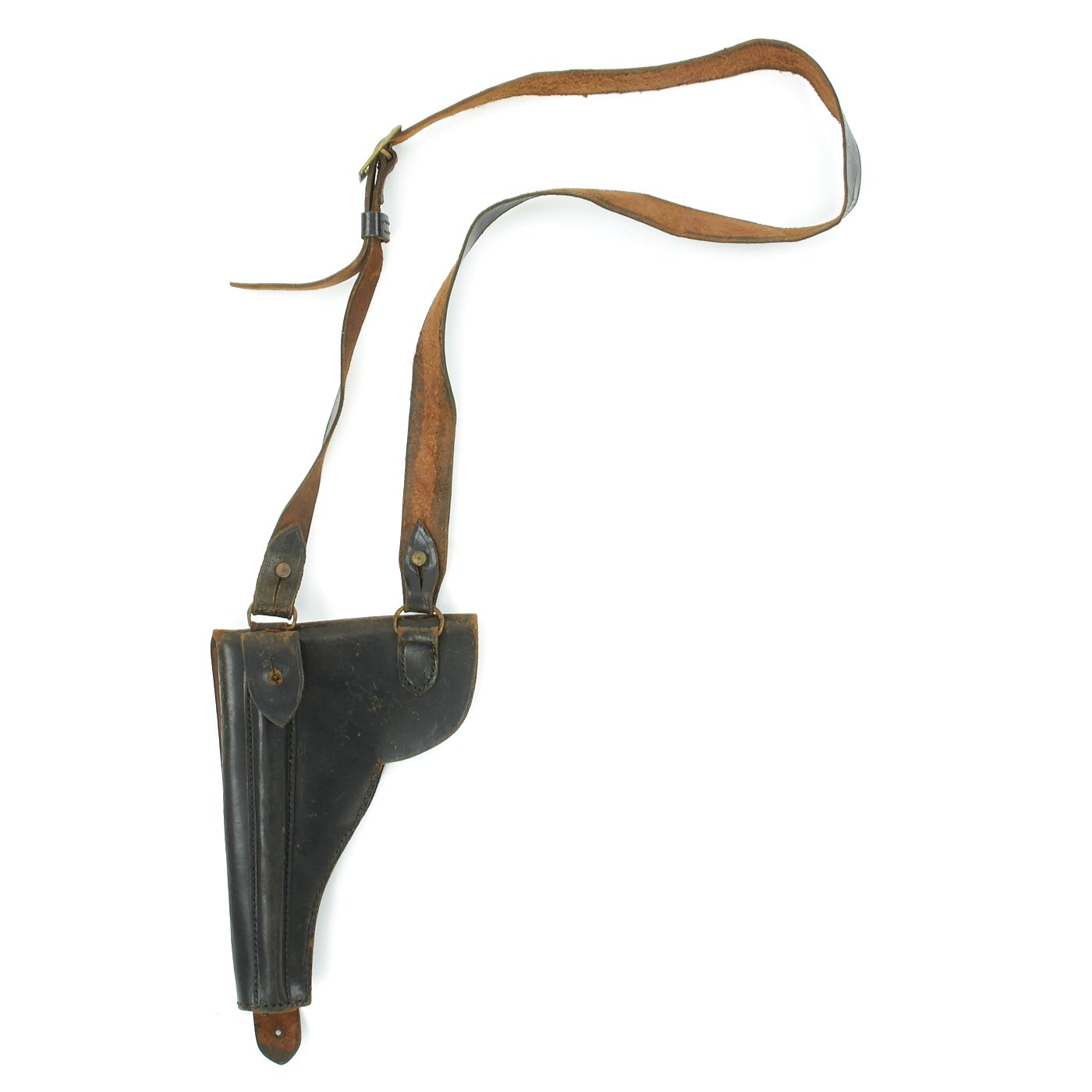 The final two could be late WWII or early Cold War black leather holsters, one of which has a body strap attached to the back loops. They are otherwise identical in design. These have full front leather cover, a spare magazine pocket and a cleaning rod pocket, all empty we're afraid.