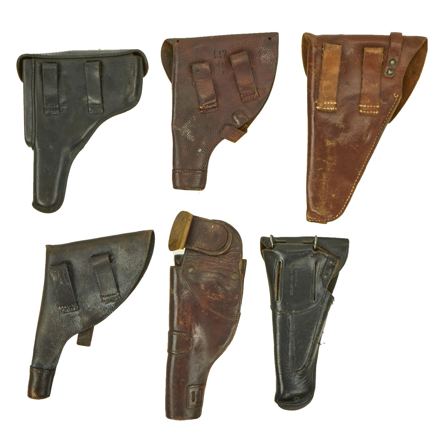 Original Items: One group of six only. This is a very nice group of six military leather holsters, all of which are in basically good serviceable condition, dating from the early 20th century up into the 1970s.