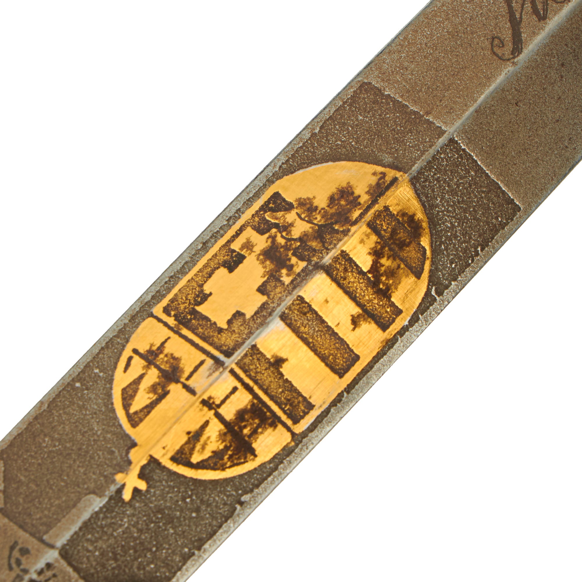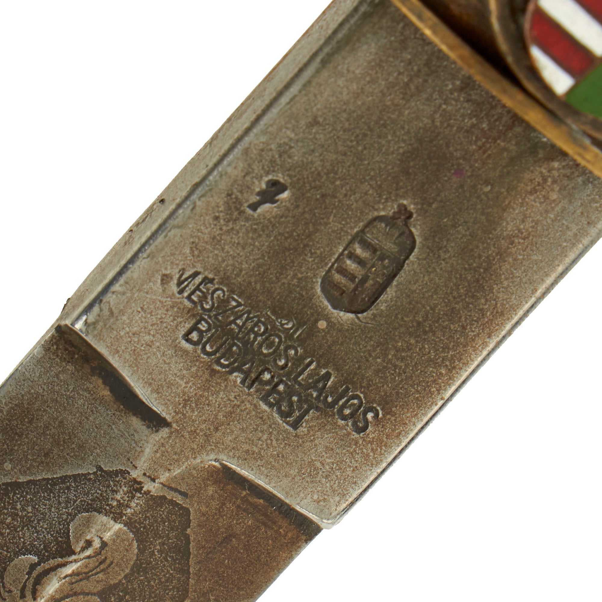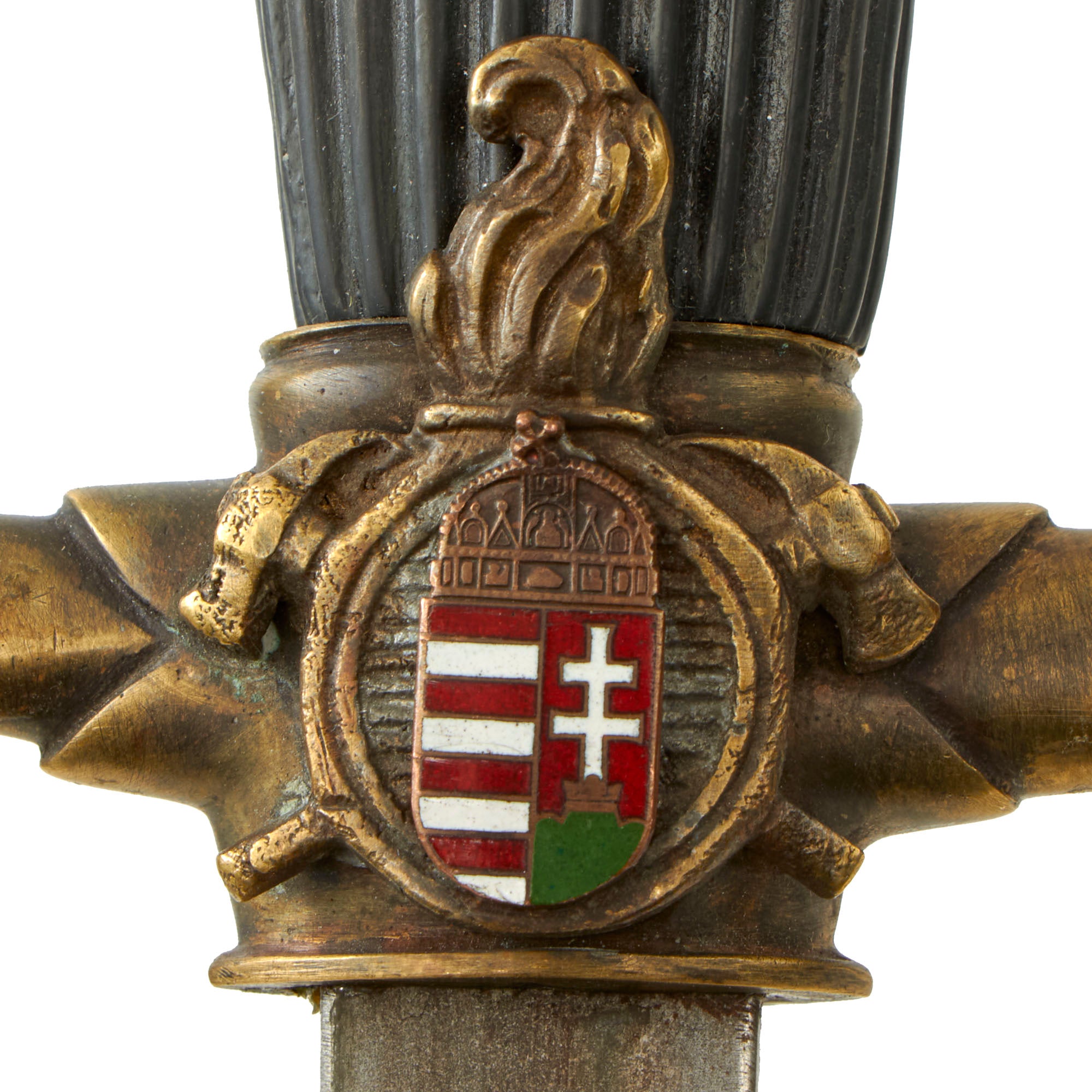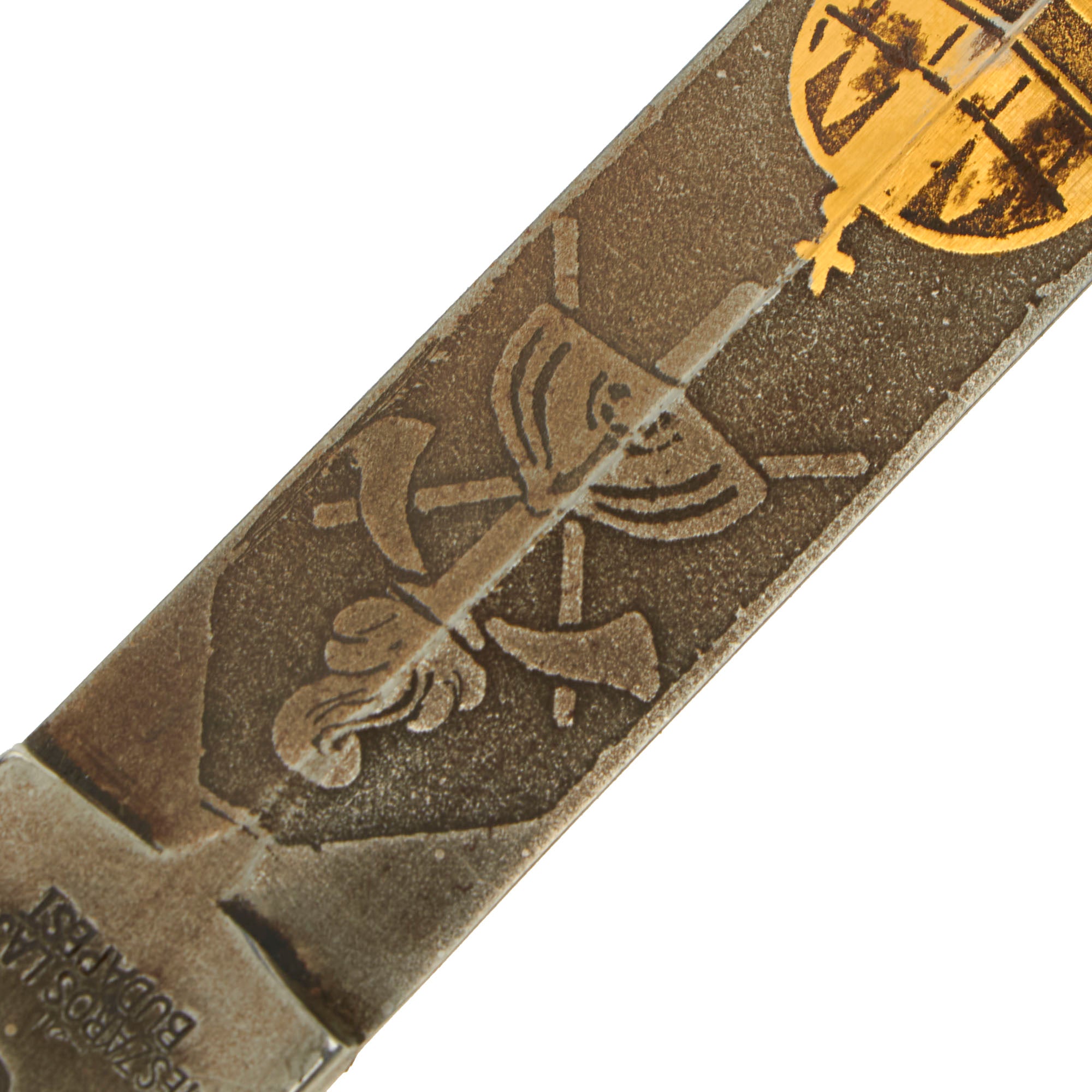 The dagger has a lovely “Skull Cap” style helmet pommel, ribbed black bakelite grip, and brass crossguard featuring the Hungarian Coat of Arms on top of the “crossed hammers” insignia for firefighters. The hilt has a scabbard release button on the opposite side from the guard. The 8 7/8" blade has a lovely “gold” inlay of the Hungarian Coat of Arms and a regular etched insignia of the Fire Services. Lower down on the blade towards the tip, there appears to be a title, name and a partial (193[?]) date. We believe this to be either an early Pre War era blade or an extremely early war example.