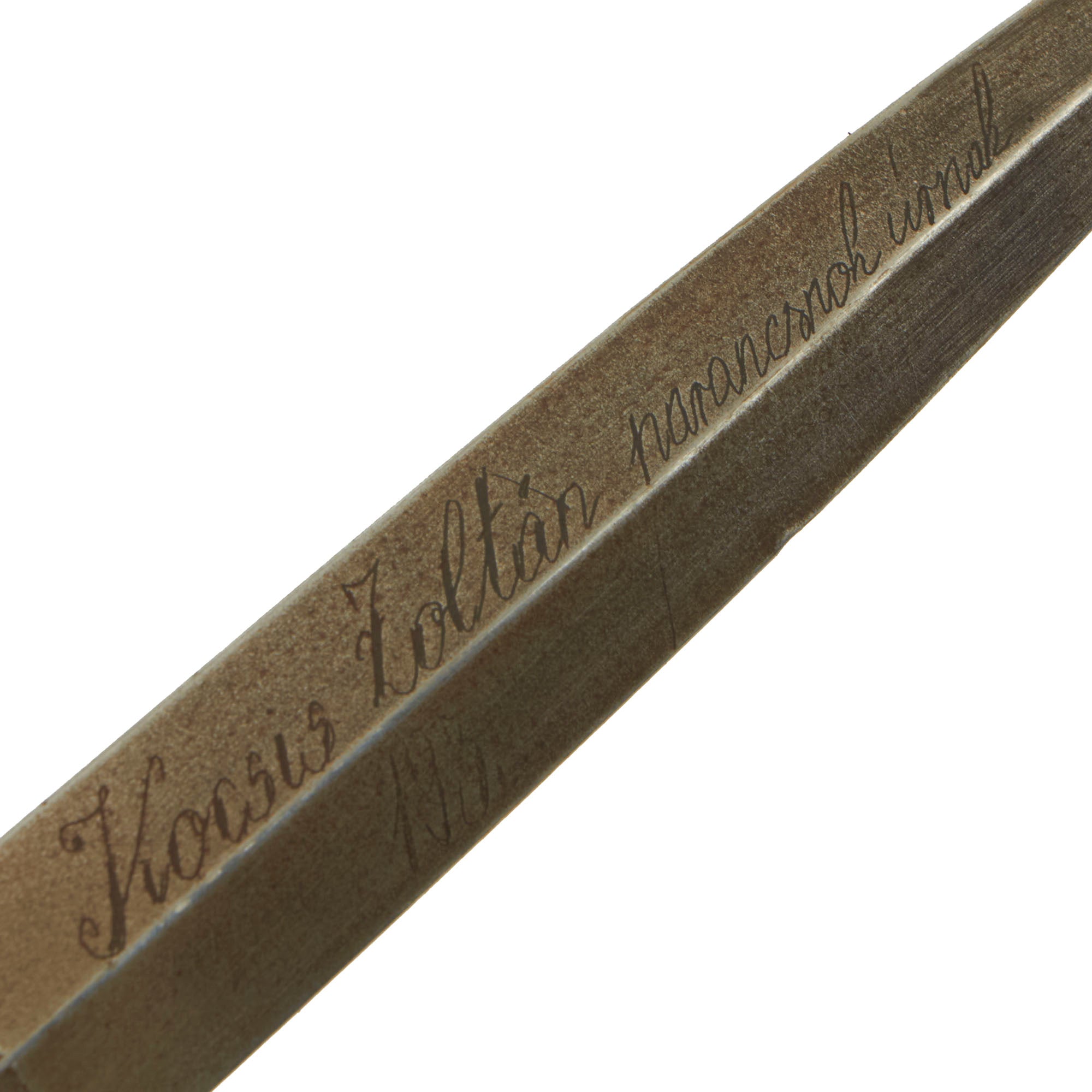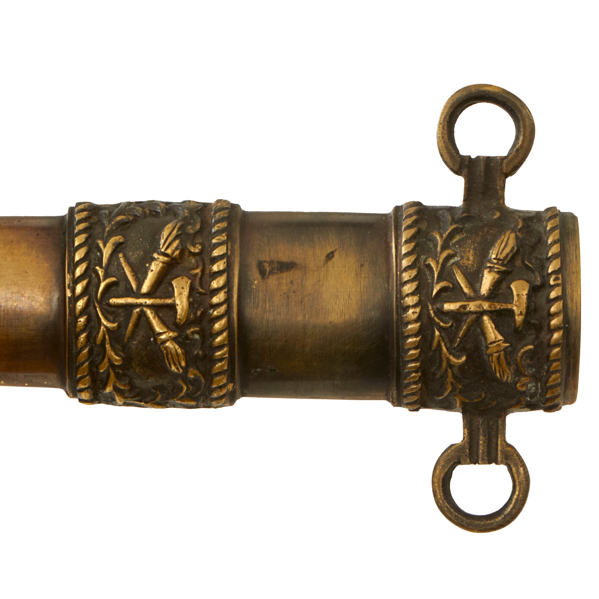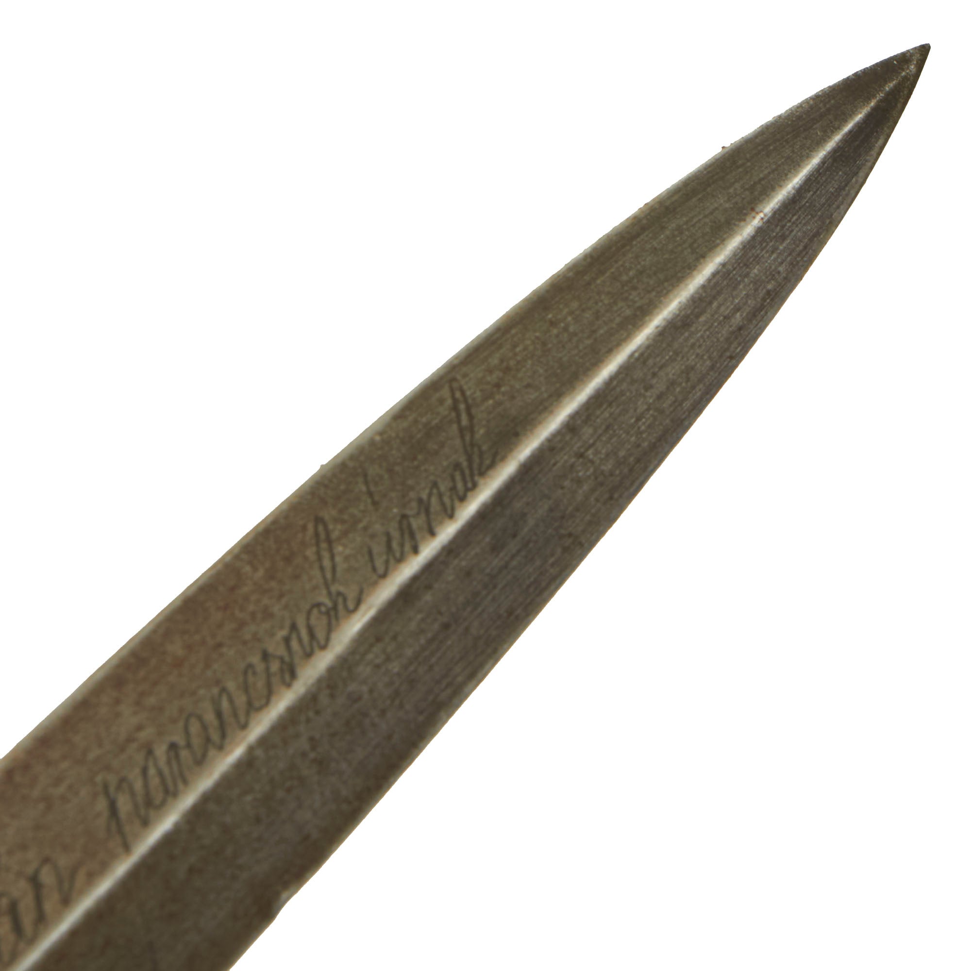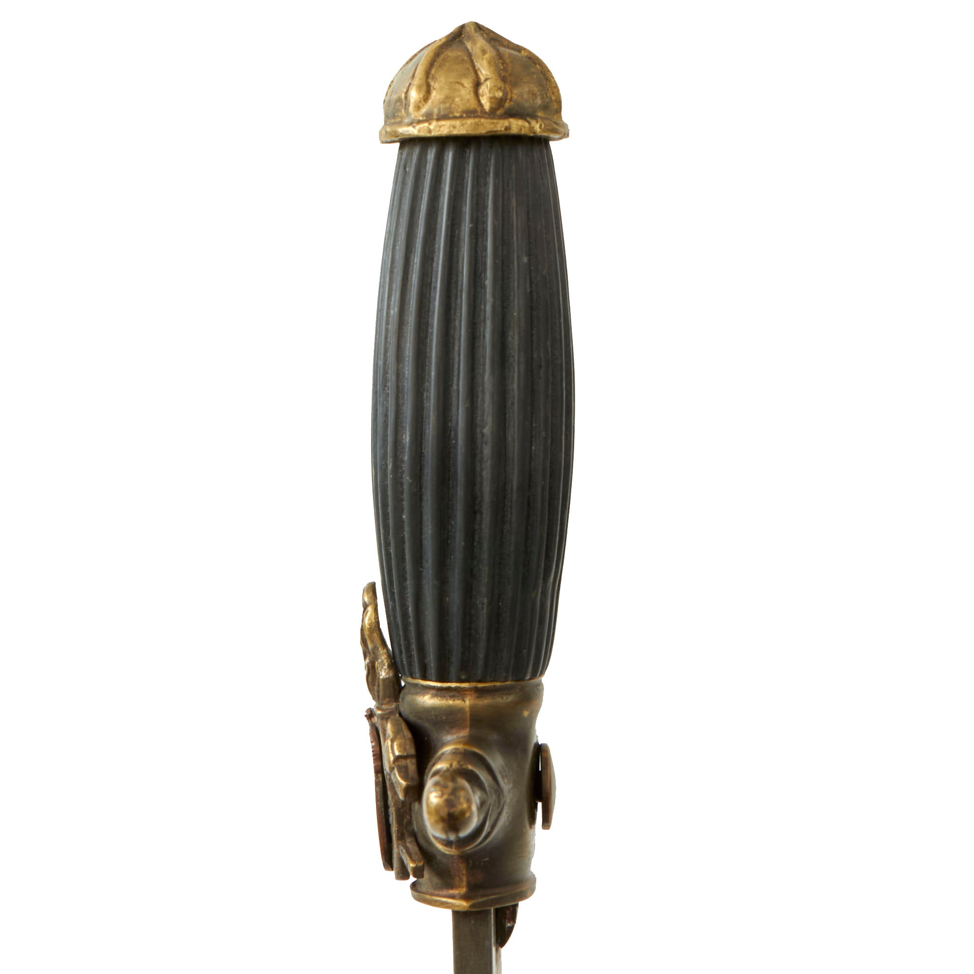 The dagger has a lovely “Skull Cap” style helmet pommel, ribbed black bakelite grip, and brass crossguard featuring the Hungarian Coat of Arms on top of the “crossed hammers” insignia for firefighters. The hilt has a scabbard release button on the opposite side from the guard. The 8 7/8" blade has a lovely “gold” inlay of the Hungarian Coat of Arms and a regular etched insignia of the Fire Services. Lower down on the blade towards the tip, there appears to be a title, name and a partial (193[?]) date. We believe this to be either an early Pre War era blade or an extremely early war example.