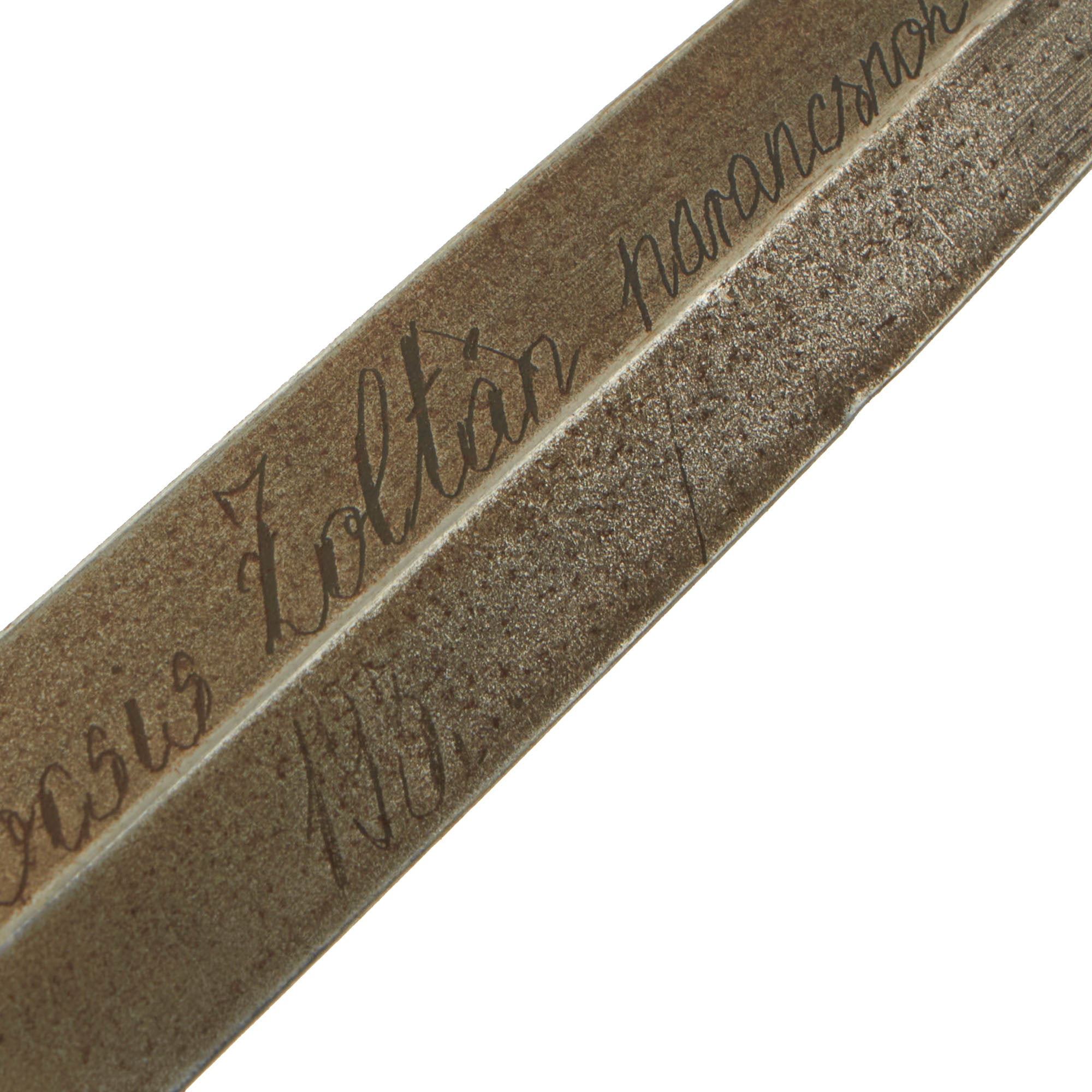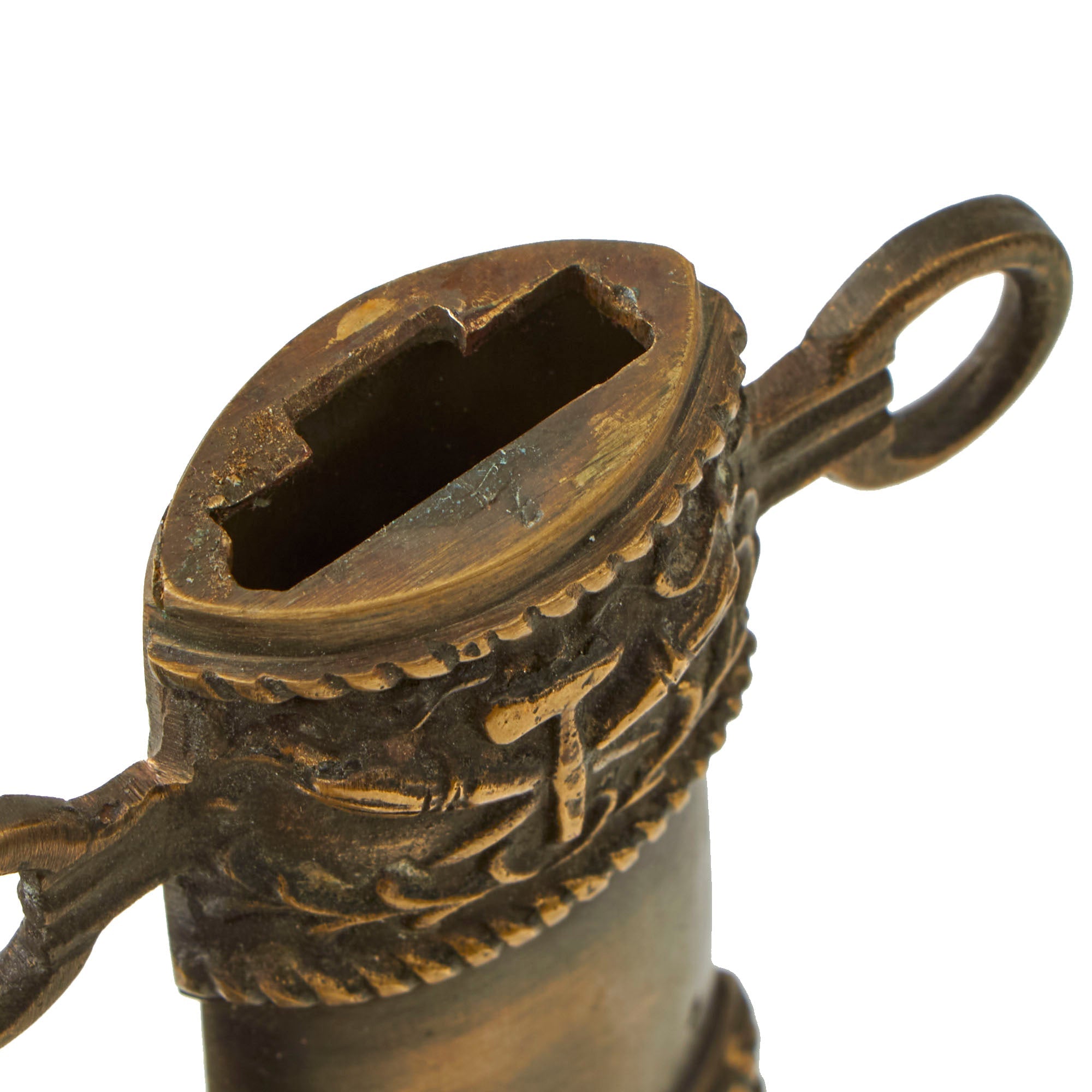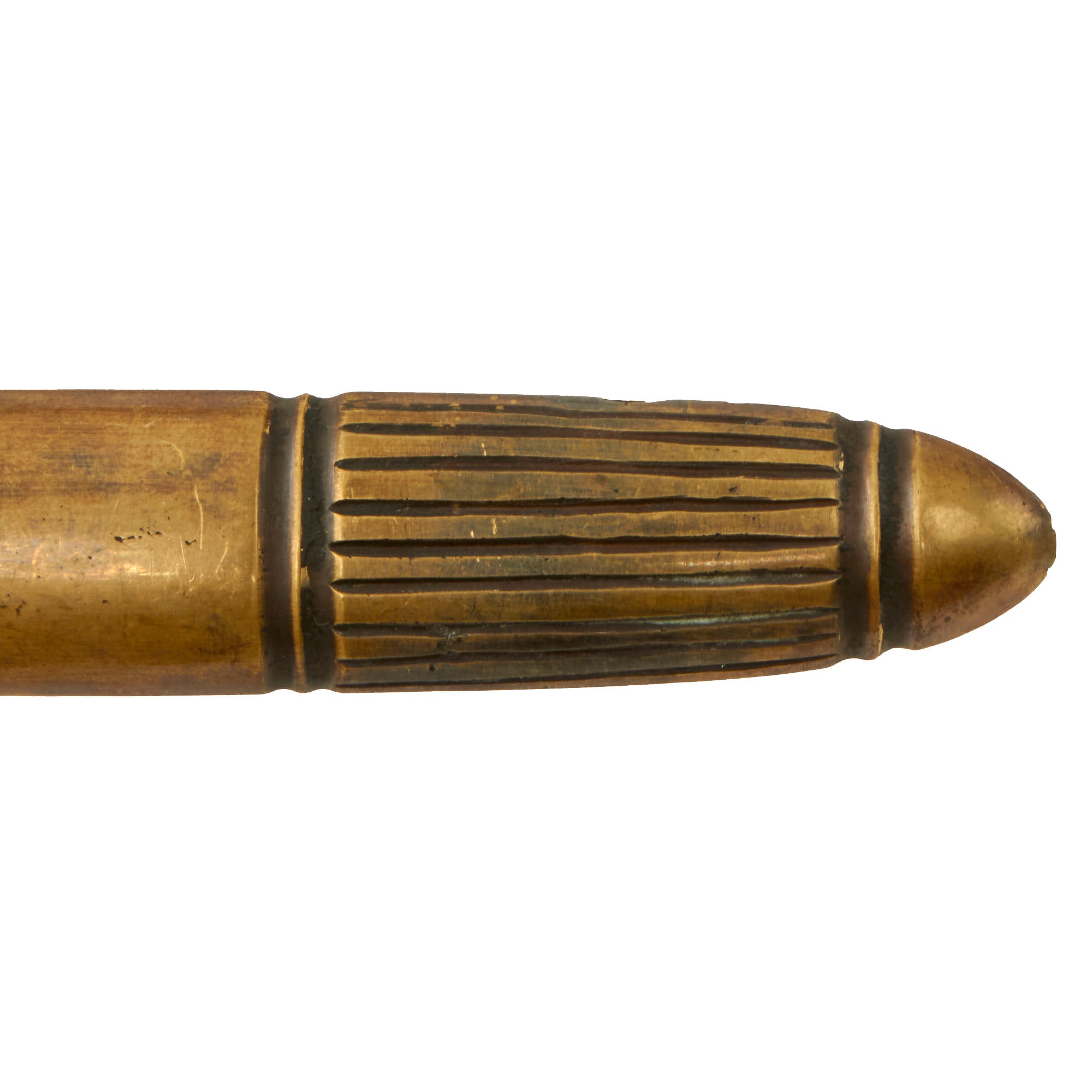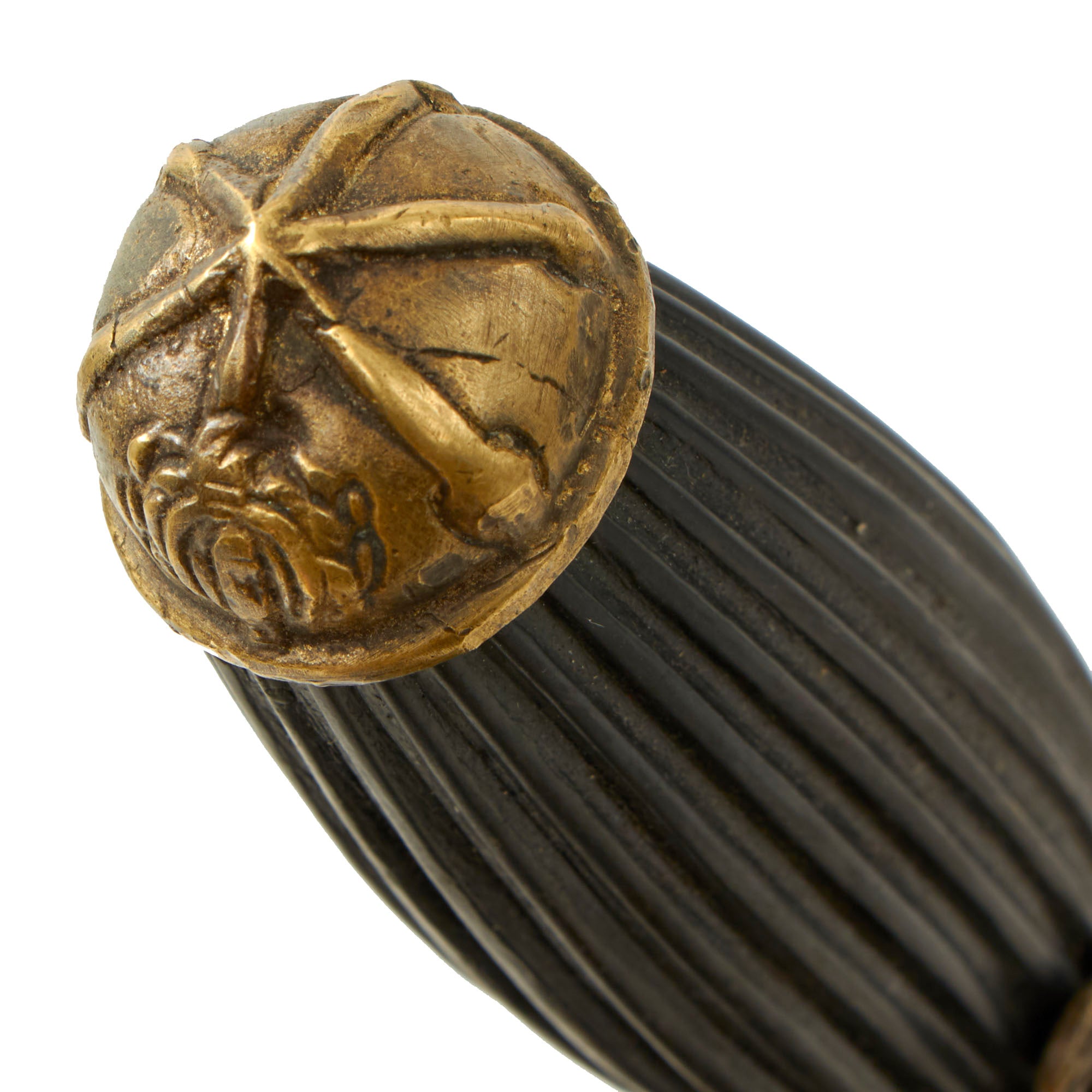 The dagger has a lovely “Skull Cap” style helmet pommel, ribbed black bakelite grip, and brass crossguard featuring the Hungarian Coat of Arms on top of the “crossed hammers” insignia for firefighters. The hilt has a scabbard release button on the opposite side from the guard. The 8 7/8" blade has a lovely “gold” inlay of the Hungarian Coat of Arms and a regular etched insignia of the Fire Services. Lower down on the blade towards the tip, there appears to be a title, name and a partial (193[?]) date. We believe this to be either an early Pre War era blade or an extremely early war example.