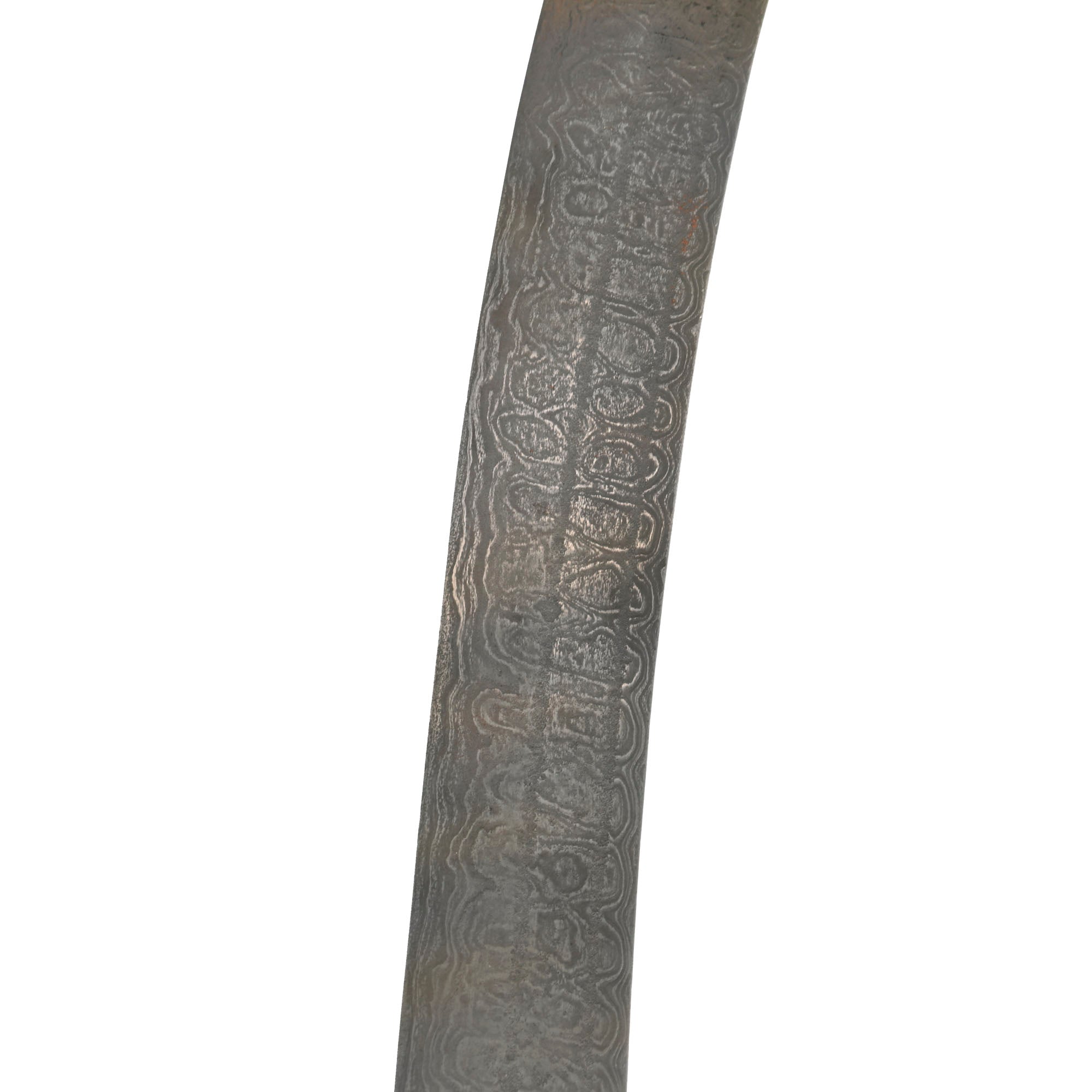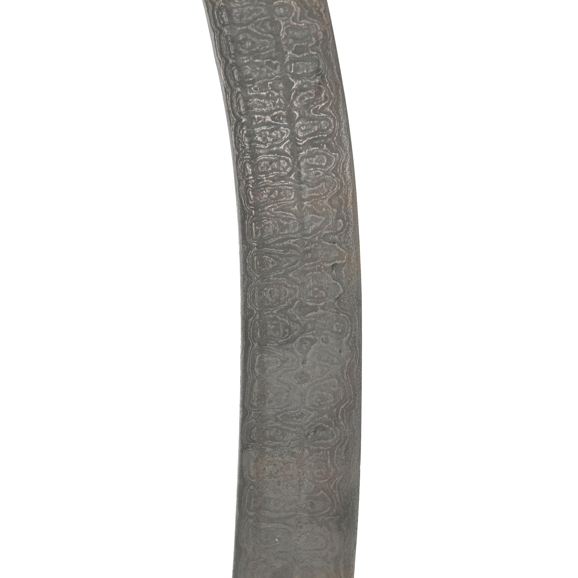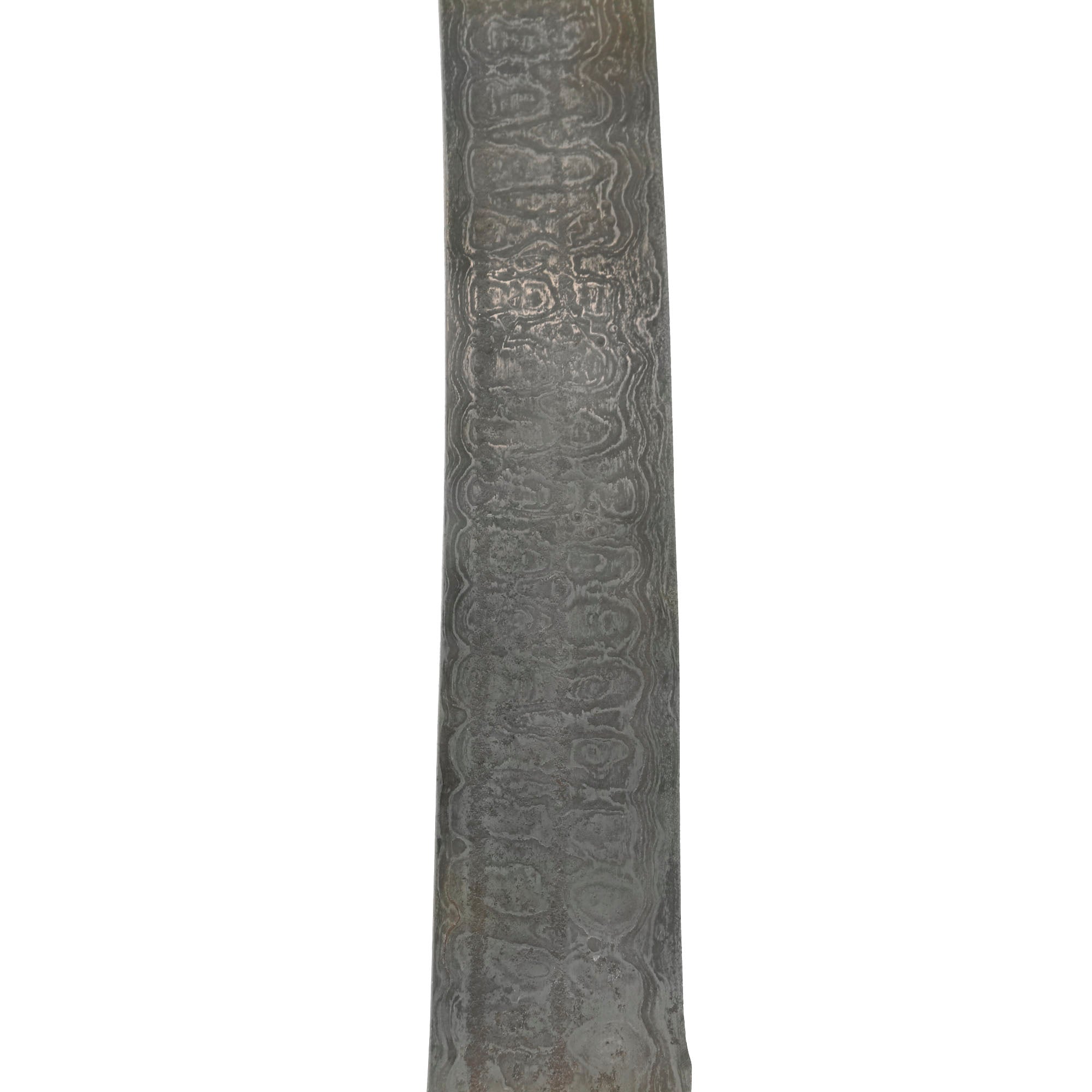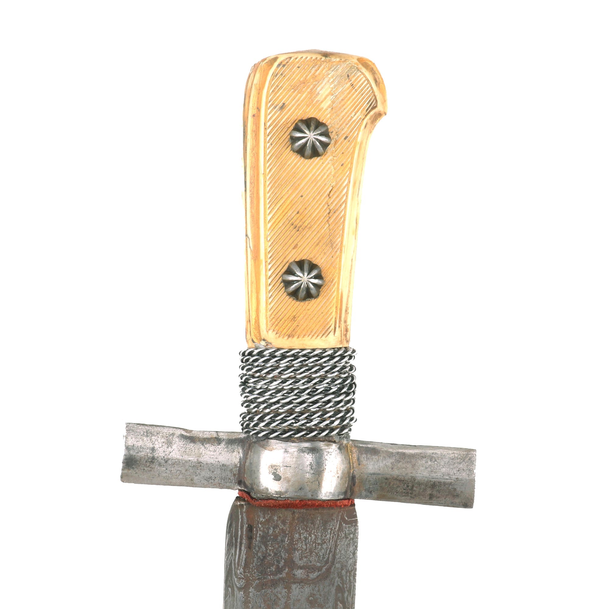 This is a gorgeous 17th Century Magnate’s sword, almost certainly of Hungarian or Polish origin, with a carved ivory grip bolstered at the hilt by silver wrap, with a gorgeous 26½” heavily-curved Eastern Pattern Welded Damascus blade, which has retained its gorgeous pattern very well. There is a small bit of the leather blade washer still retained on the crossguard. The ivory grip is studded with silver and has a lovely pattern.