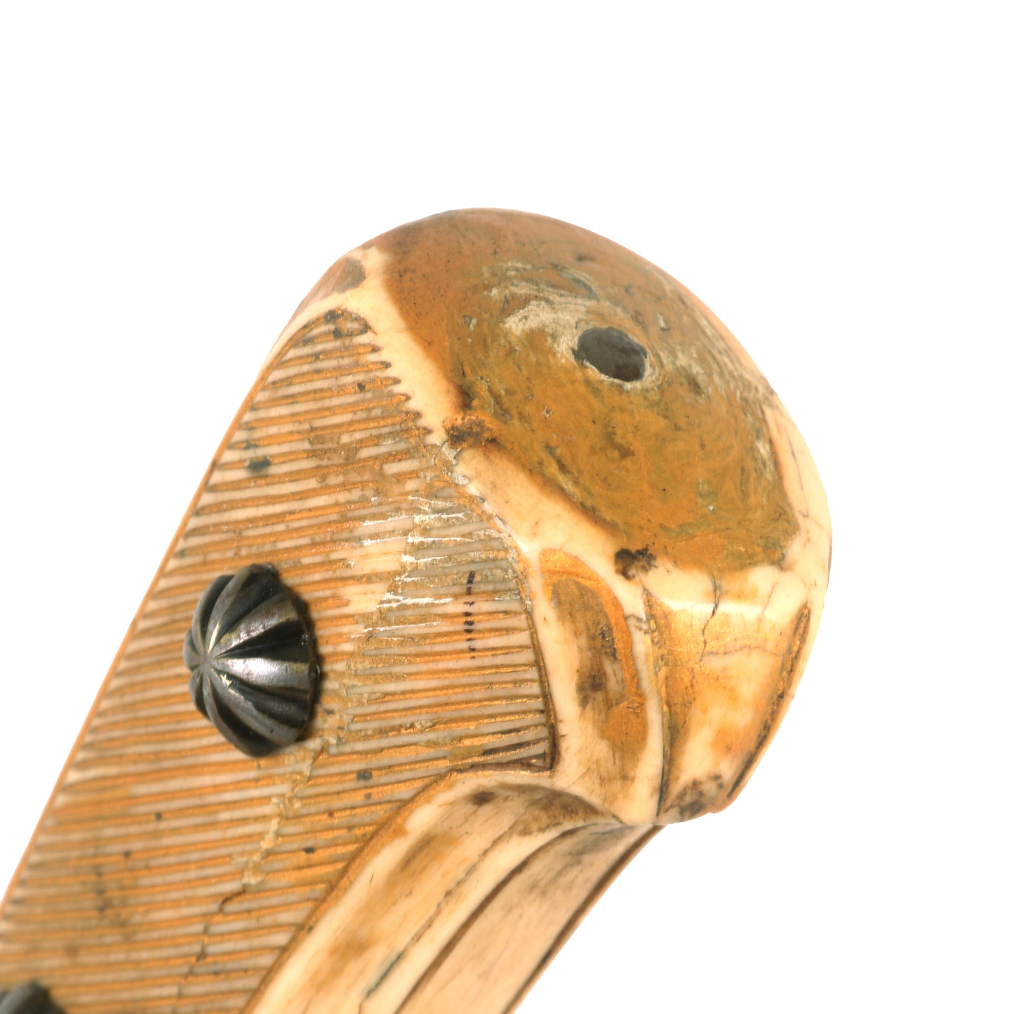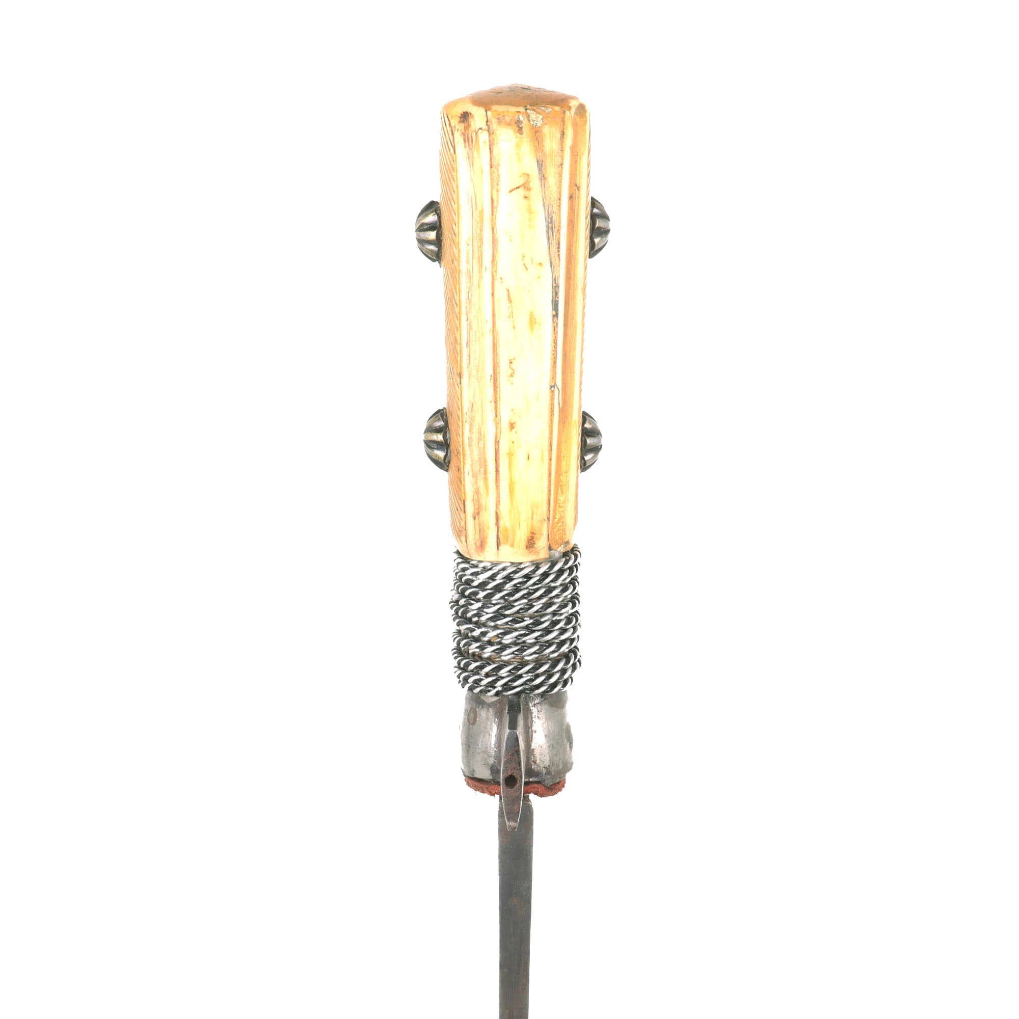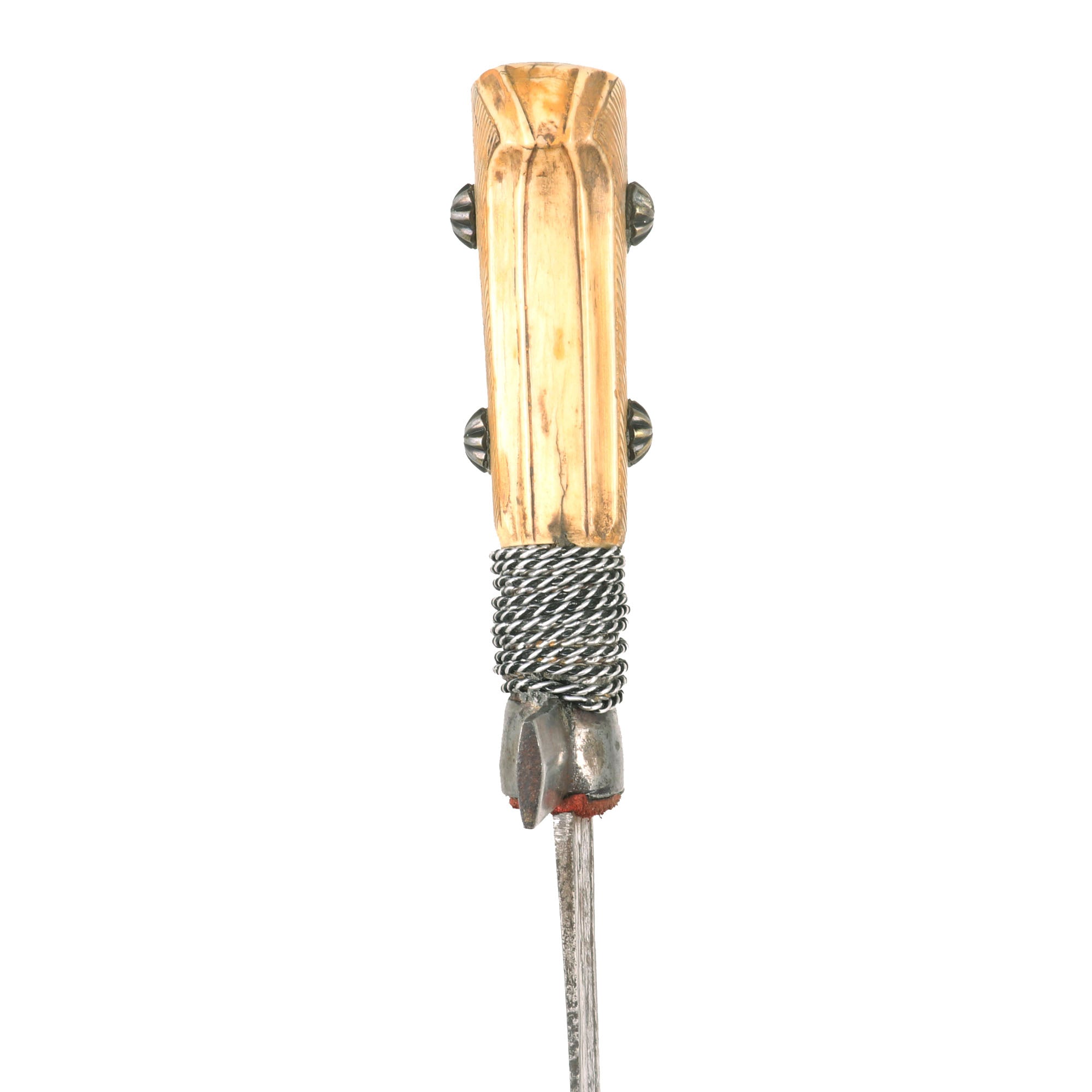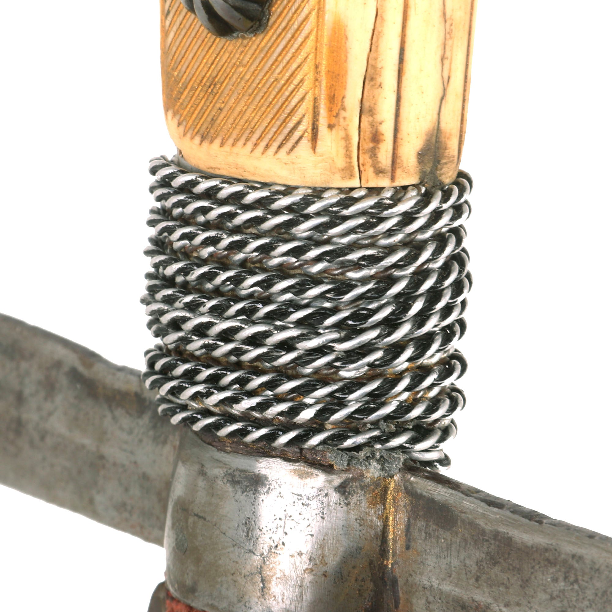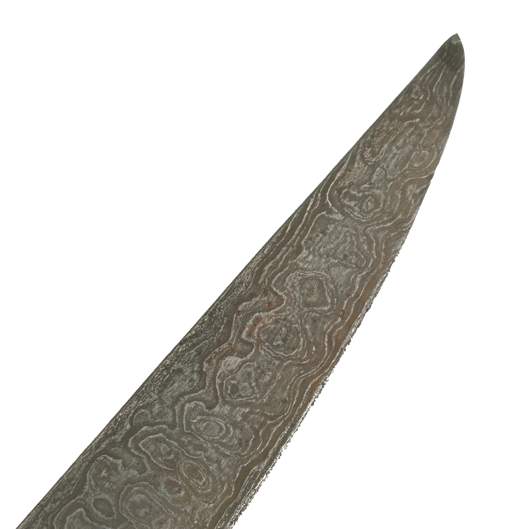 This is a gorgeous 17th Century Magnate’s sword, almost certainly of Hungarian or Polish origin, with a carved ivory grip bolstered at the hilt by silver wrap, with a gorgeous 26½” heavily-curved Eastern Pattern Welded Damascus blade, which has retained its gorgeous pattern very well. There is a small bit of the leather blade washer still retained on the crossguard. The ivory grip is studded with silver and has a lovely pattern.