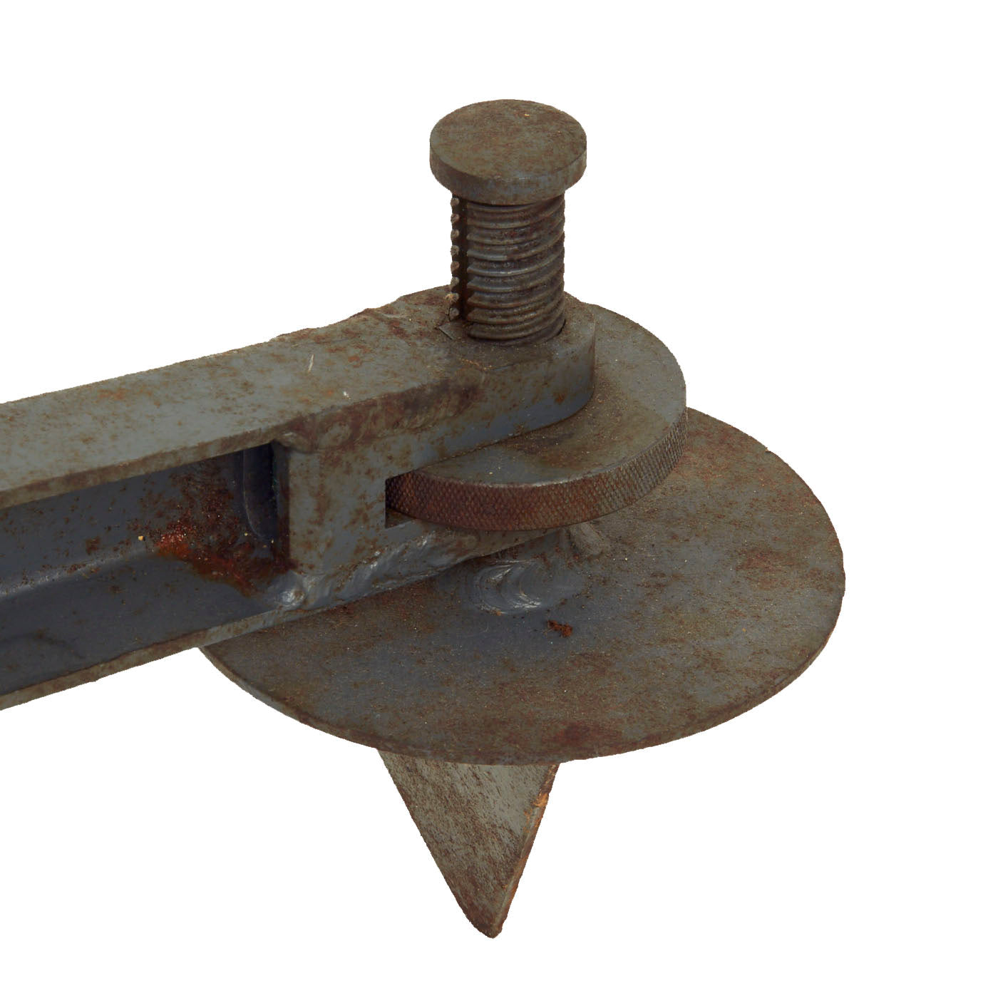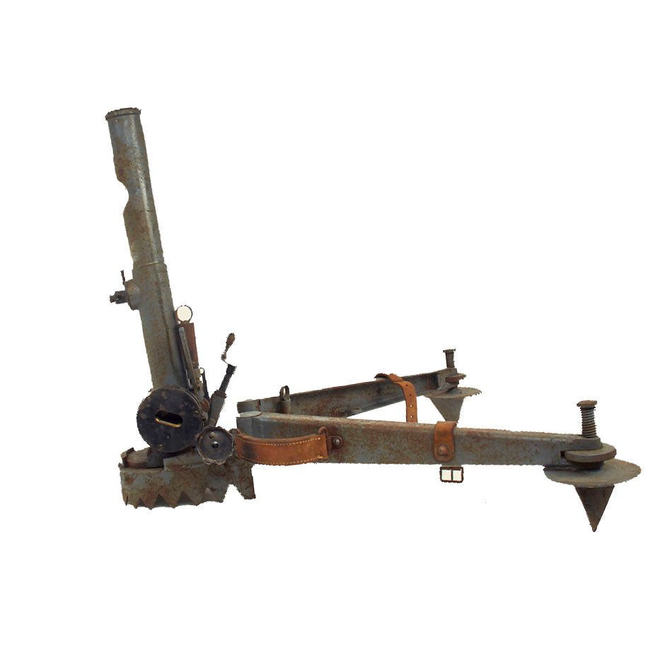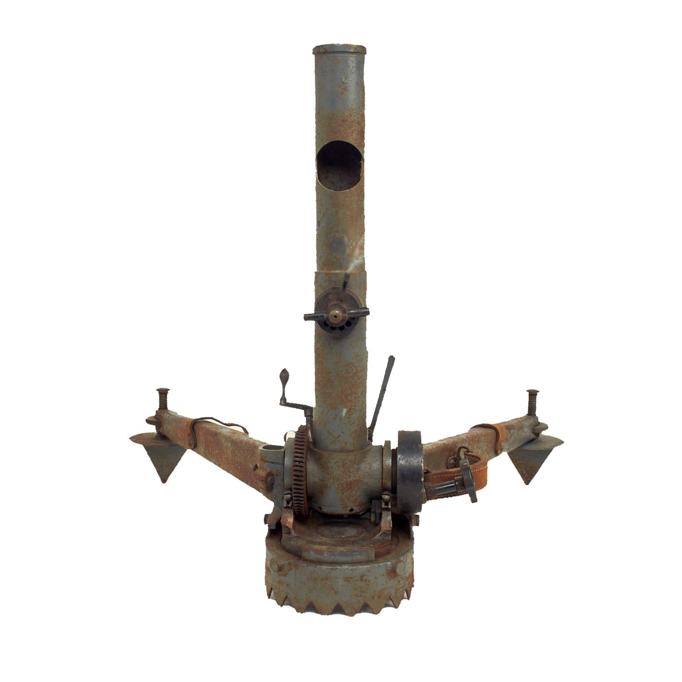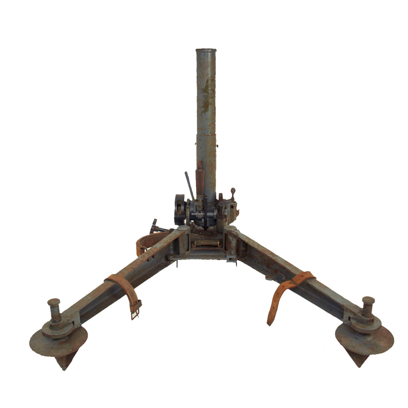 The mortar features original paint. The bore size is 50mm with tube length of 19.5 inches, legs measure 22 inches and the base plate diameter is 7 inches. It can fold correctly but the elevation adjustment is frozen, but does not appear to be broken in anyway.
