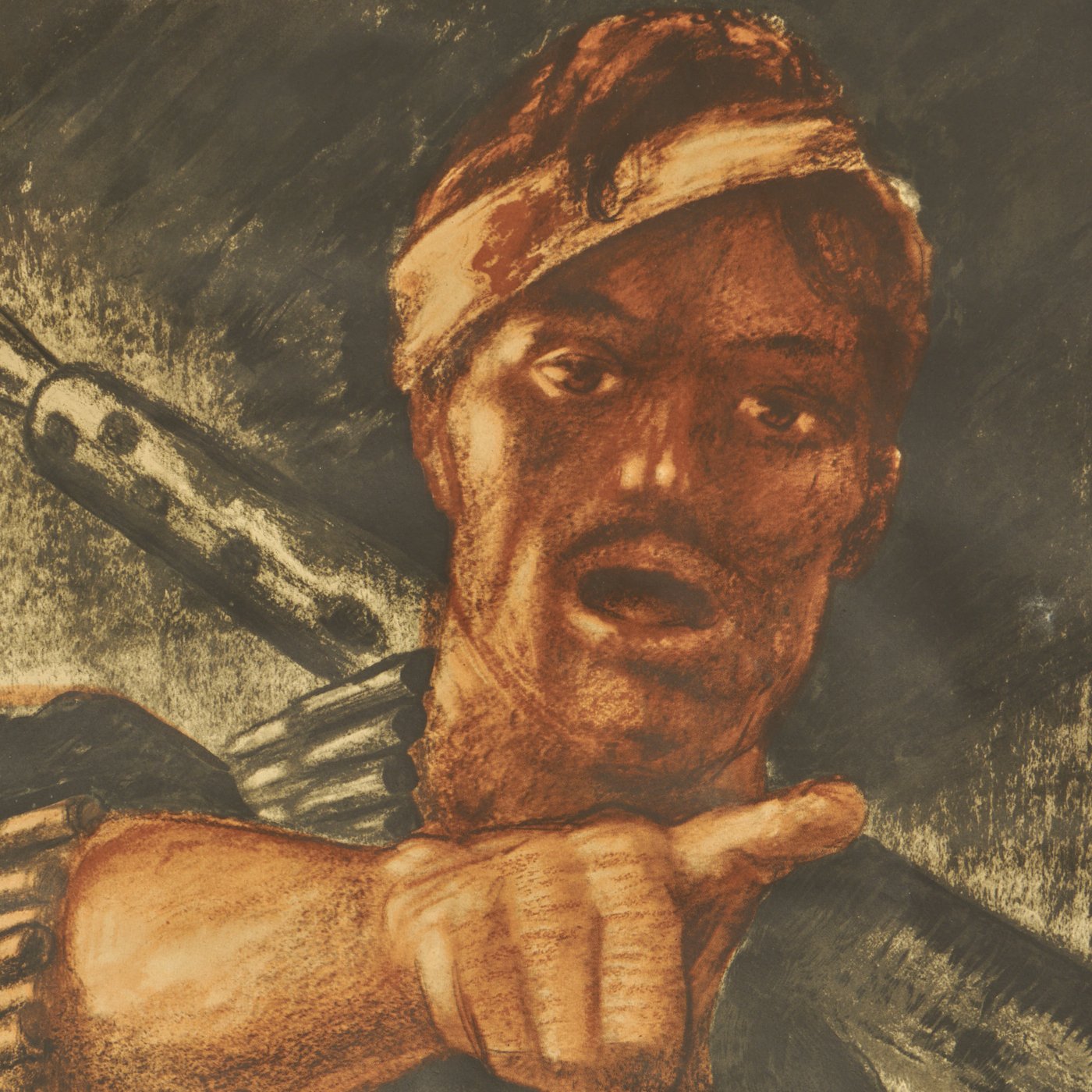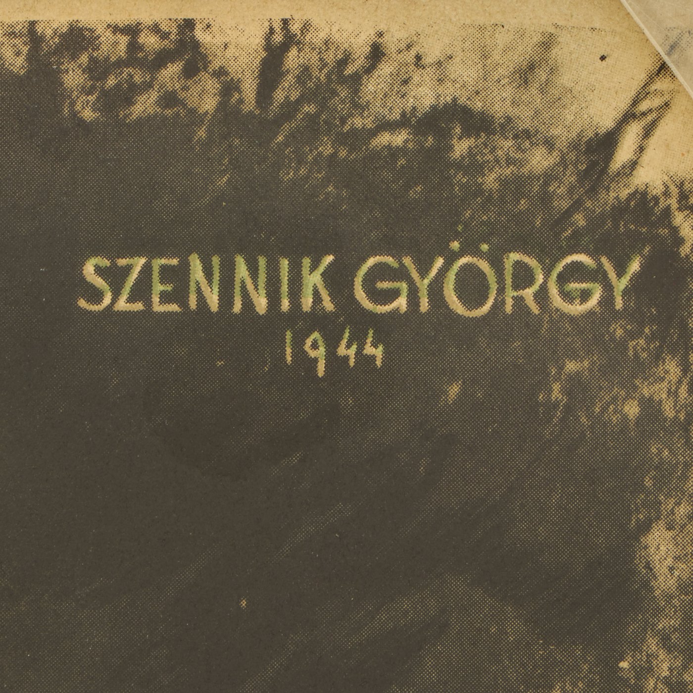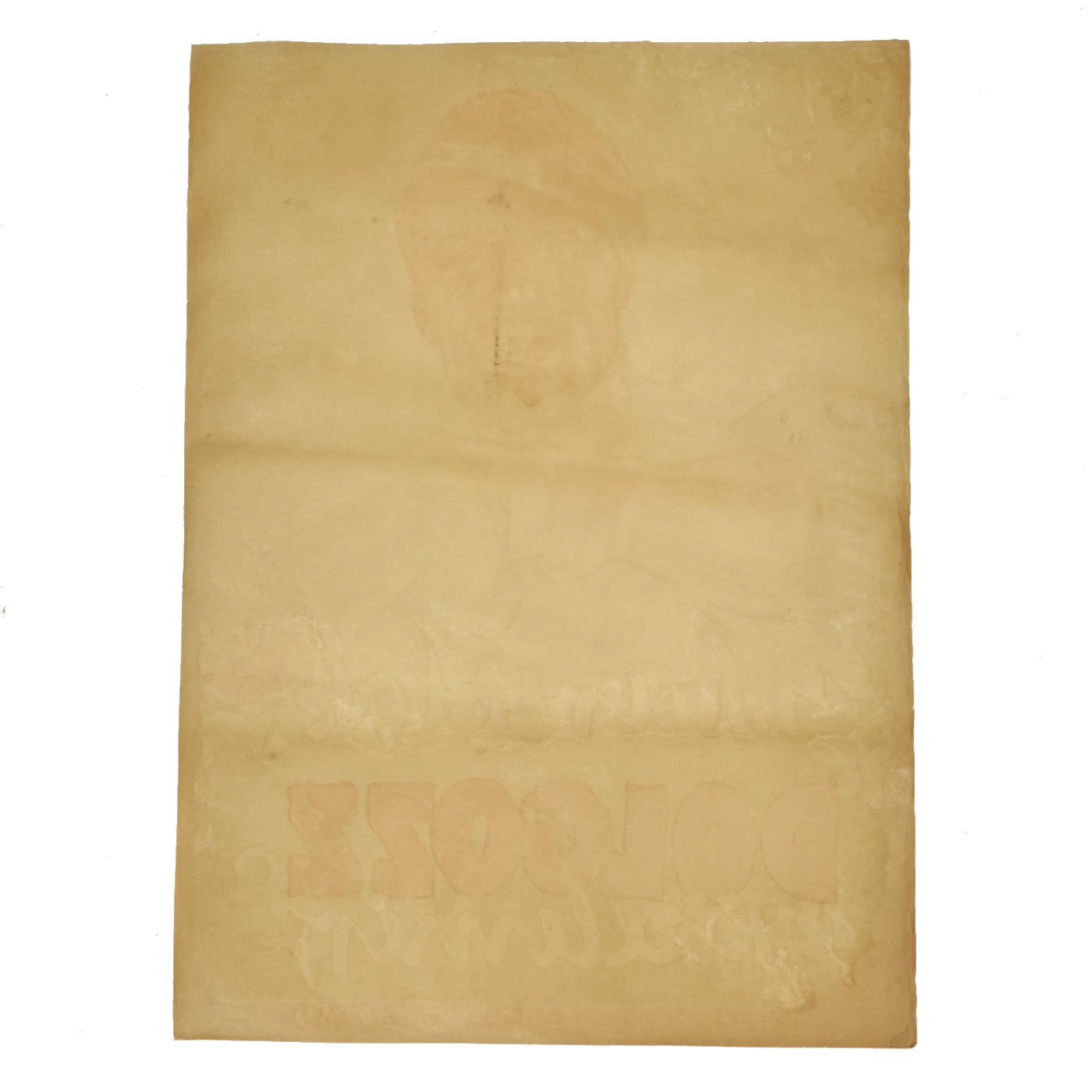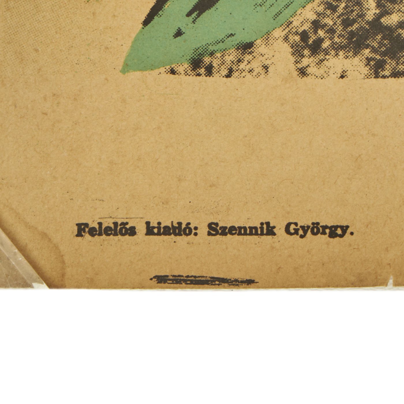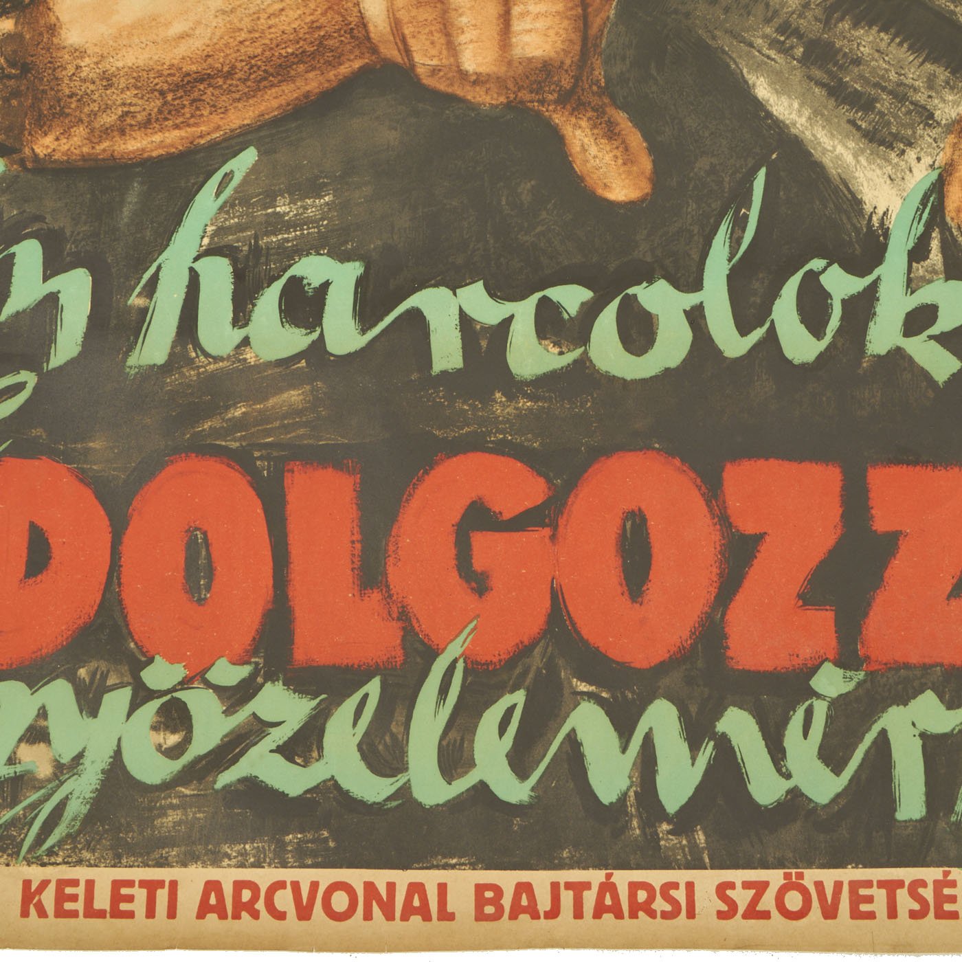 Original Item: Only One Available. This is an exceptionally rare Hungary Arrow Cross Party World War II Propaganda Poster from 1944 designed by the artist Szennik György. In Hungarian it reads; Én harcolok, te dolgozz a győzelemért - Keleti Arcvonal Bajtársi Szövetség (I fight, you must work for victory! - Eastern Front Comradely Association). It measures approximately 33" x 47" (84cm x 119cm). It is offered in very good condition with light wear, and some small tears.