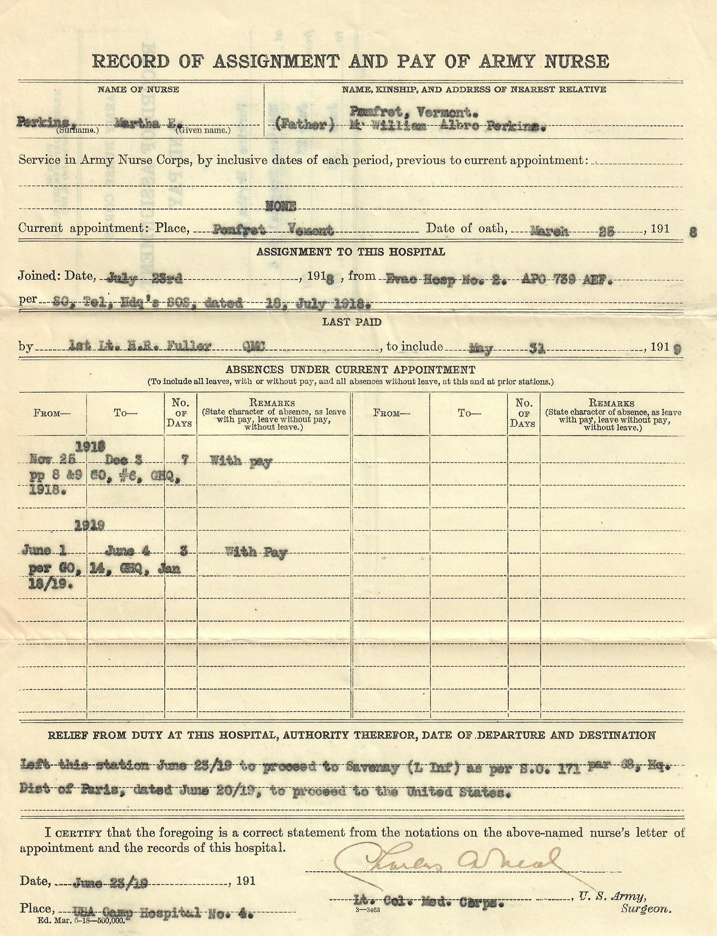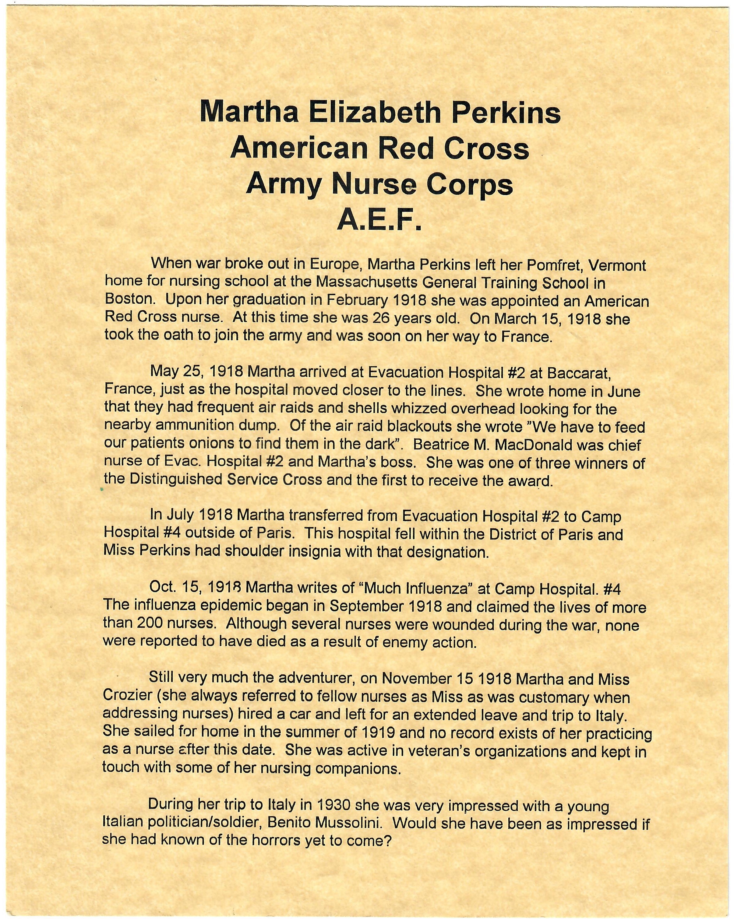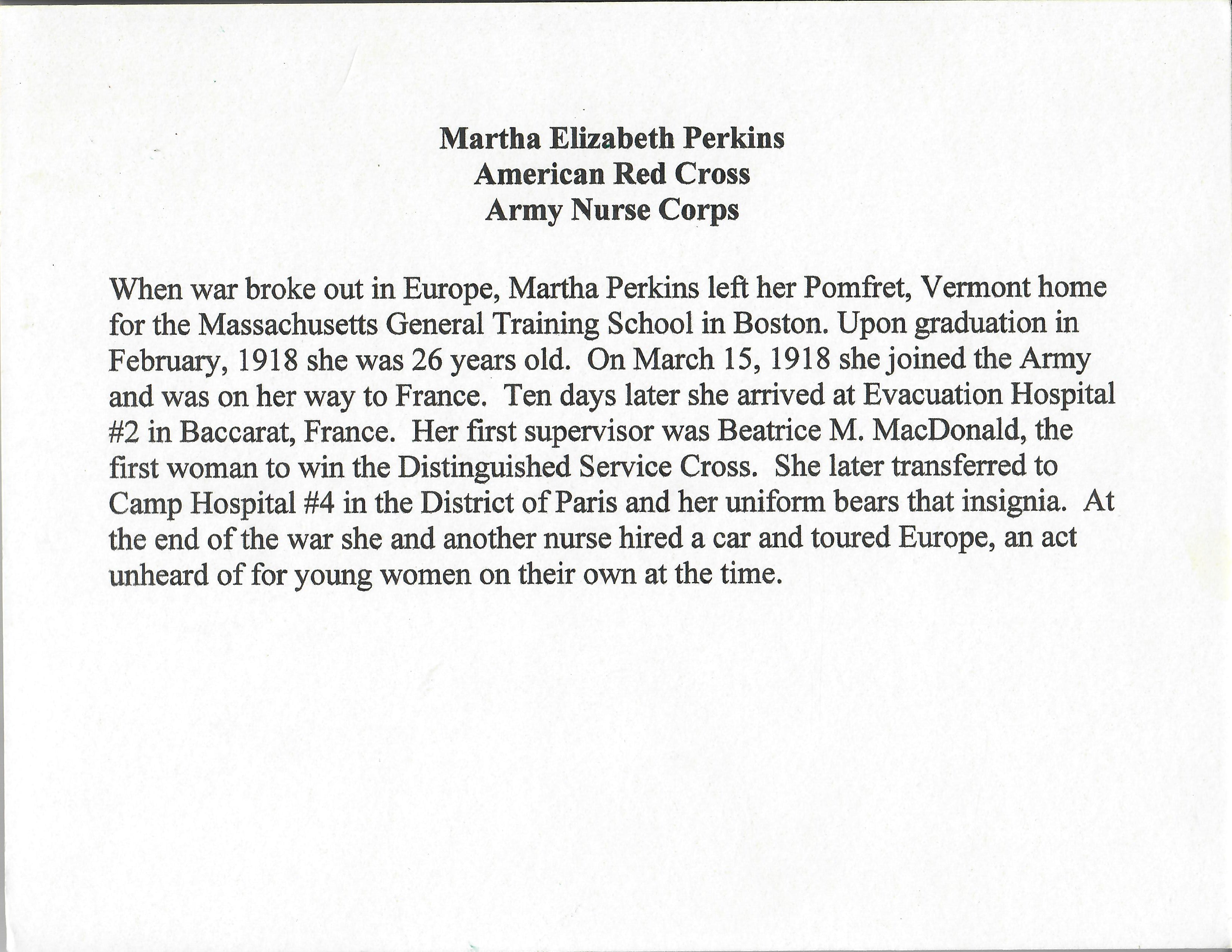 Martha Elizabeth Brown Perkins was born on March 3rd, 1892 in Pomfret, Vermont. At the age of 26, Perkins left her Pomfret, Vermont home for the Massachusetts General Training School in Boston. Upon graduation in 1918, she joined the army and was on her way to France on April 24th, 1918. Soon after, she arrived at Evacuation Hospital #2 in Baccarat, France, working as a nurse during the majority of the American Expeditionary Forces’ combat record.