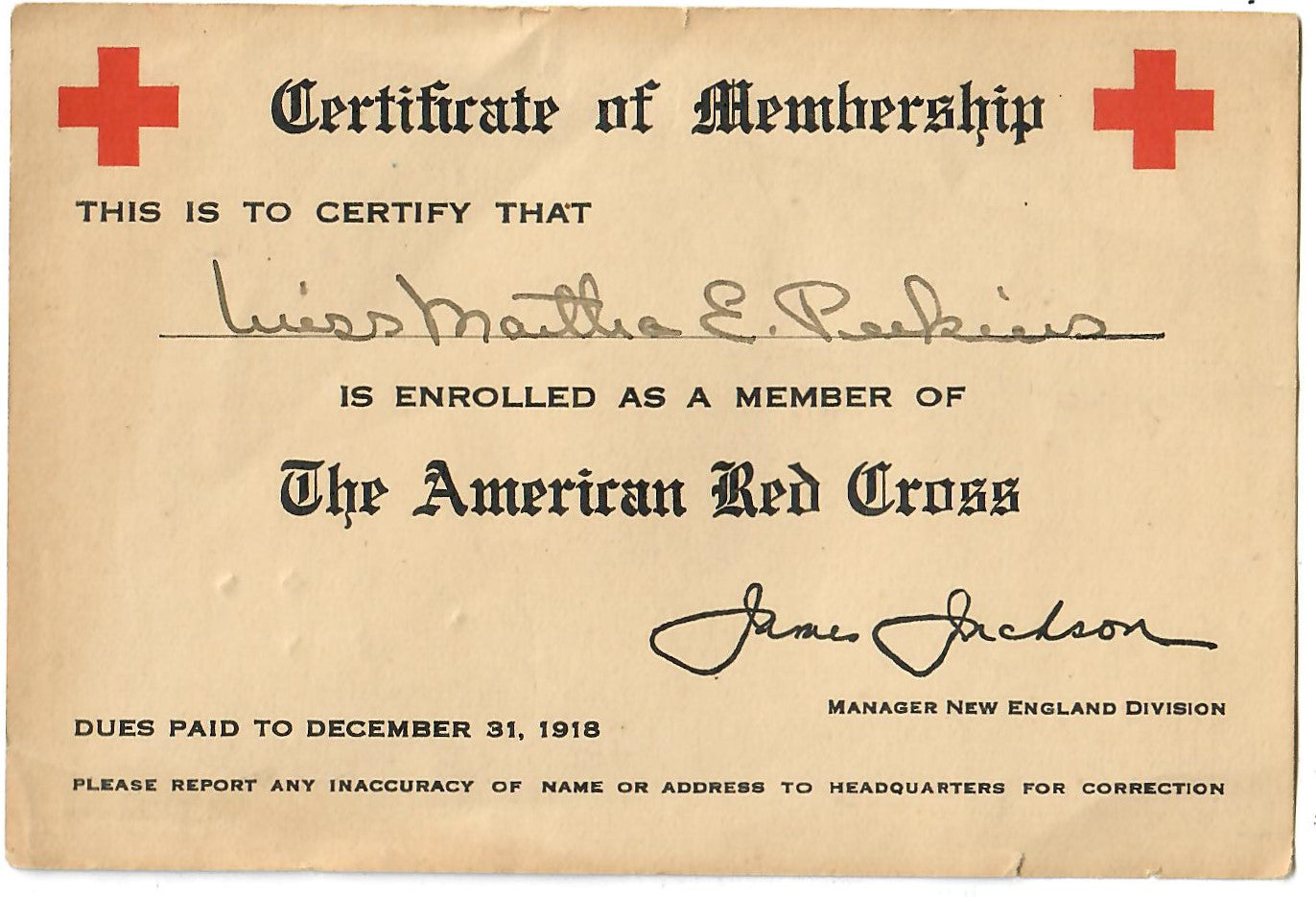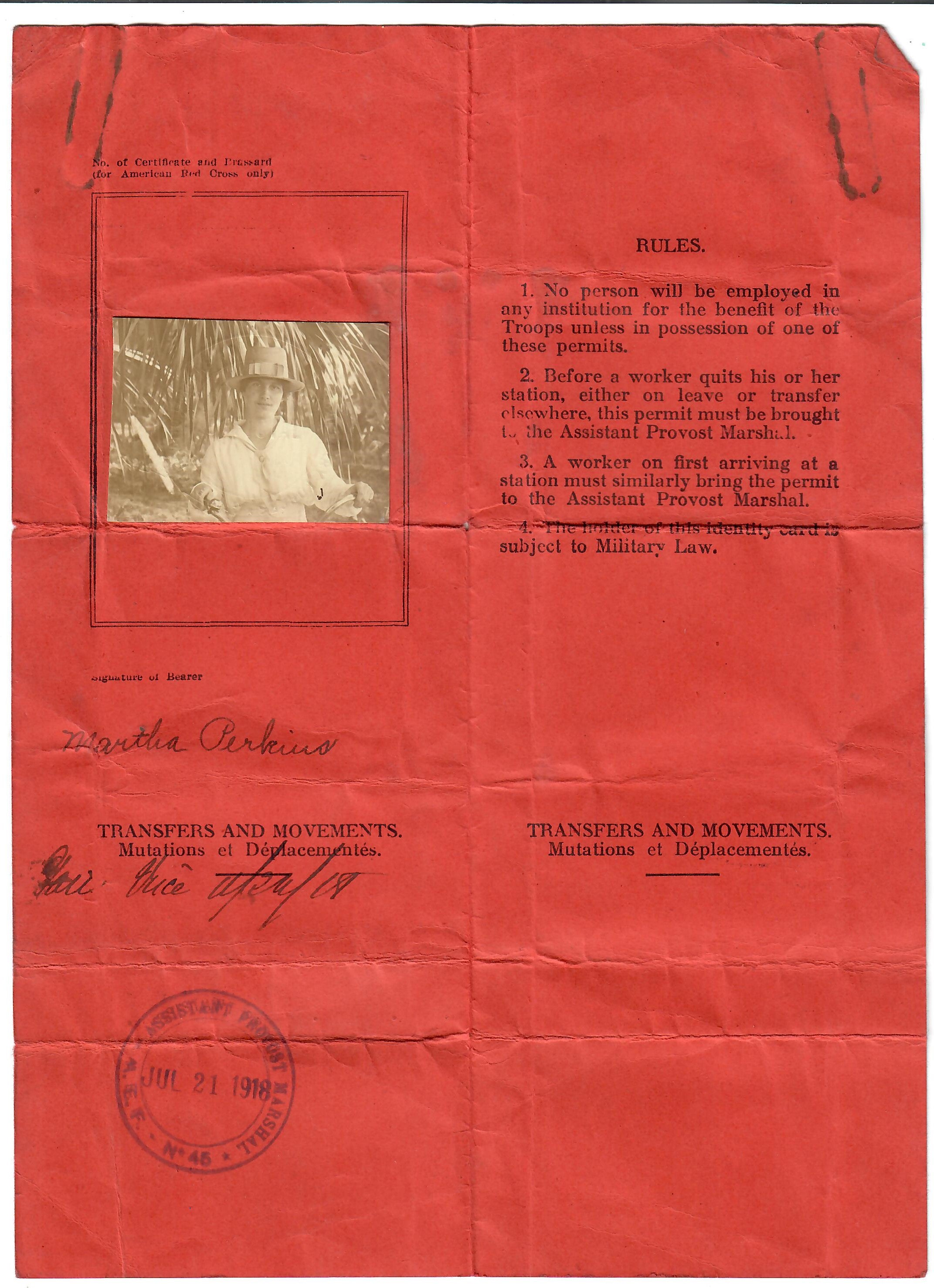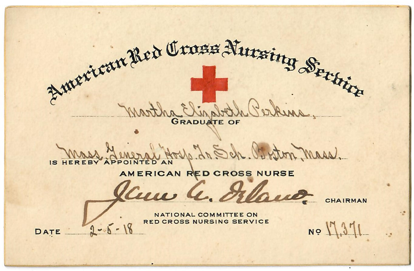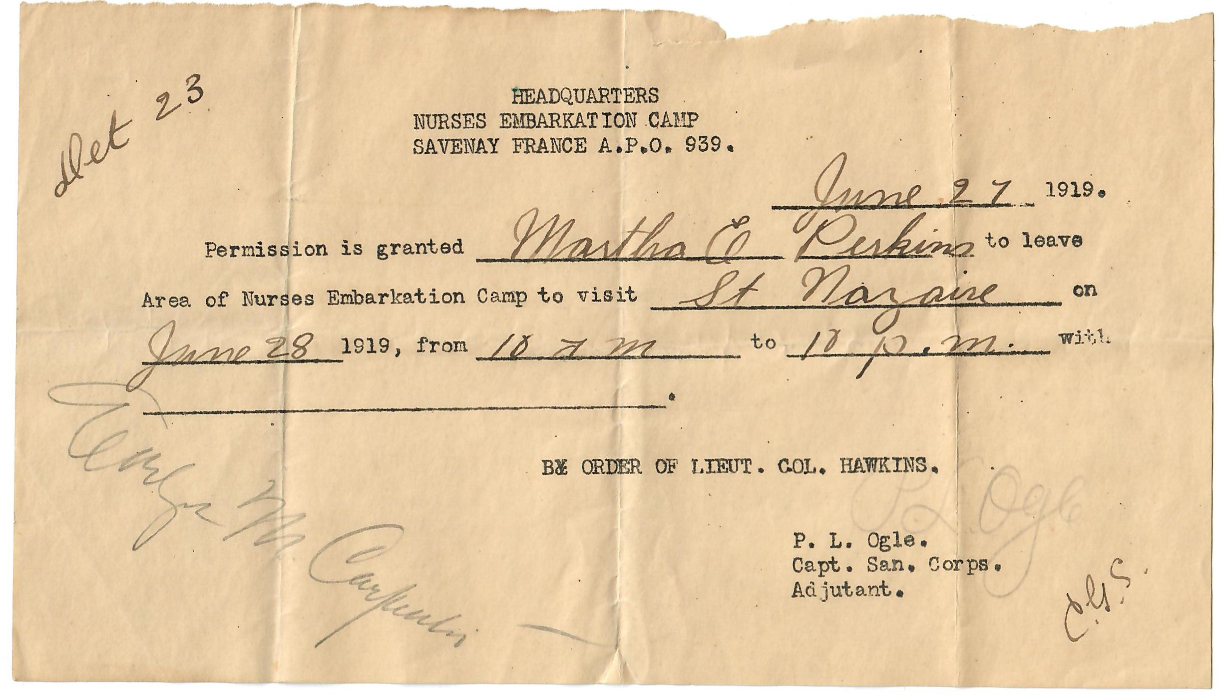 Martha Elizabeth Brown Perkins was born on March 3rd, 1892 in Pomfret, Vermont. At the age of 26, Perkins left her Pomfret, Vermont home for the Massachusetts General Training School in Boston. Upon graduation in 1918, she joined the army and was on her way to France on April 24th, 1918. Soon after, she arrived at Evacuation Hospital #2 in Baccarat, France, working as a nurse during the majority of the American Expeditionary Forces’ combat record.
