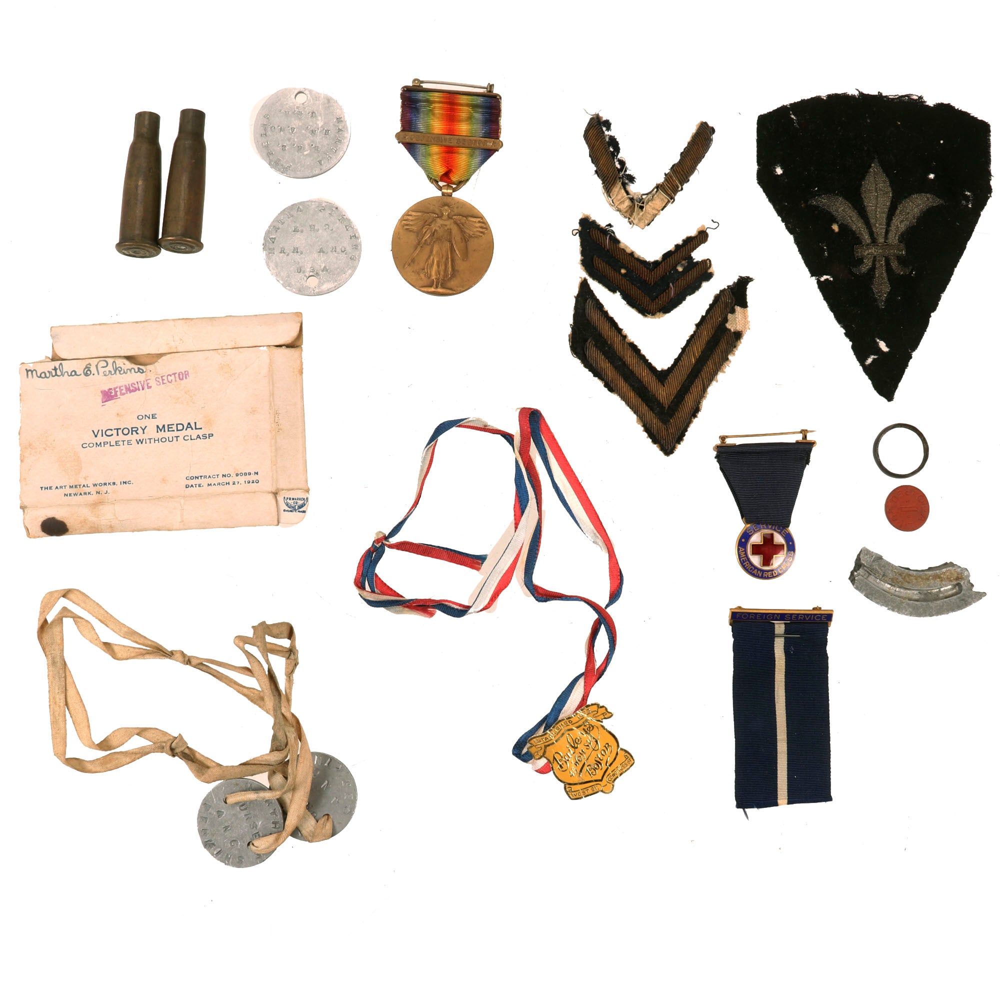 - A riker case with 1 District of Paris patch, two sets of dog tags named to Perkins, one set on a string, her US Victory Medal with one clasp for the Defensive Sector, one of the VERY few instances a woman would be awarded a battle clasp. Also included is the box the medal came in, several sets of her overseas chevrons, an ARC medal, a foreign service medal, and 2 brass shell casings and one piece of shrapnel from an artillery round.