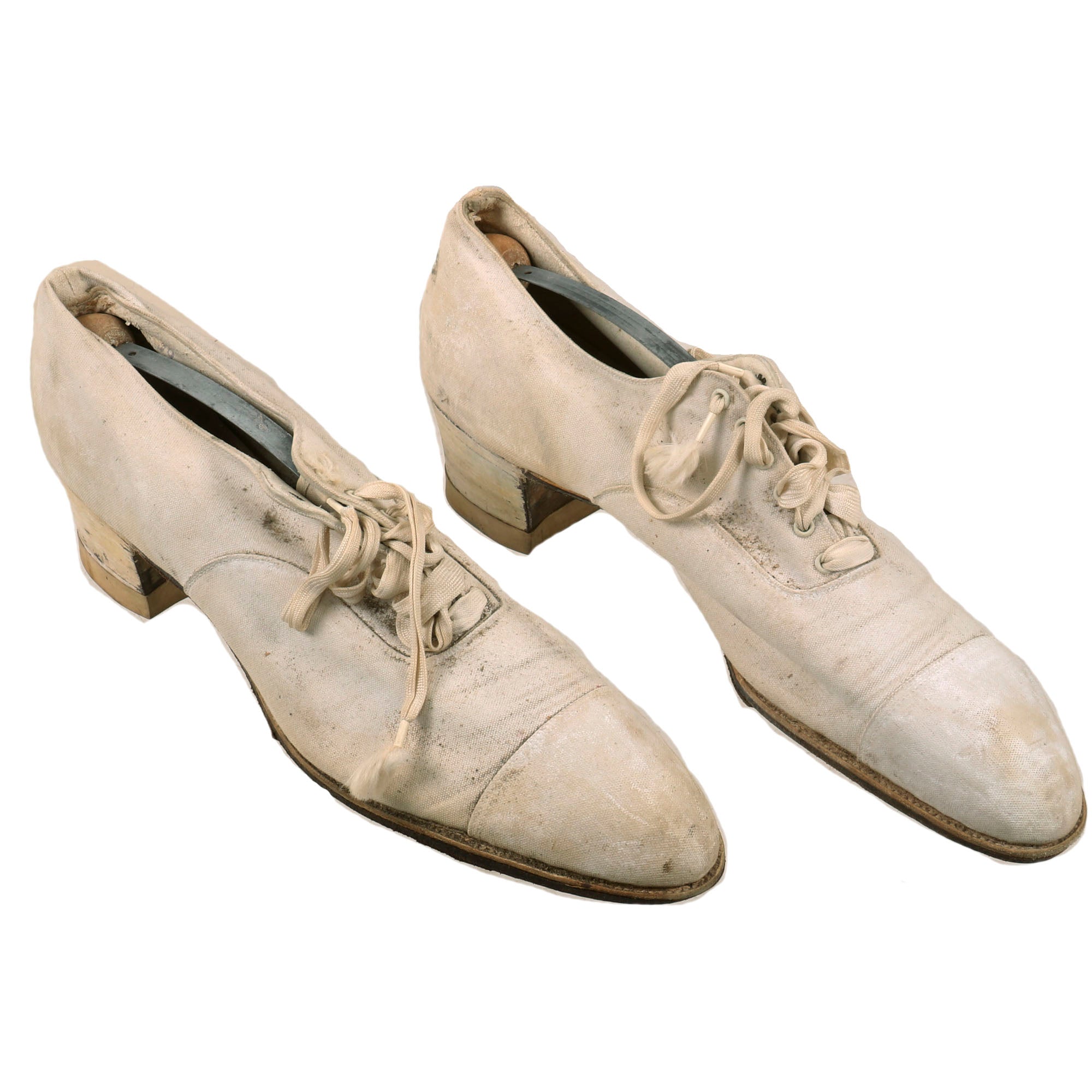 - Perkins’ white nurse shoes. There are small metal bars sticking up which are pushed in by the feet, a common feature in female shoes of the time.