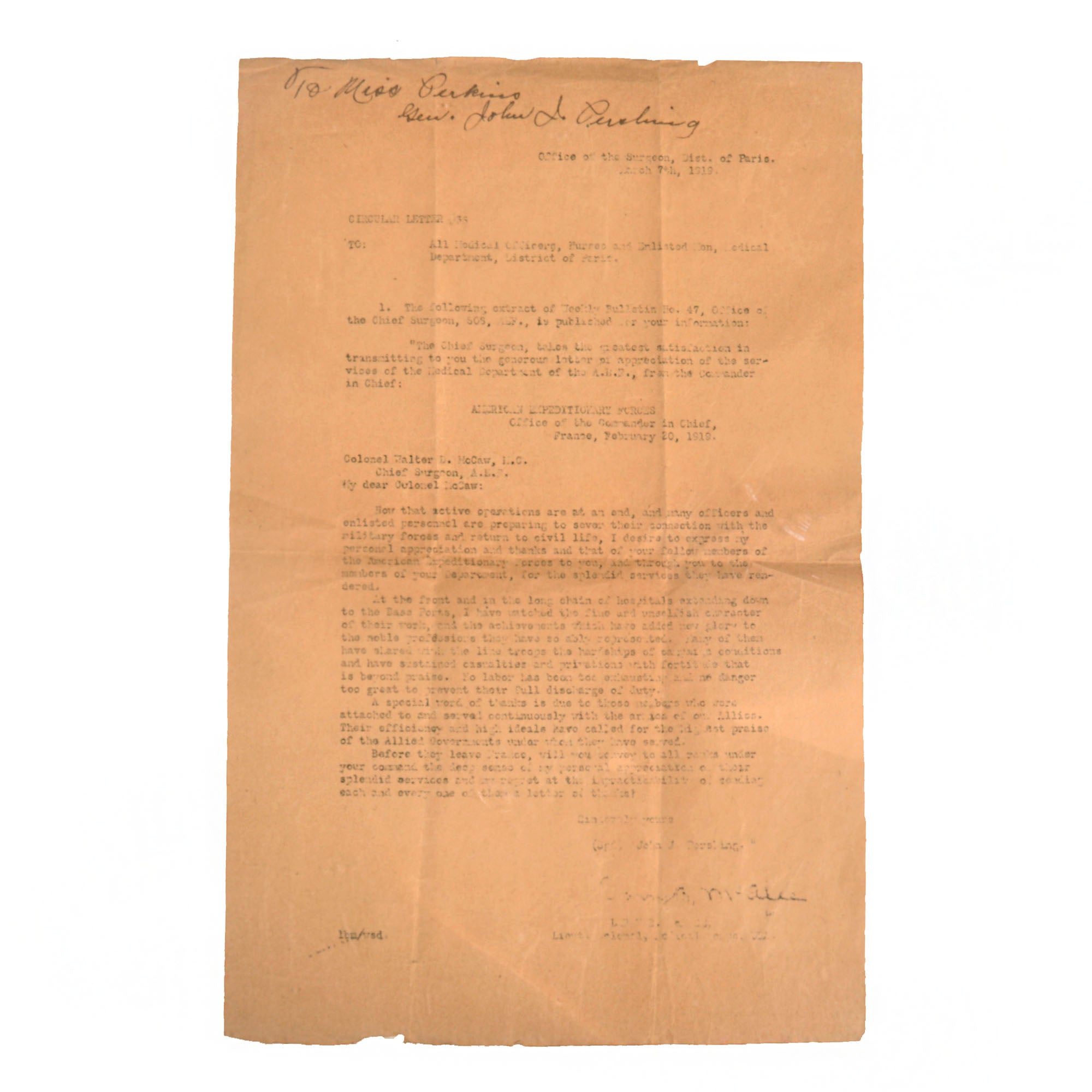 - Framed letter to all members of the District of Paris commending them on their work during the war, with Perkins’ name written at the top.