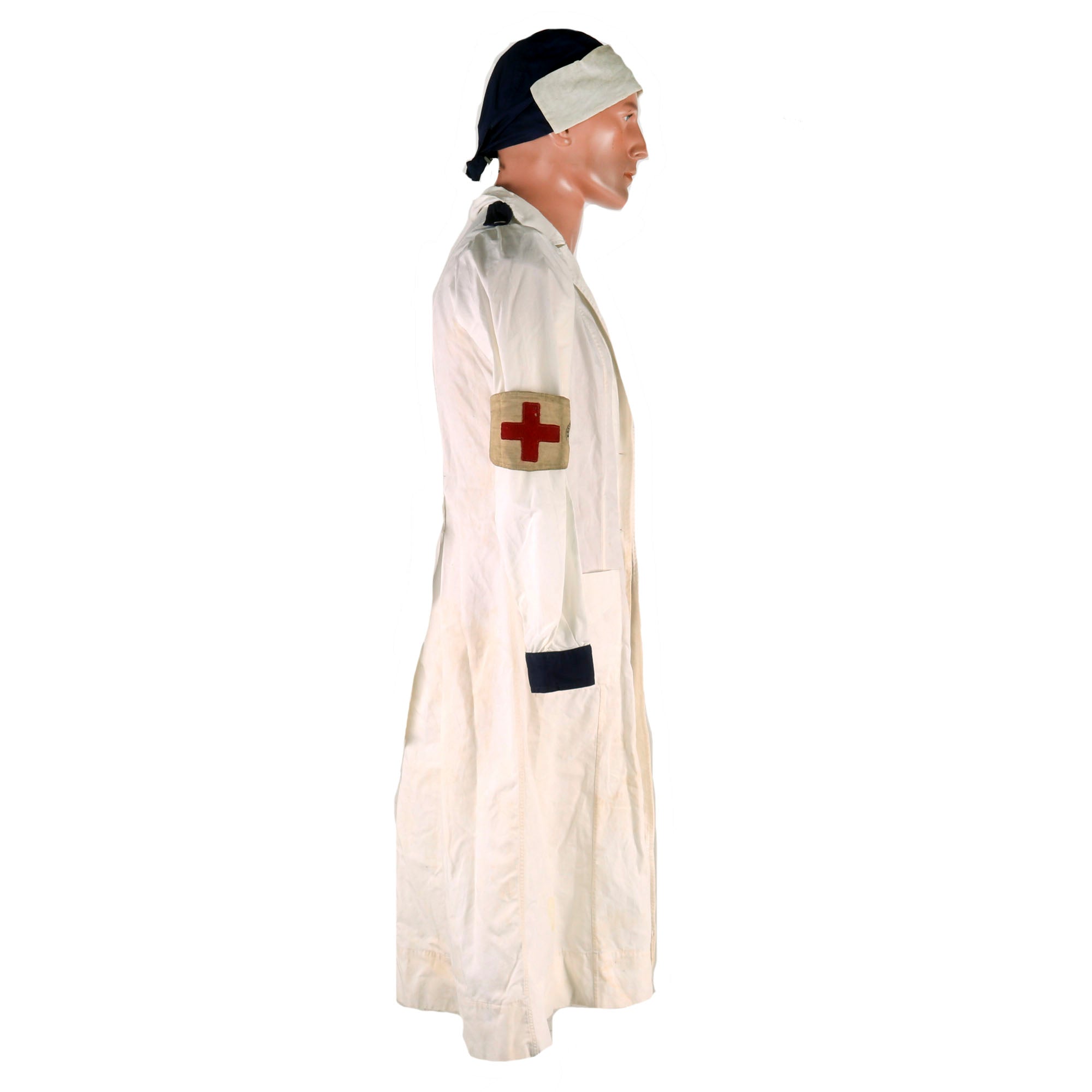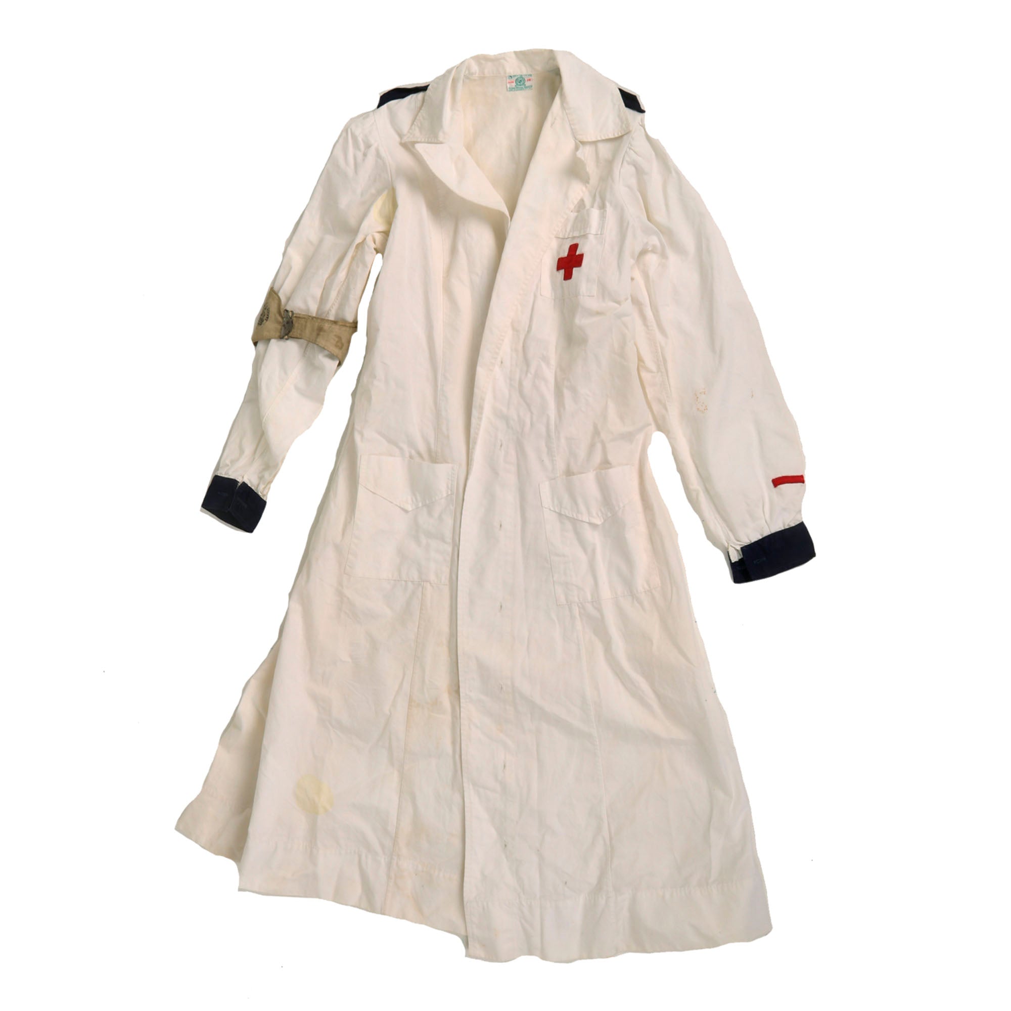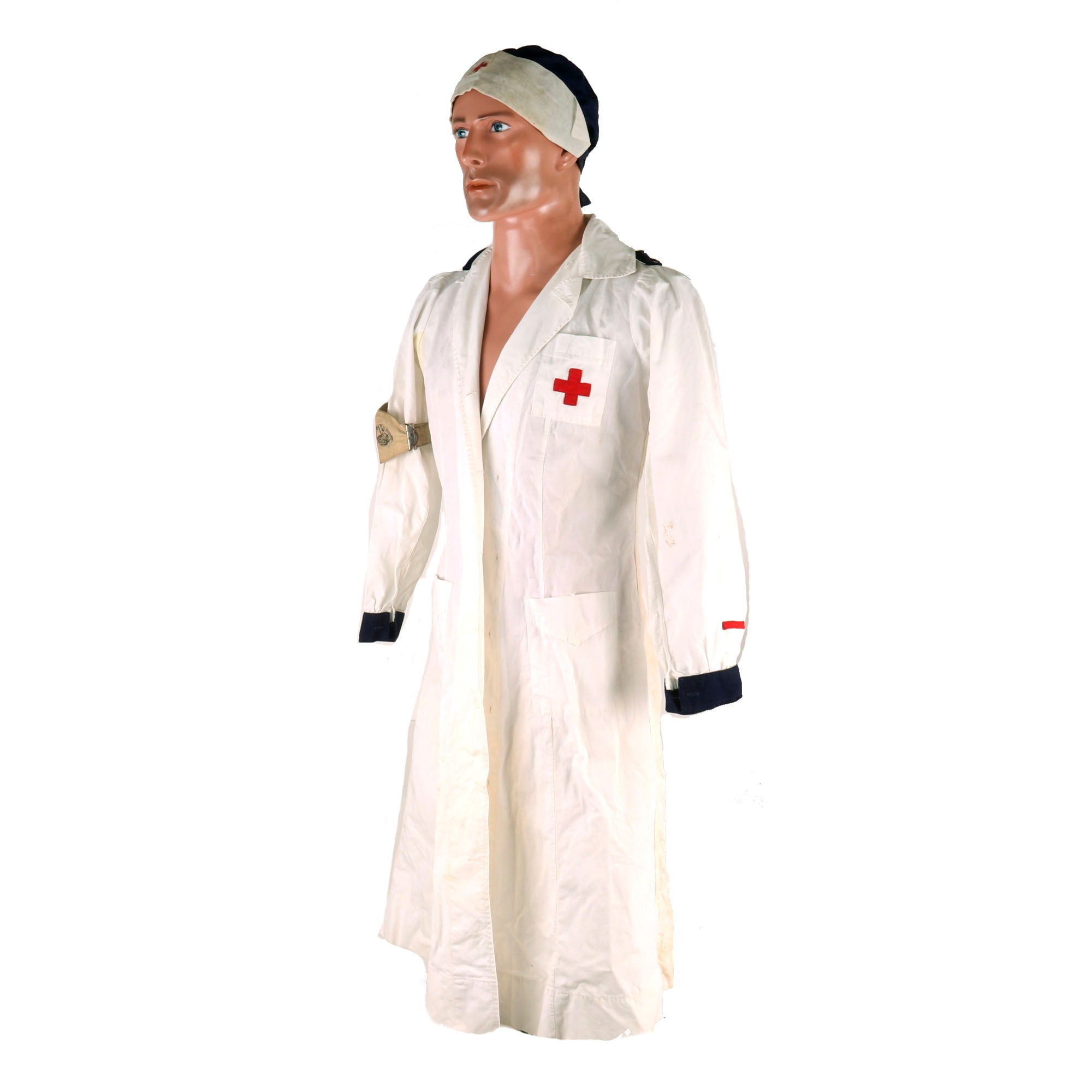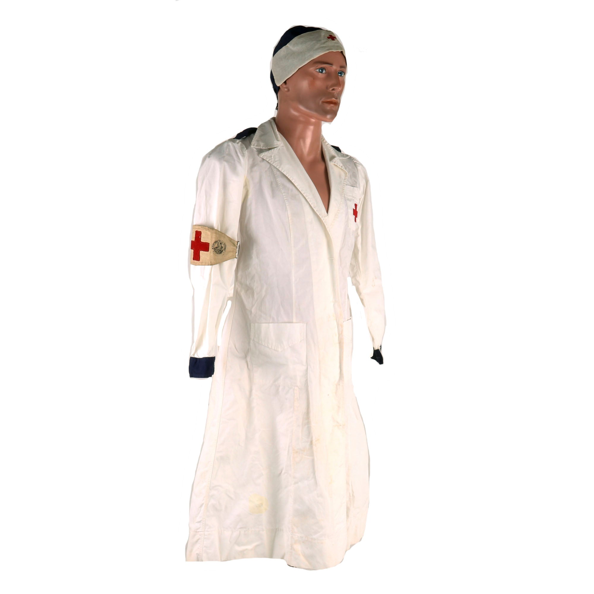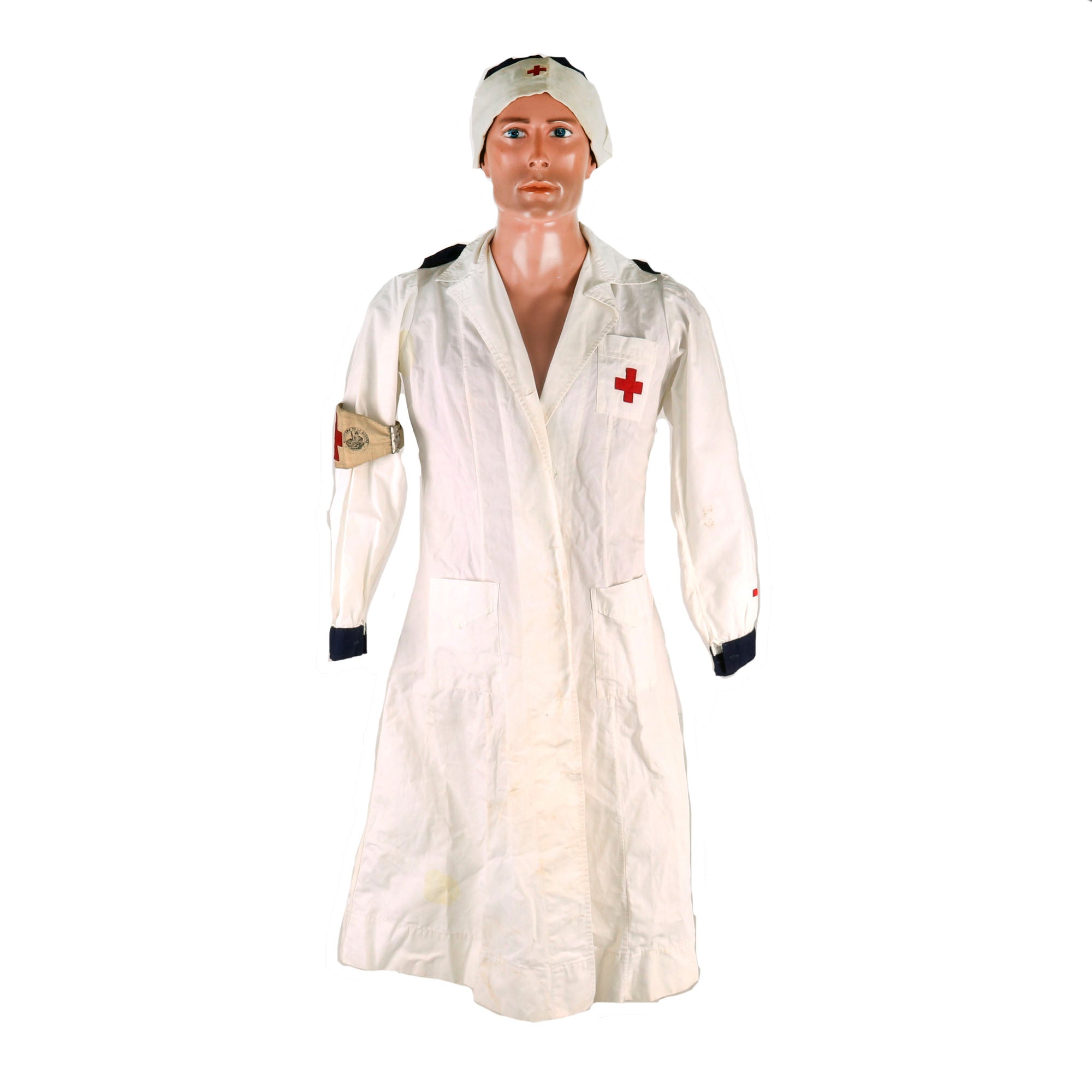 - Perkins’ American Red Cross Army uniform with a District of Paris patch, three overseas chevrons, medical ANC insignia on the collars, and a victory ribbon with one star. All buttons are retained and the uniform is in great condition.