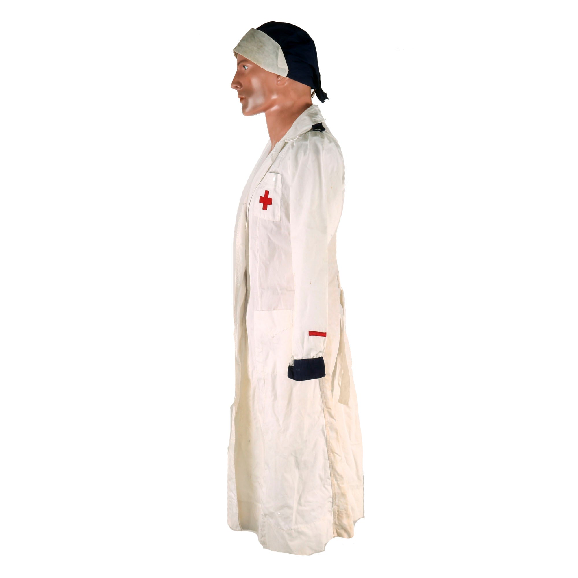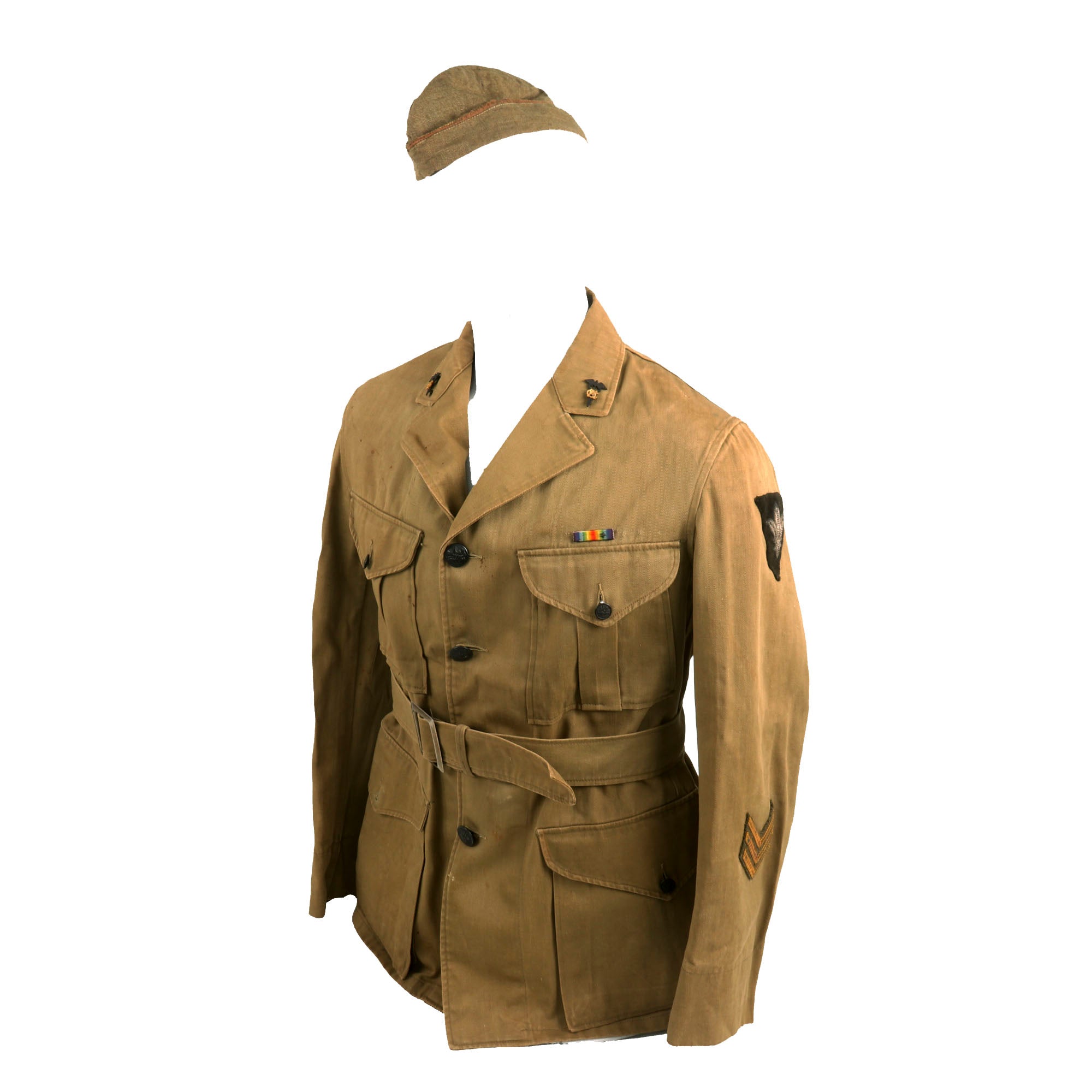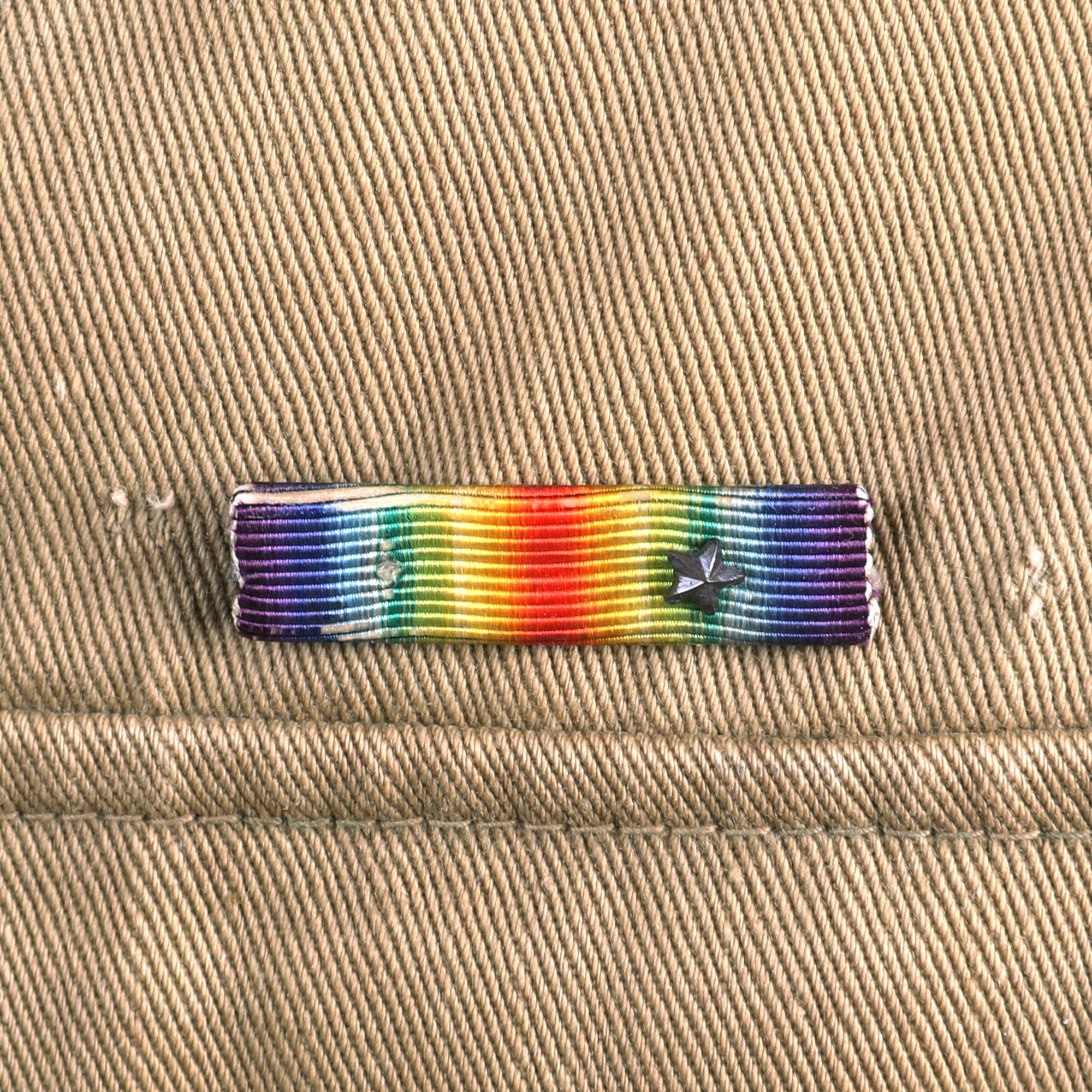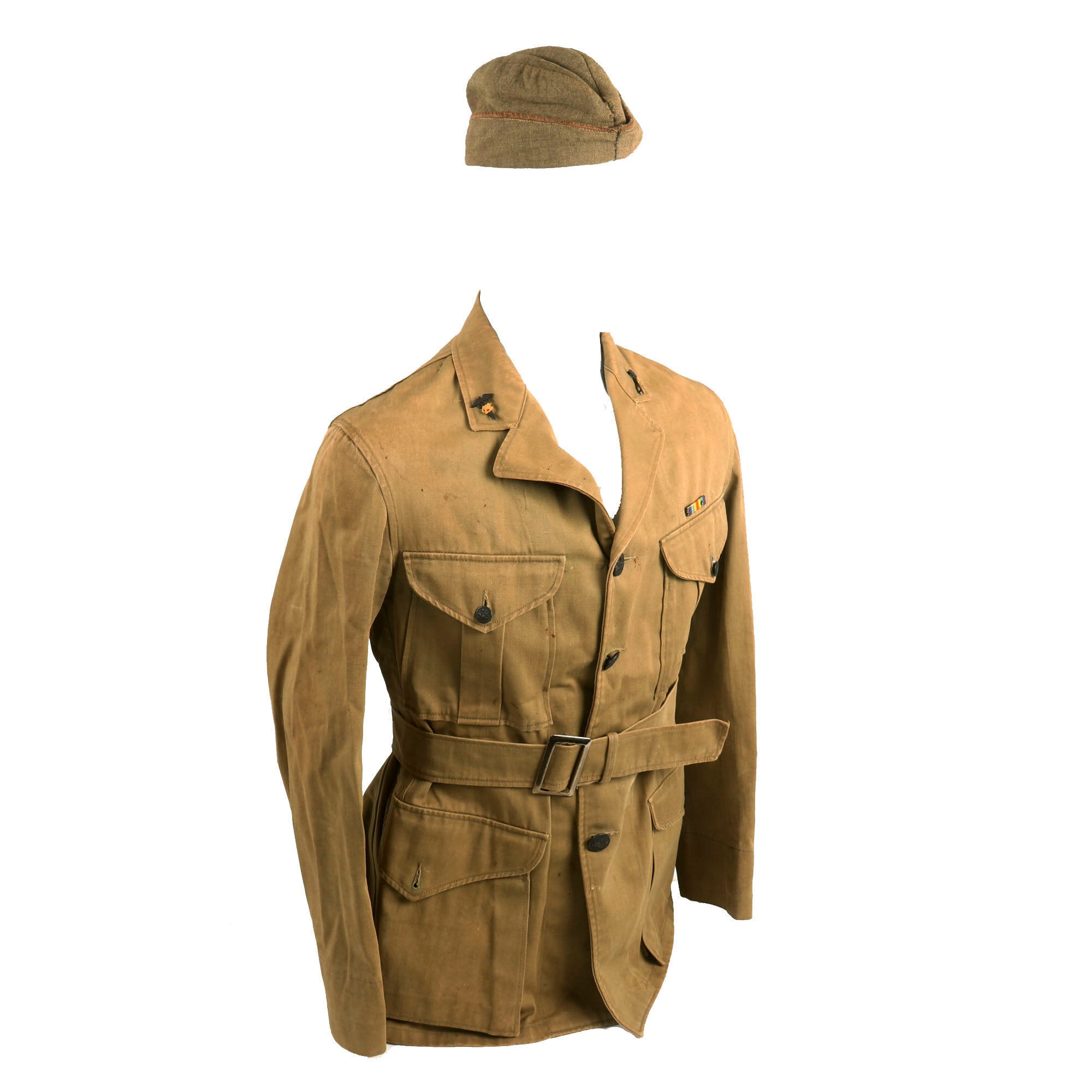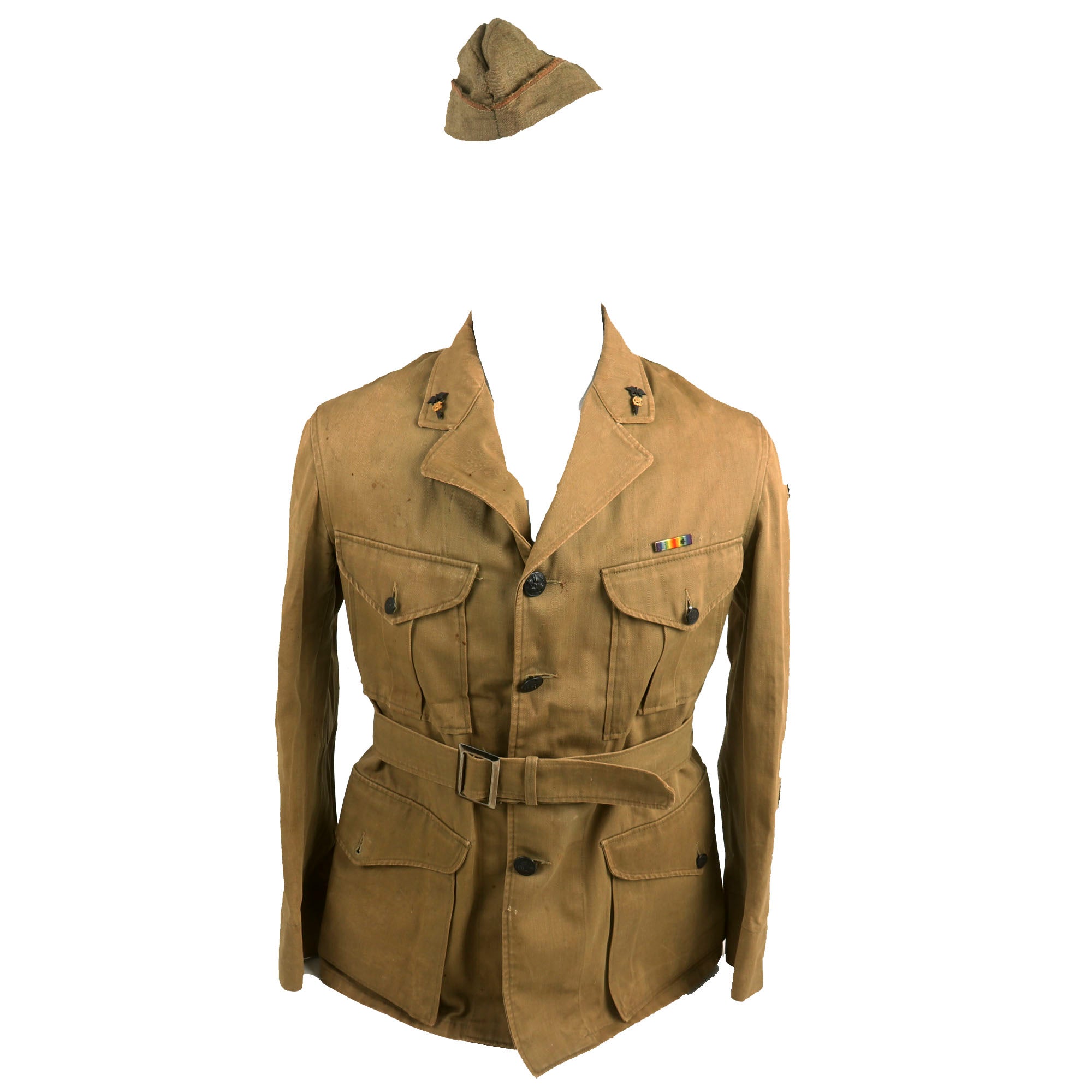 - Perkins’ American Red Cross Army uniform with a District of Paris patch, three overseas chevrons, medical ANC insignia on the collars, and a victory ribbon with one star. All buttons are retained and the uniform is in great condition.
