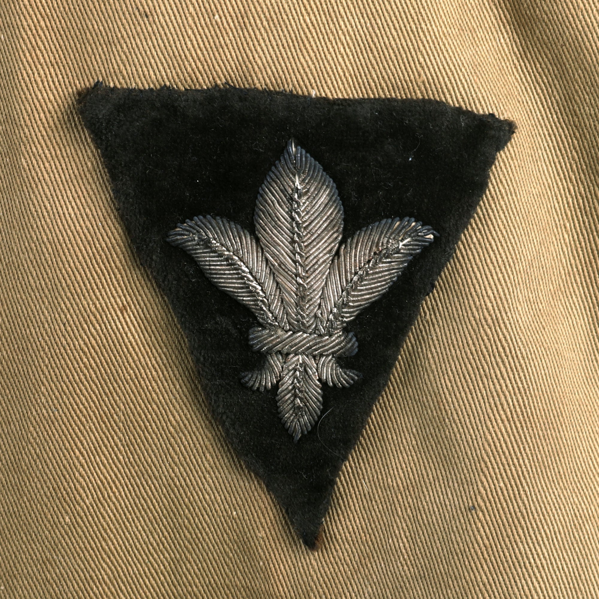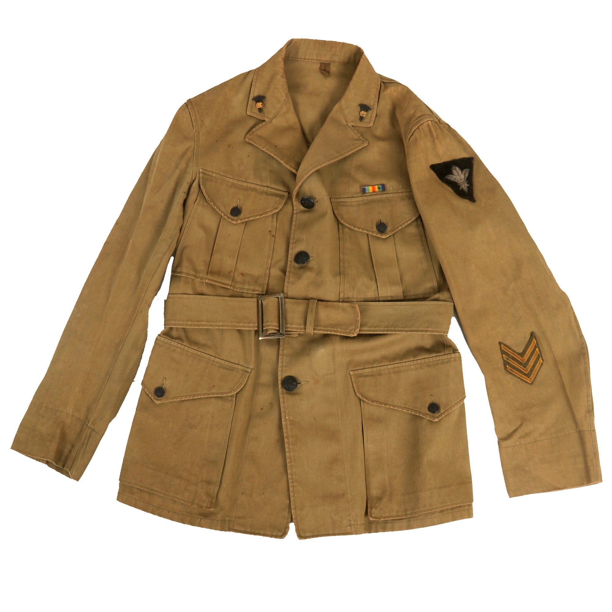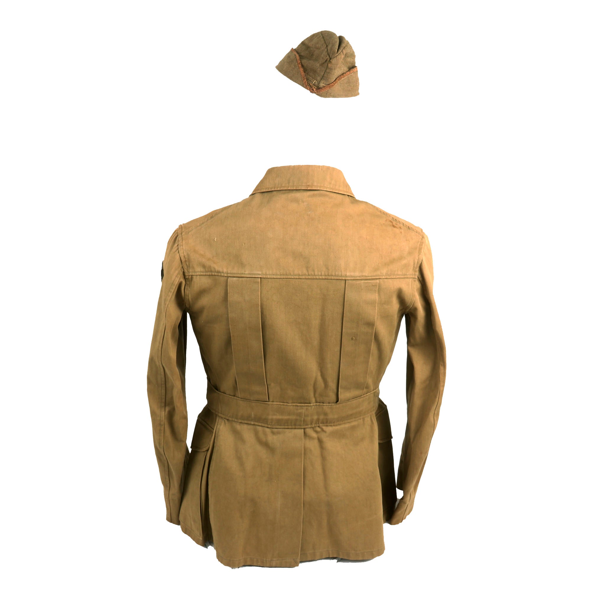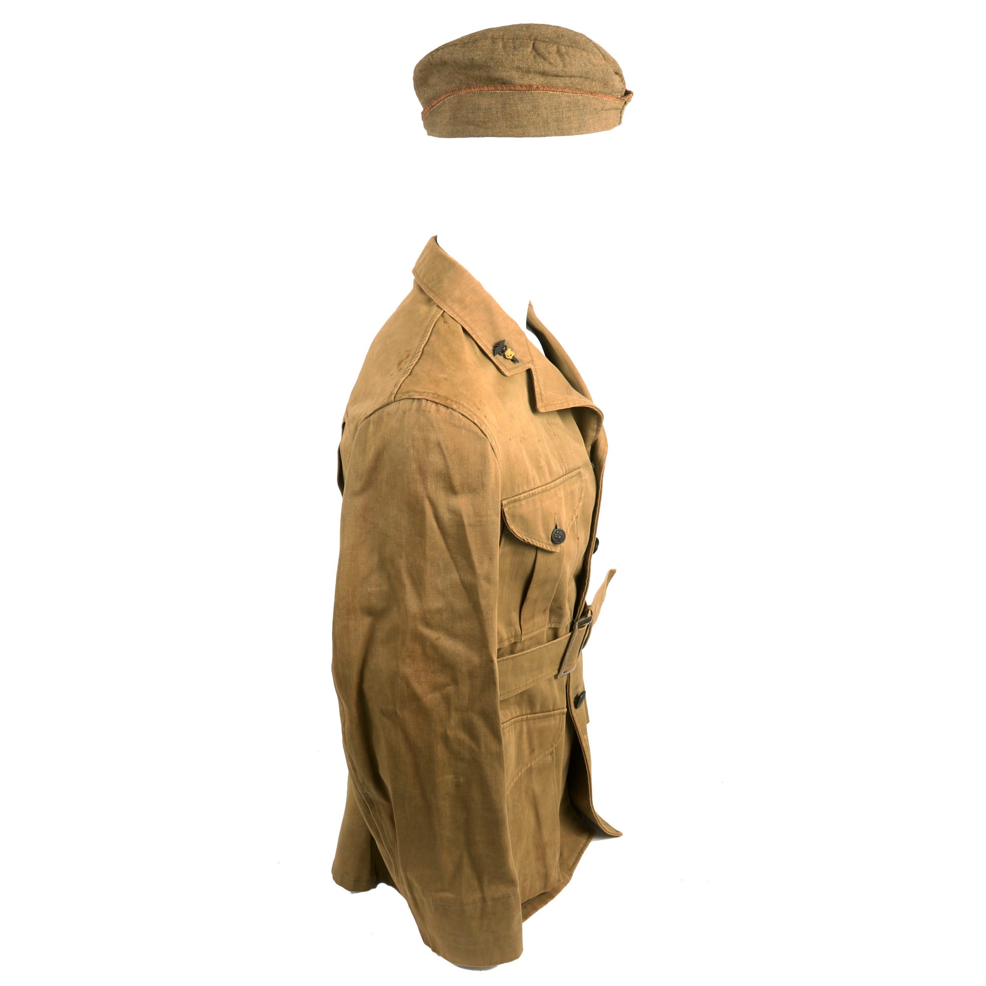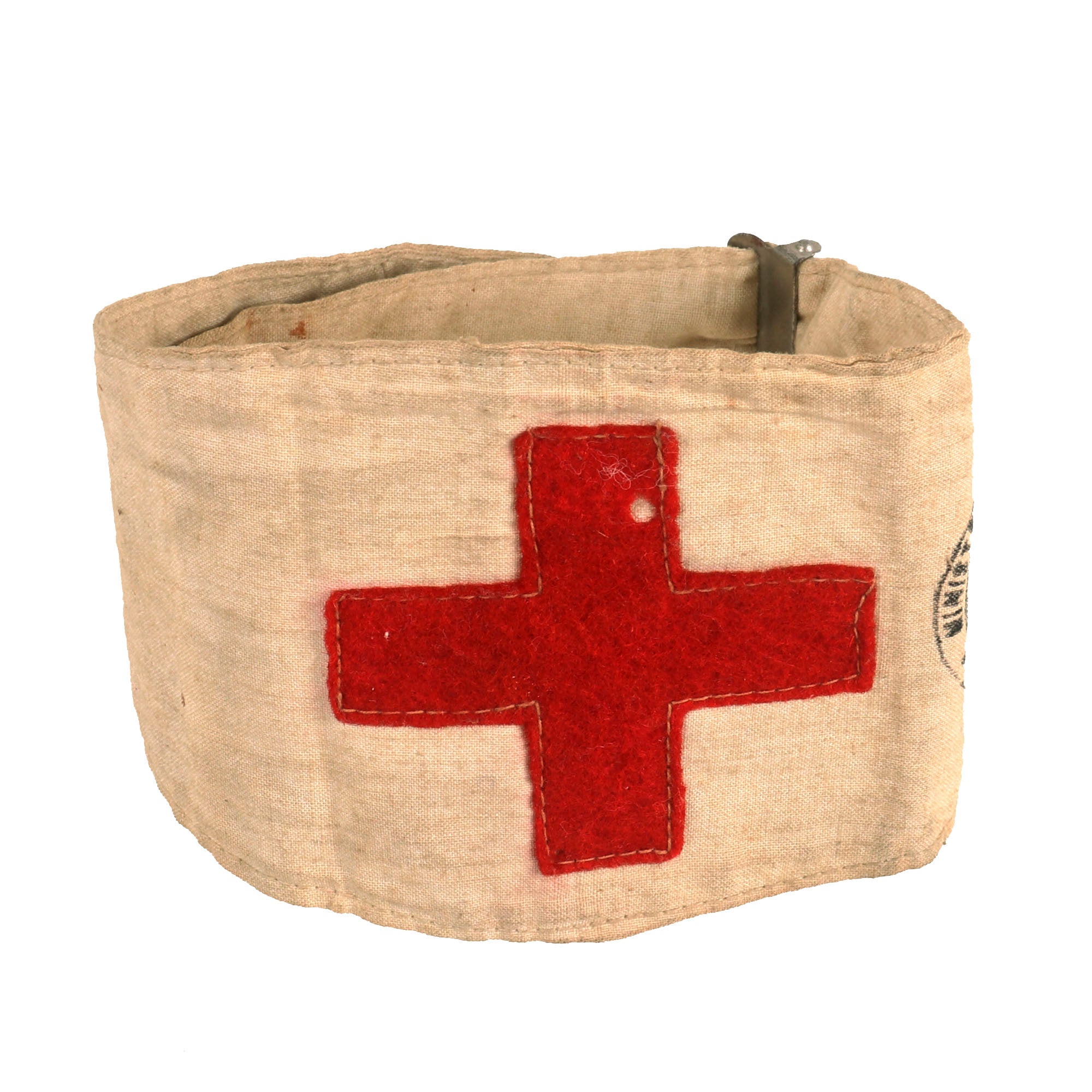 - Perkins’ American Red Cross Army uniform with a District of Paris patch, three overseas chevrons, medical ANC insignia on the collars, and a victory ribbon with one star. All buttons are retained and the uniform is in great condition.