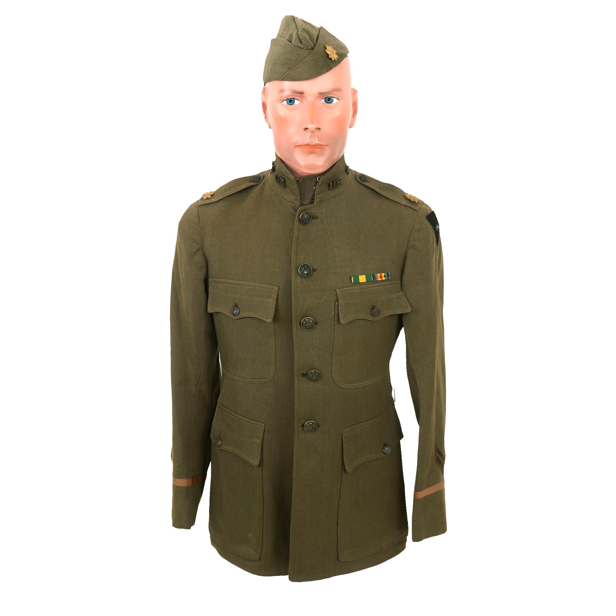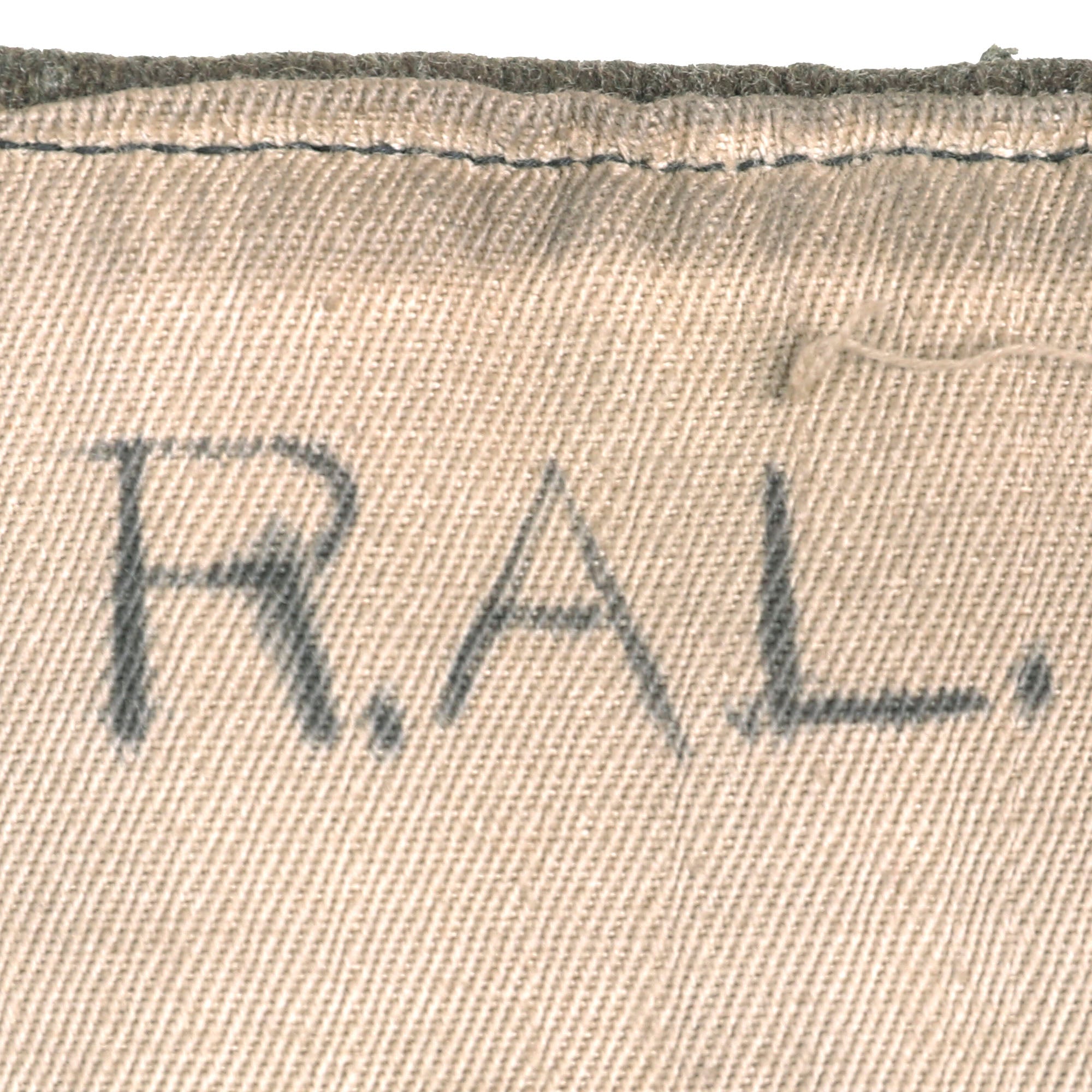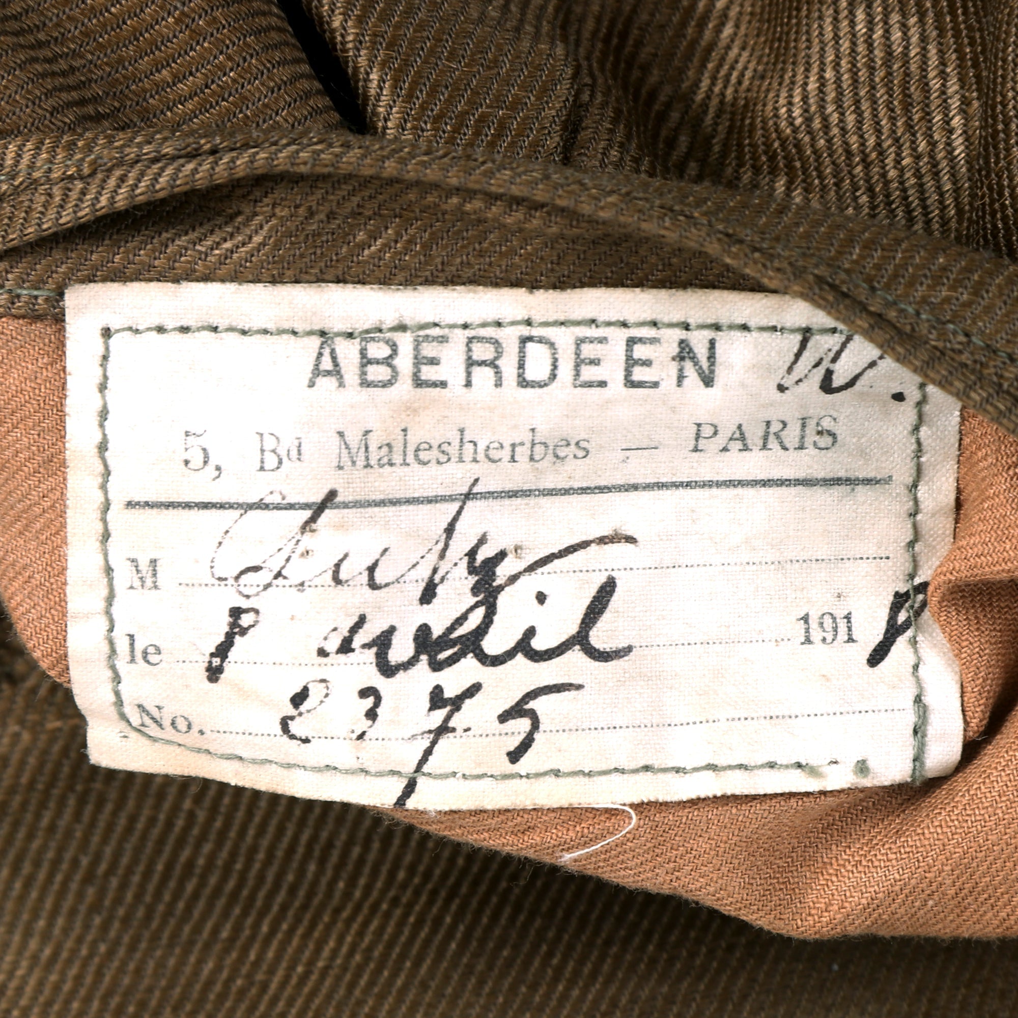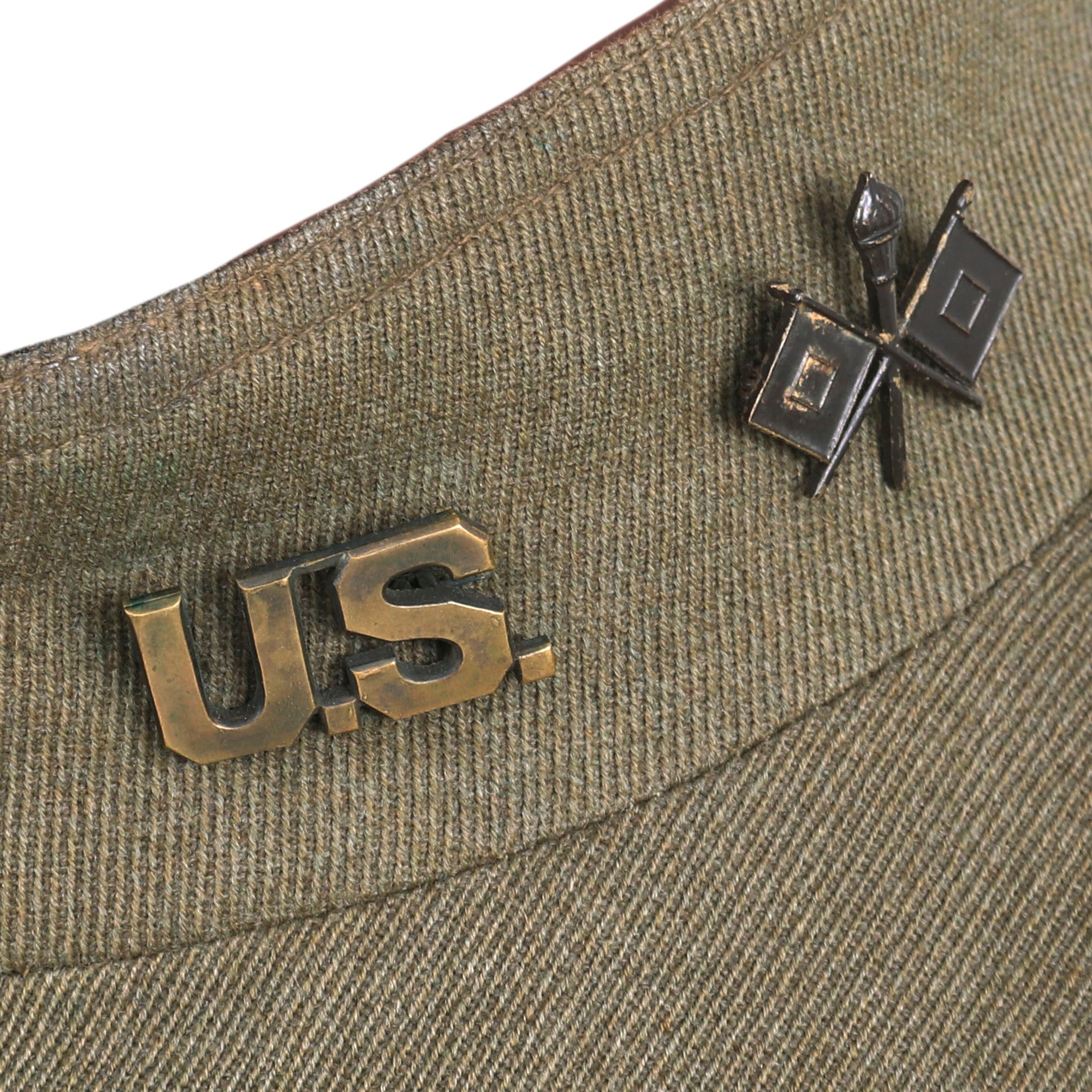 This is the Officer’s uniform grouping of Major Robert Arnold Lutz, Signal Corps, District of Paris. The grouping includes Lutz’ Parisian-made private purchase officer’s uniform jacket & breeches. The jacket was tailored at Aberdeen in Paris, and issued on April 8th, 1918. The jacket is named “Lutz” on the tag in the interior pocket, and initialed “R.A.L.” in the breeches. The jacket has a gorgeous bullion District of Paris patch and two overseas chevrons denoting 12-17 months overseas on the left shoulder, with one wound chevron on the right cuff. There are faux bullion Major rank pins on each shoulder. There are U.S. and Signal Corps officer’s insignia on the collar. Also included in the group are his overseas cap with a Major insignia pinned on, his gas mask and bag, and his leather officer’s leg gaiters. All are in great displayable condition.