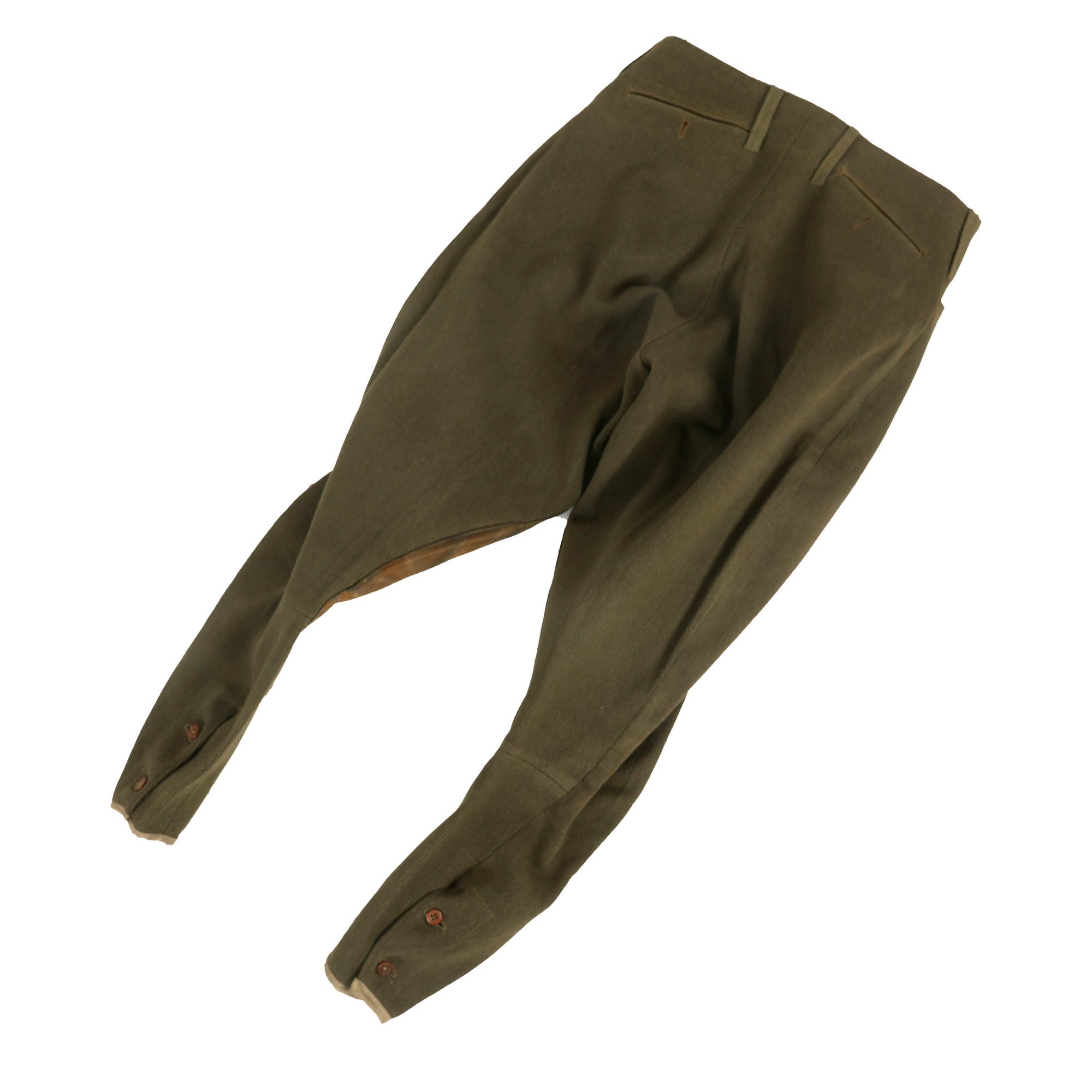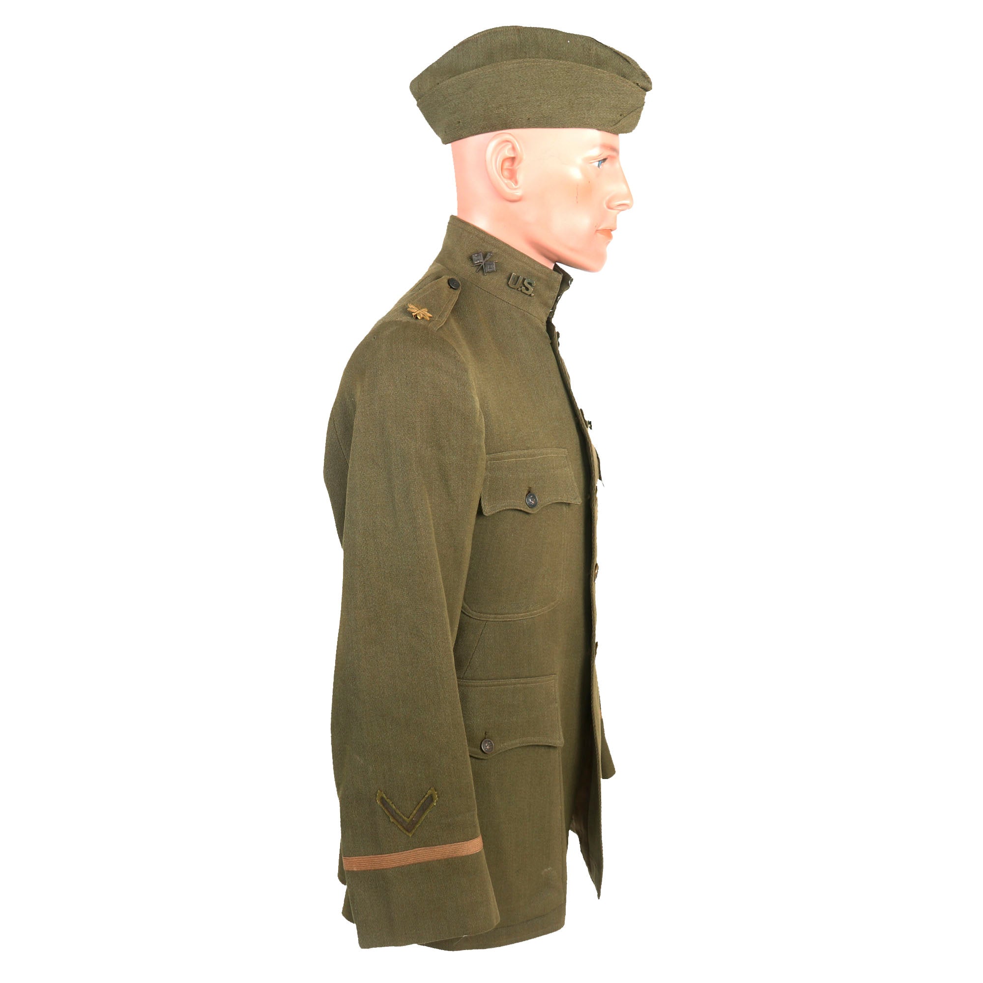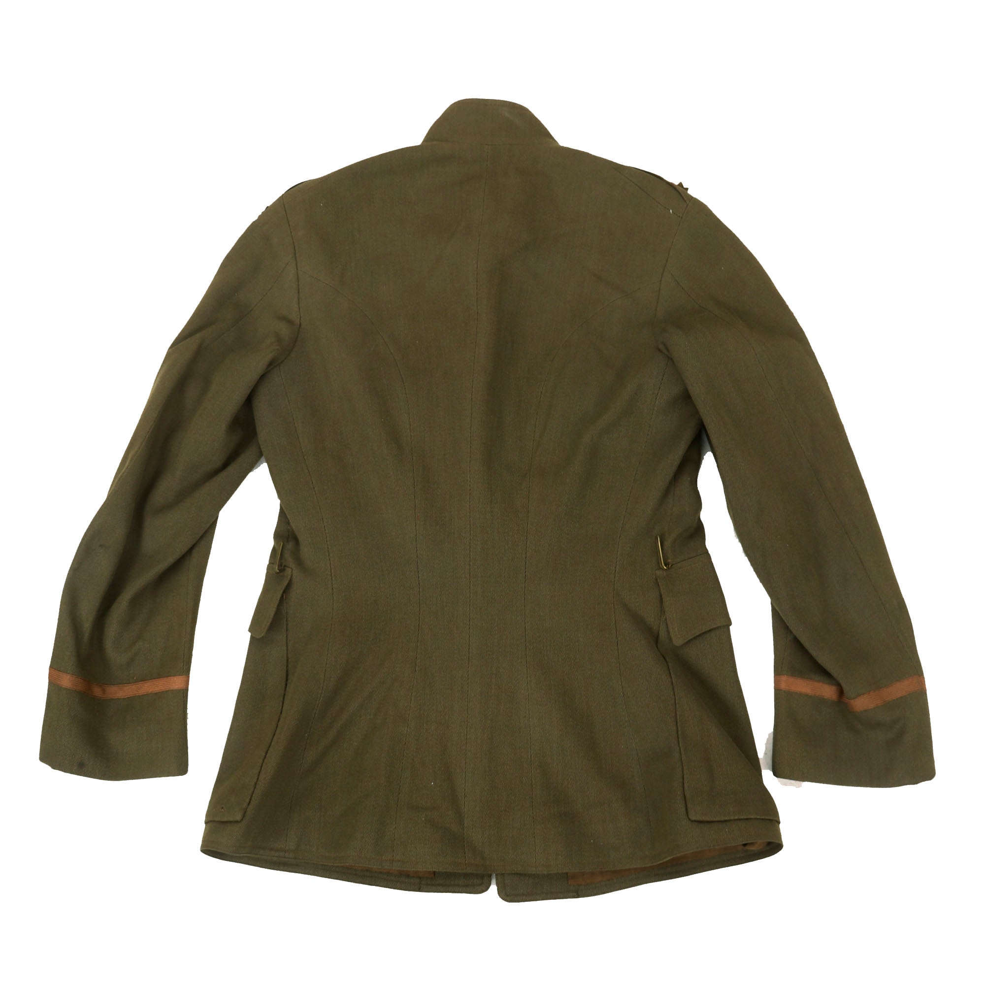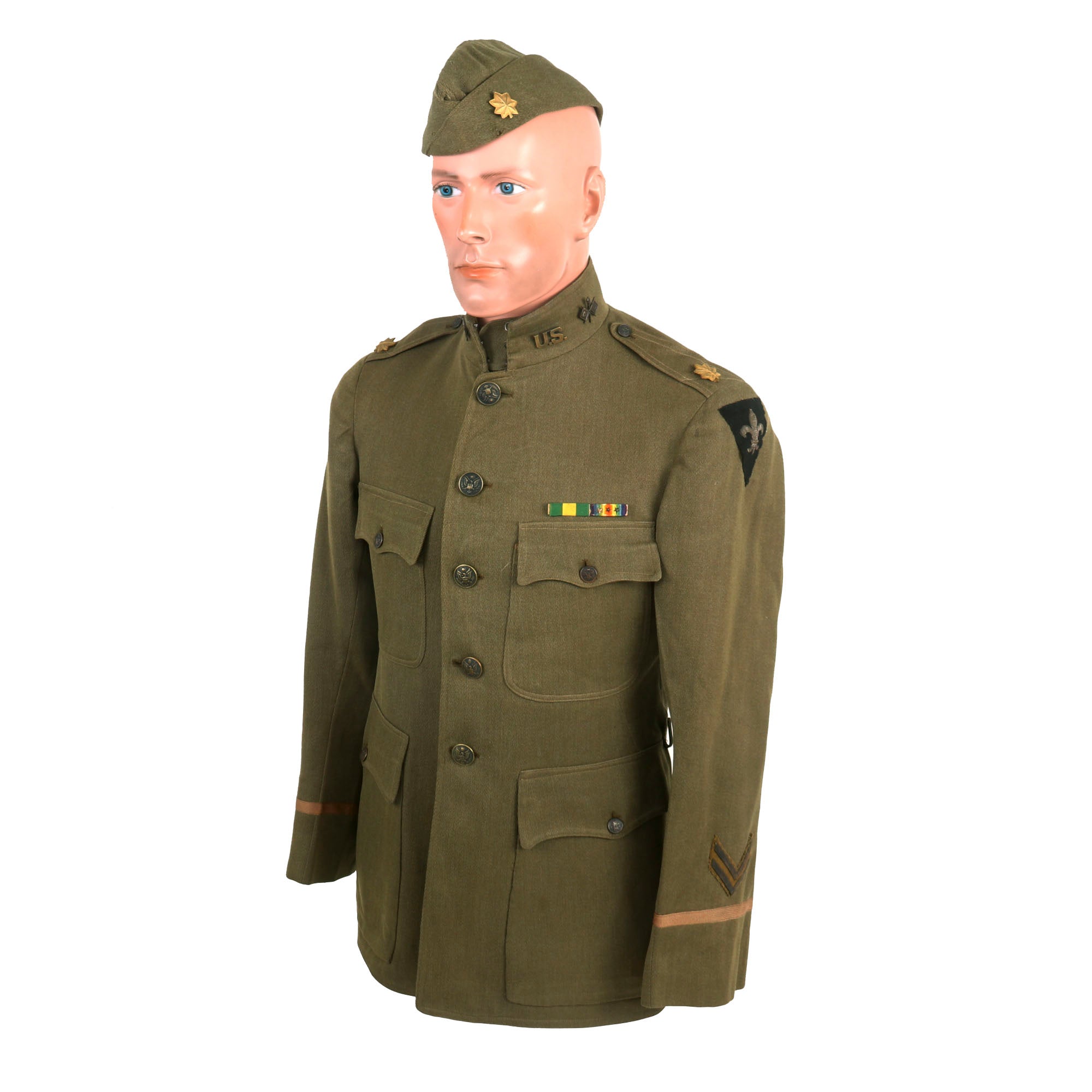 This is the Officer’s uniform grouping of Major Robert Arnold Lutz, Signal Corps, District of Paris. The grouping includes Lutz’ Parisian-made private purchase officer’s uniform jacket & breeches. The jacket was tailored at Aberdeen in Paris, and issued on April 8th, 1918. The jacket is named “Lutz” on the tag in the interior pocket, and initialed “R.A.L.” in the breeches. The jacket has a gorgeous bullion District of Paris patch and two overseas chevrons denoting 12-17 months overseas on the left shoulder, with one wound chevron on the right cuff. There are faux bullion Major rank pins on each shoulder. There are U.S. and Signal Corps officer’s insignia on the collar. Also included in the group are his overseas cap with a Major insignia pinned on, his gas mask and bag, and his leather officer’s leg gaiters. All are in great displayable condition.