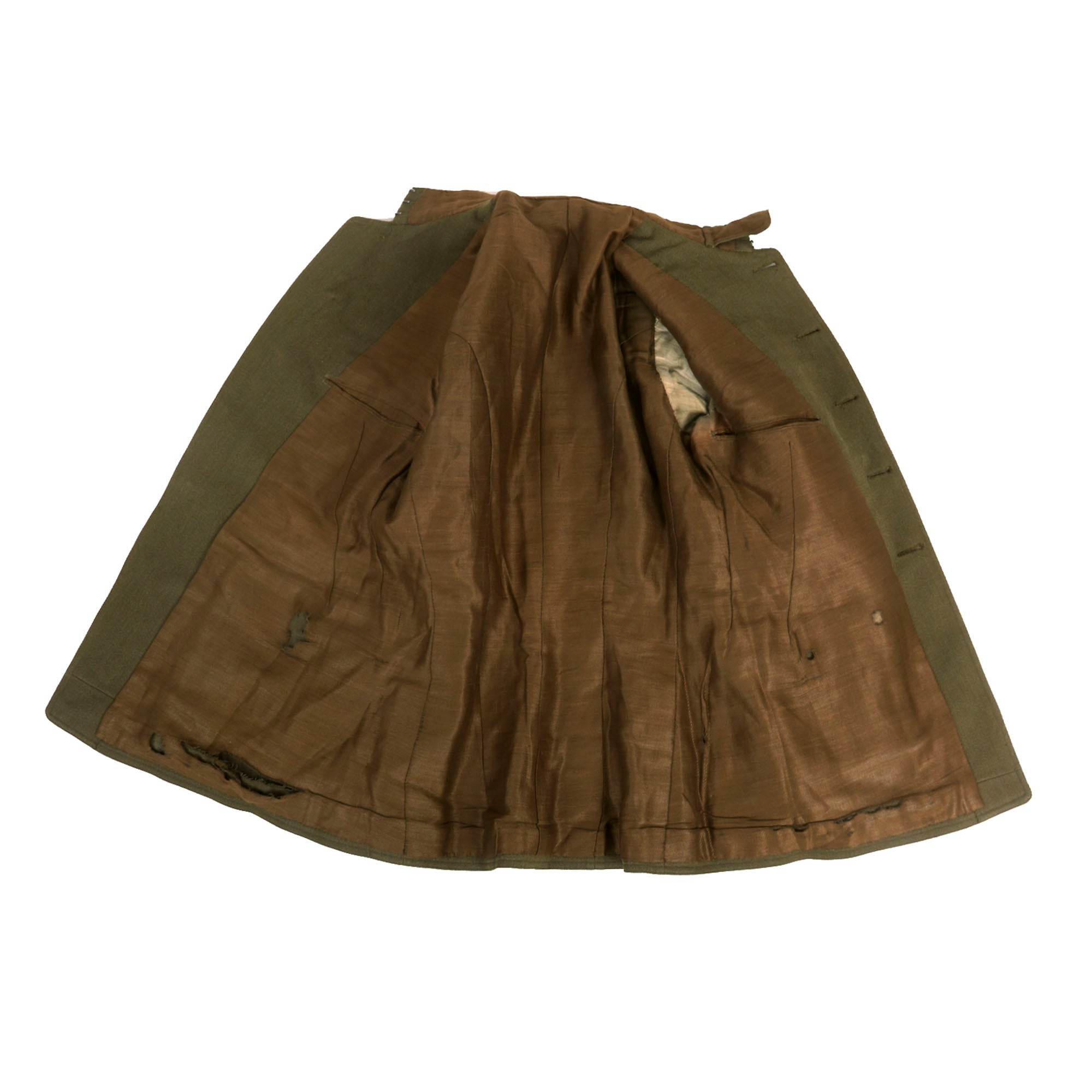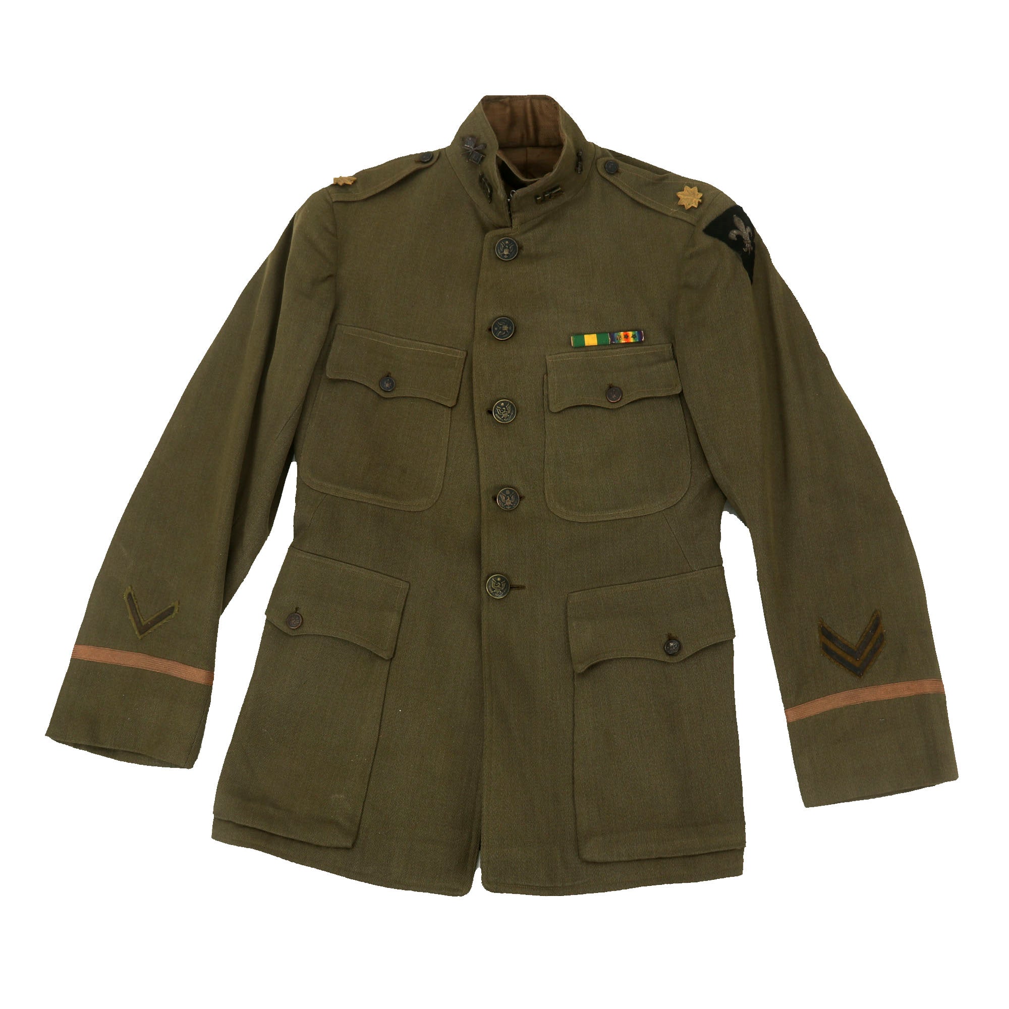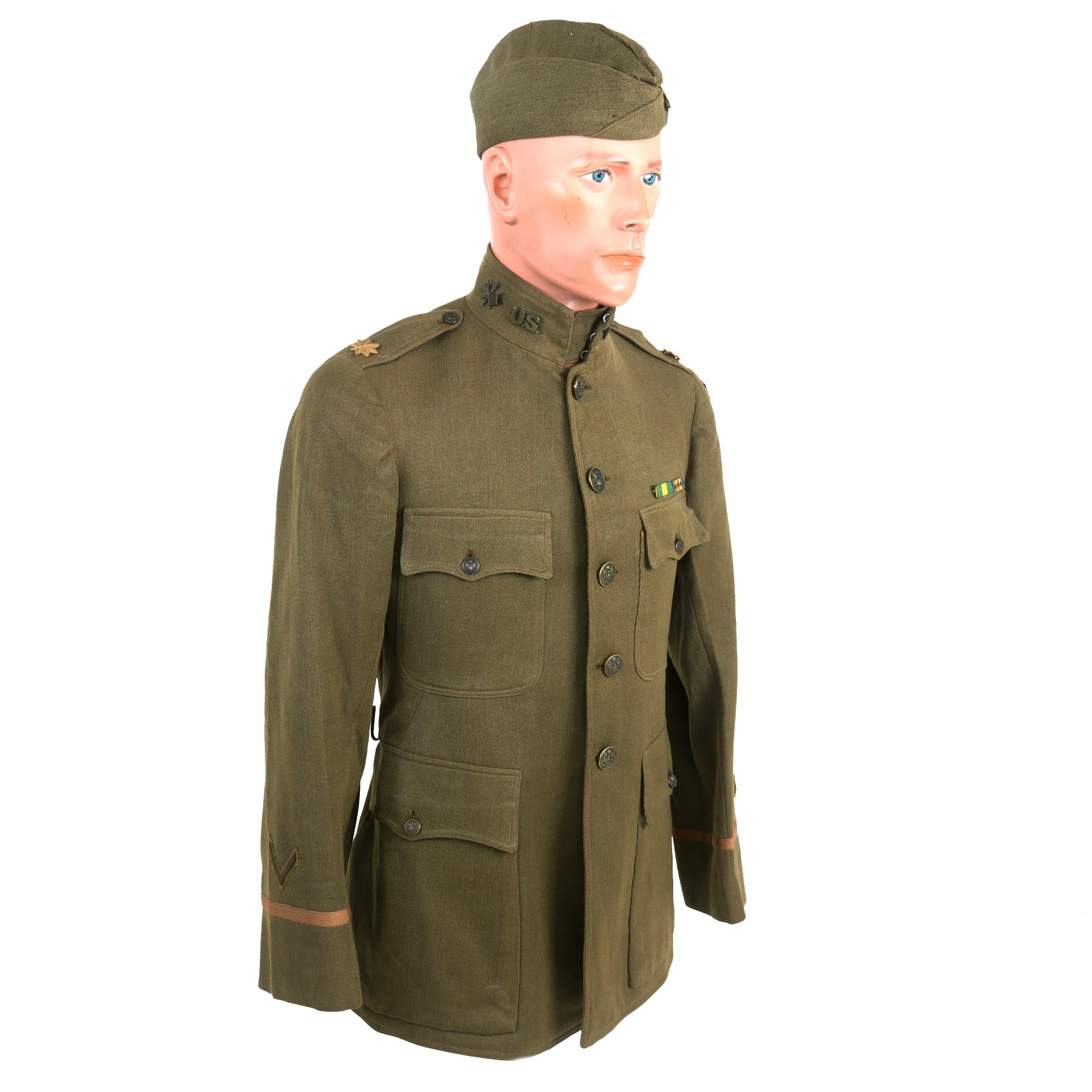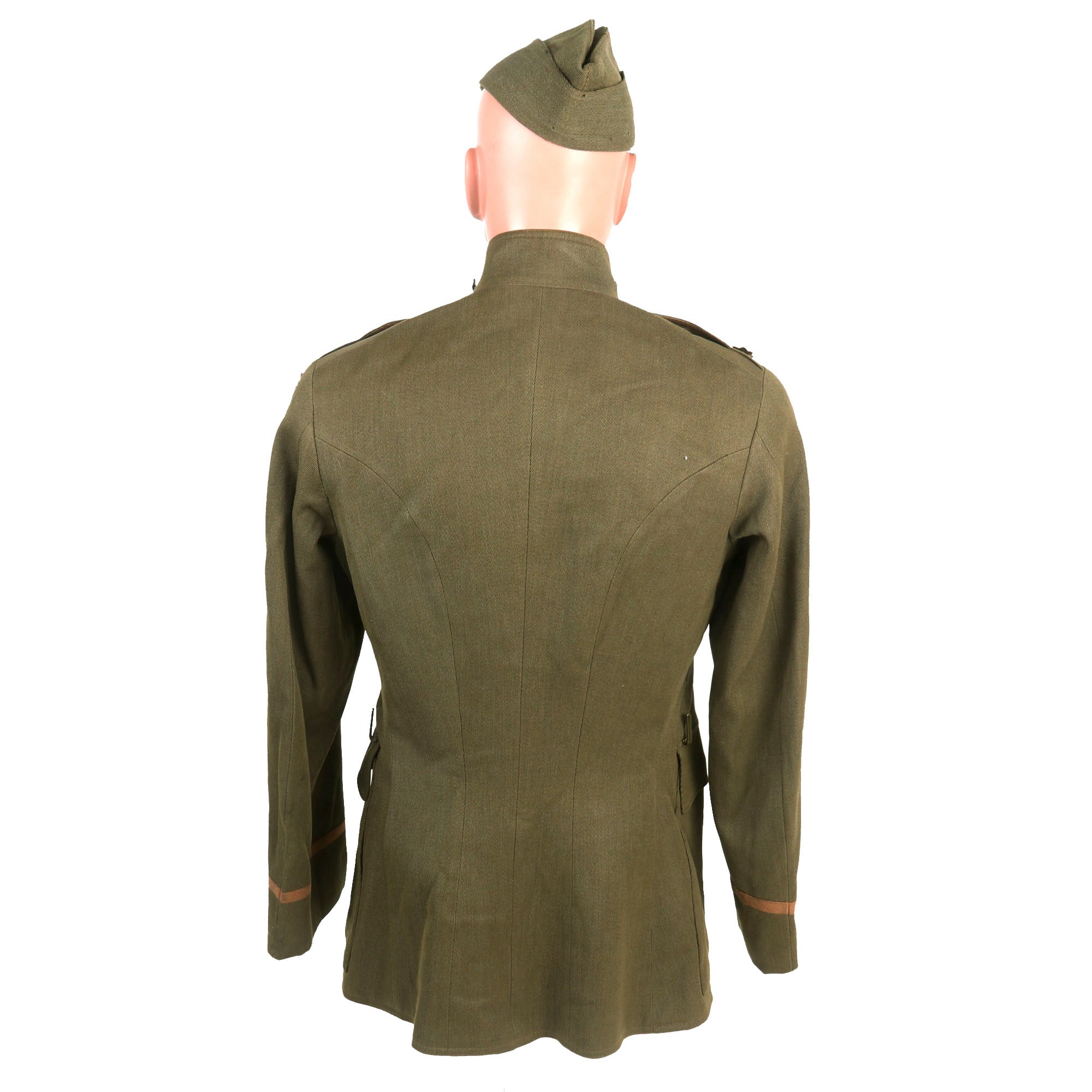 This is the Officer’s uniform grouping of Major Robert Arnold Lutz, Signal Corps, District of Paris. The grouping includes Lutz’ Parisian-made private purchase officer’s uniform jacket & breeches. The jacket was tailored at Aberdeen in Paris, and issued on April 8th, 1918. The jacket is named “Lutz” on the tag in the interior pocket, and initialed “R.A.L.” in the breeches. The jacket has a gorgeous bullion District of Paris patch and two overseas chevrons denoting 12-17 months overseas on the left shoulder, with one wound chevron on the right cuff. There are faux bullion Major rank pins on each shoulder. There are U.S. and Signal Corps officer’s insignia on the collar. Also included in the group are his overseas cap with a Major insignia pinned on, his gas mask and bag, and his leather officer’s leg gaiters. All are in great displayable condition.