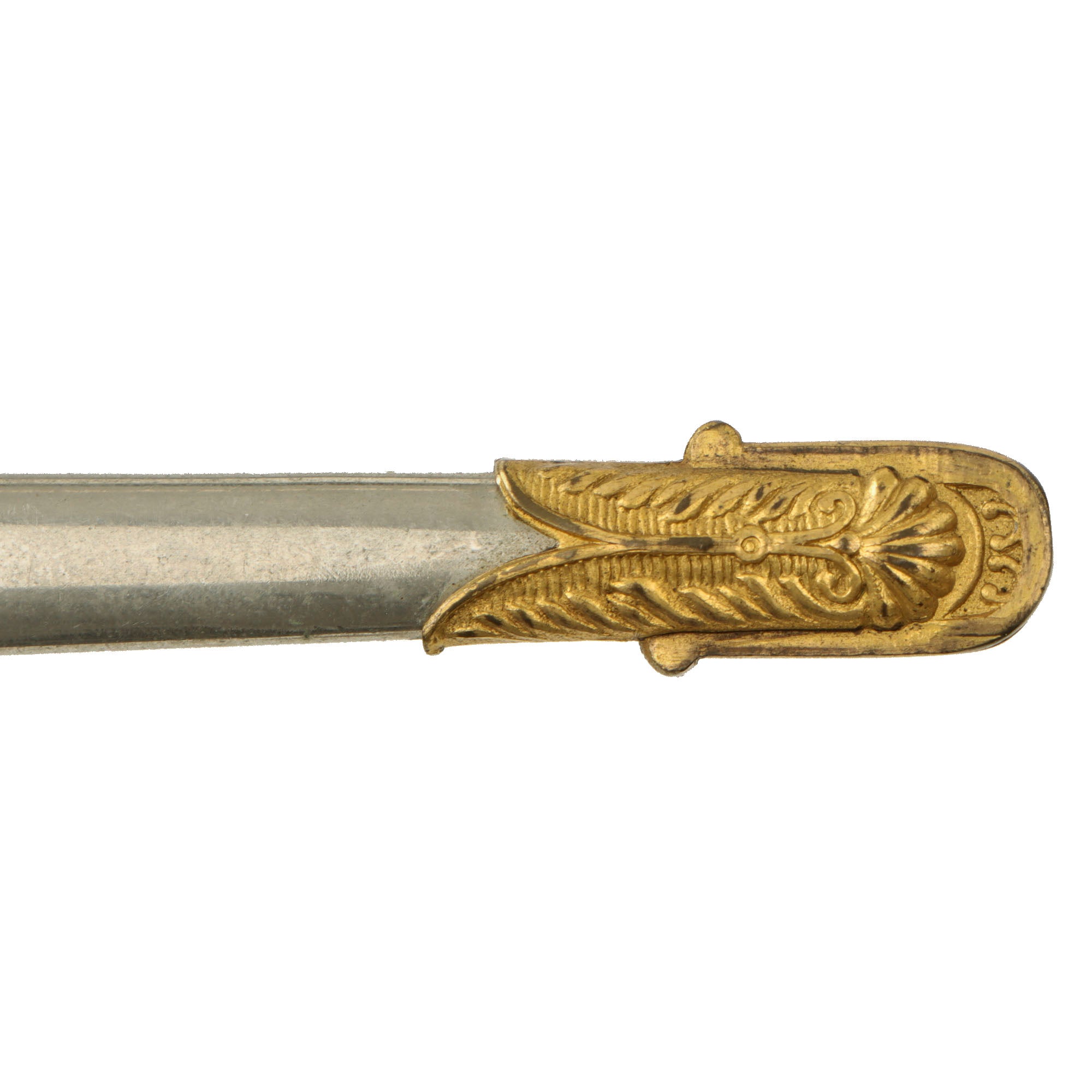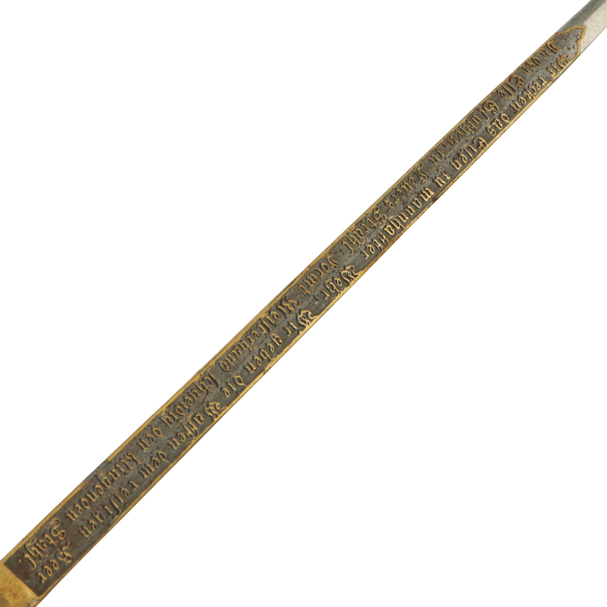 Definitely a message extolling the skill and quality of the weapons produced in Solingen. The gilding is very well-retained on the blade, and the red felt blade buffer is retained as well! The included scabbard is nickel plated brass, and is in great shape.