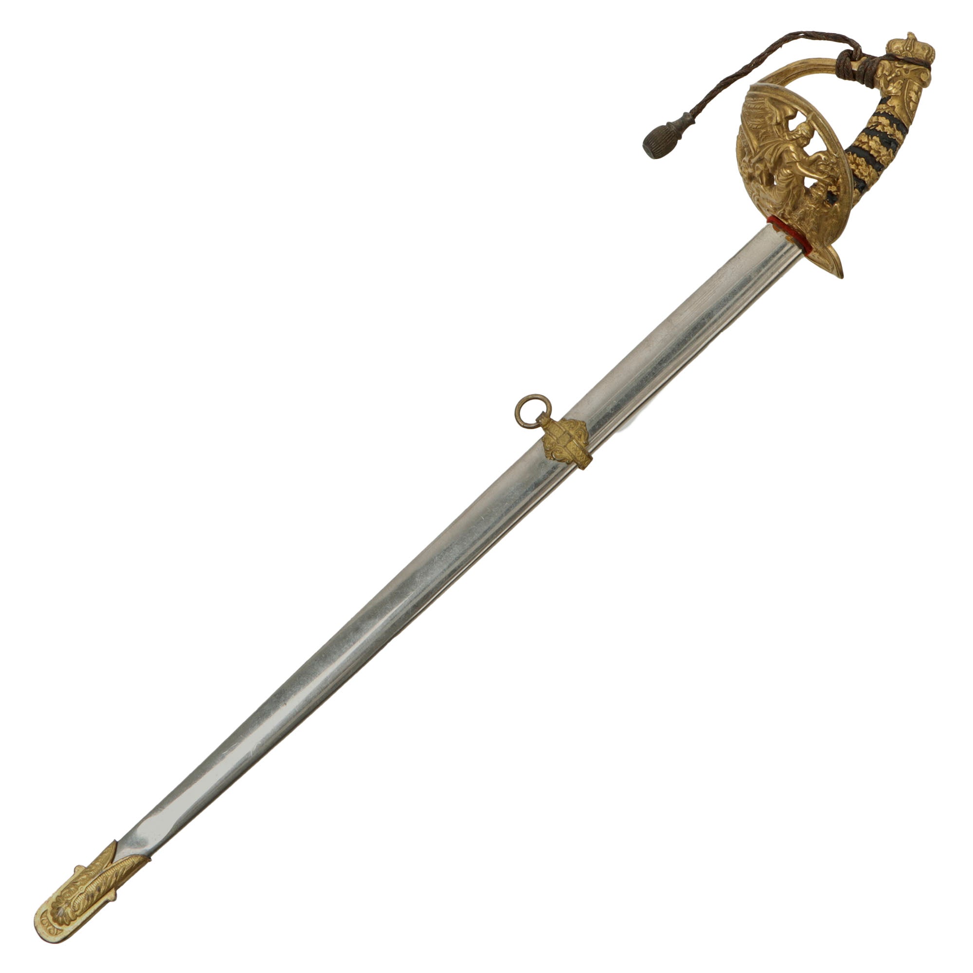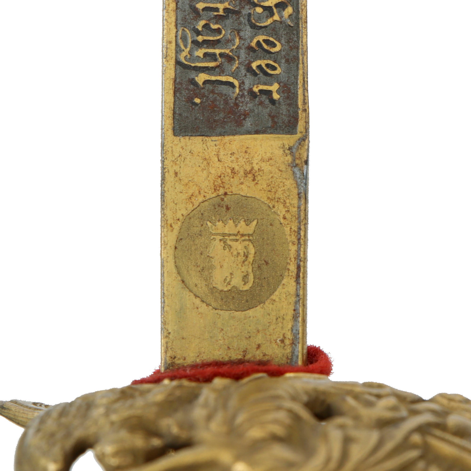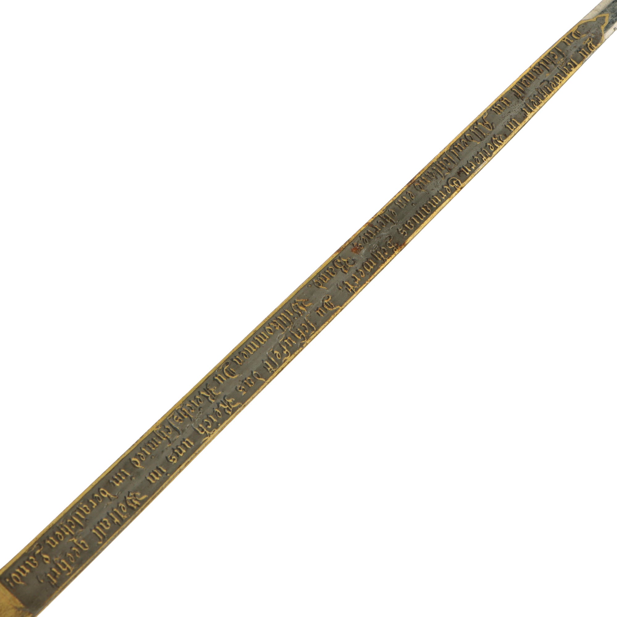 Original Item: Only One Available. This is a wonderful condition Imperial German late 19th Century Miniature Model 1889 Infantry Officer Kaiser Honor sword and scabbard, with a very nice etched blade. The sword measures 11 3/8 inches with a blade of 9 inches long. These were made as miniature copies of the Honor Sword made in Solingen for Kaiser Wilhelm II circa 1895, and we have seen various different versions of these. Some were distributed on "Kaiser Day", while others such as this one are etched with a message describing the glory of Solingen, the legendary "City of Blades". These were often purchased as souvenir items, and would be given to friends or other associates.