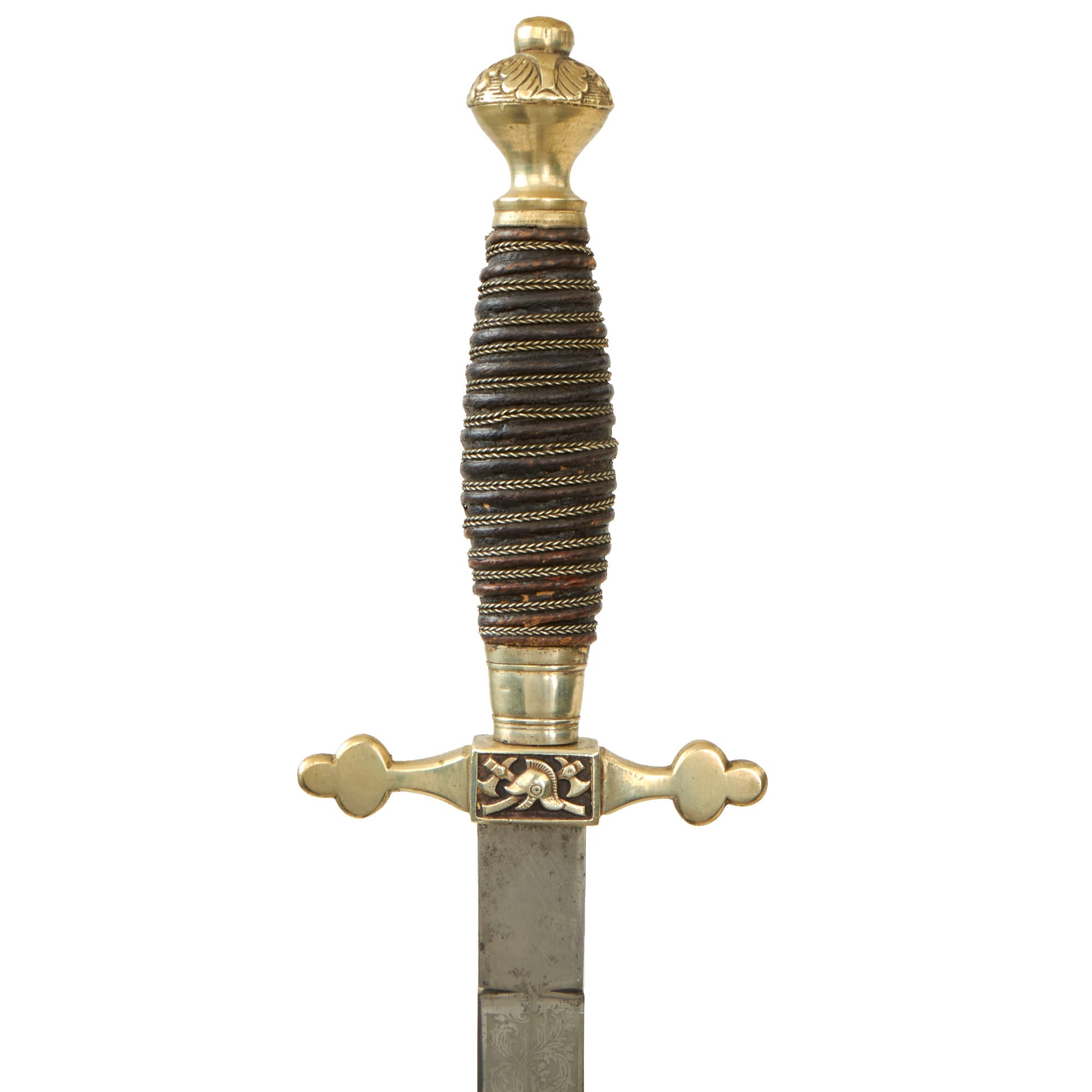 This example is typical, with nickel-plated brass fittings, and a leather covered wooden handle, wrapped with wire. The crossguard is engraved with a combed fire helmet over crossed axes, a timeless firefighting emblem. The leather on the grip has degraded somewhat, but otherwise the hilt is in excellent condition, with the wire wrap still in good shape.