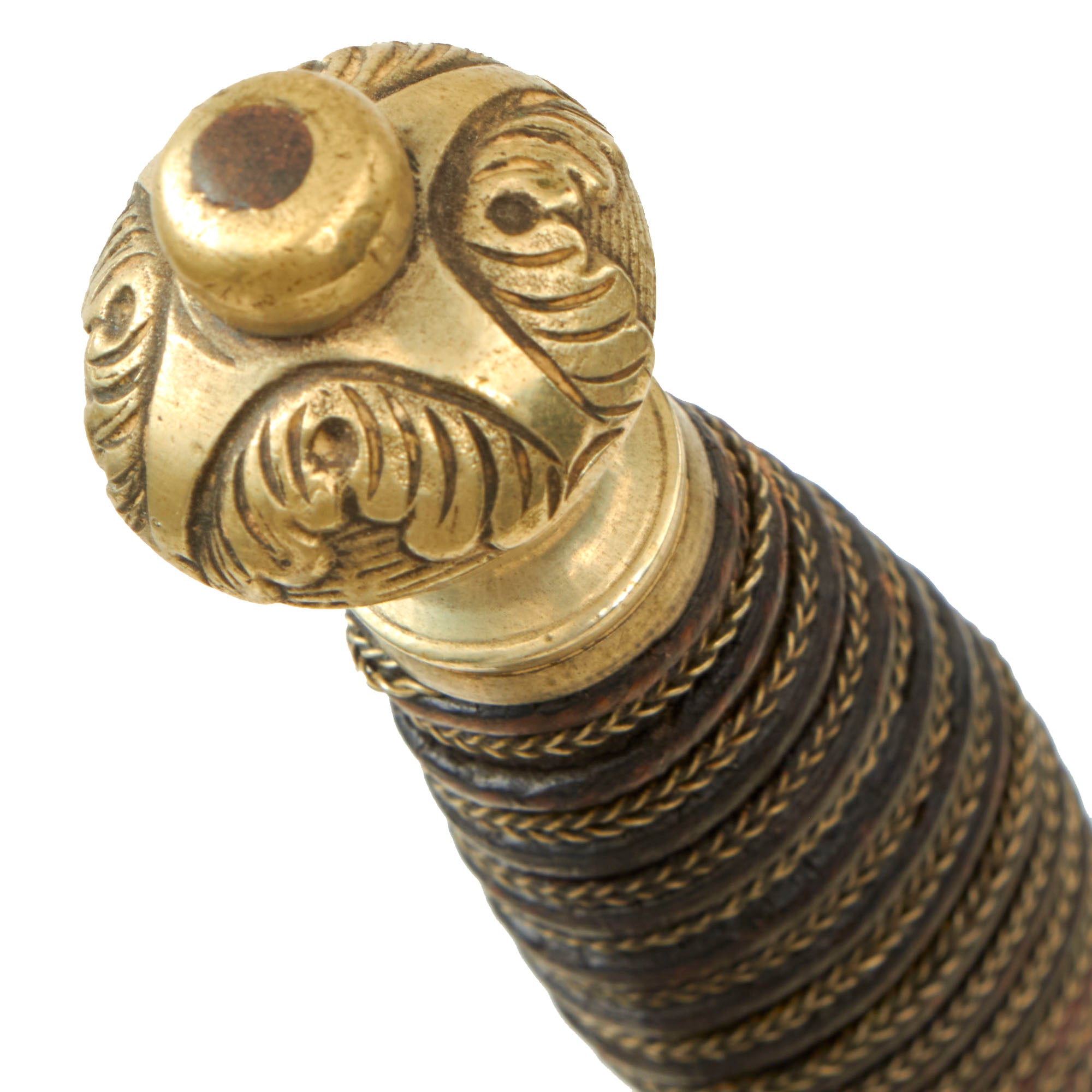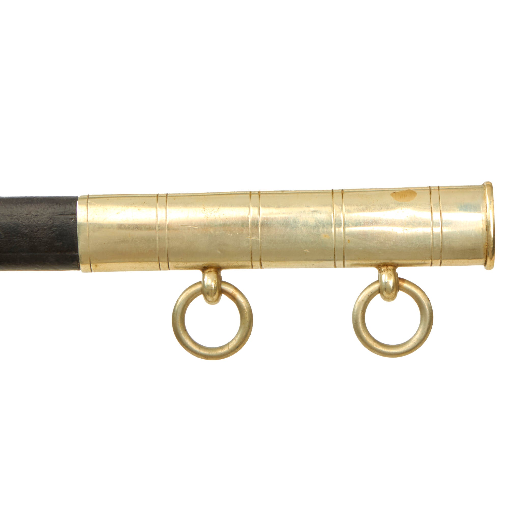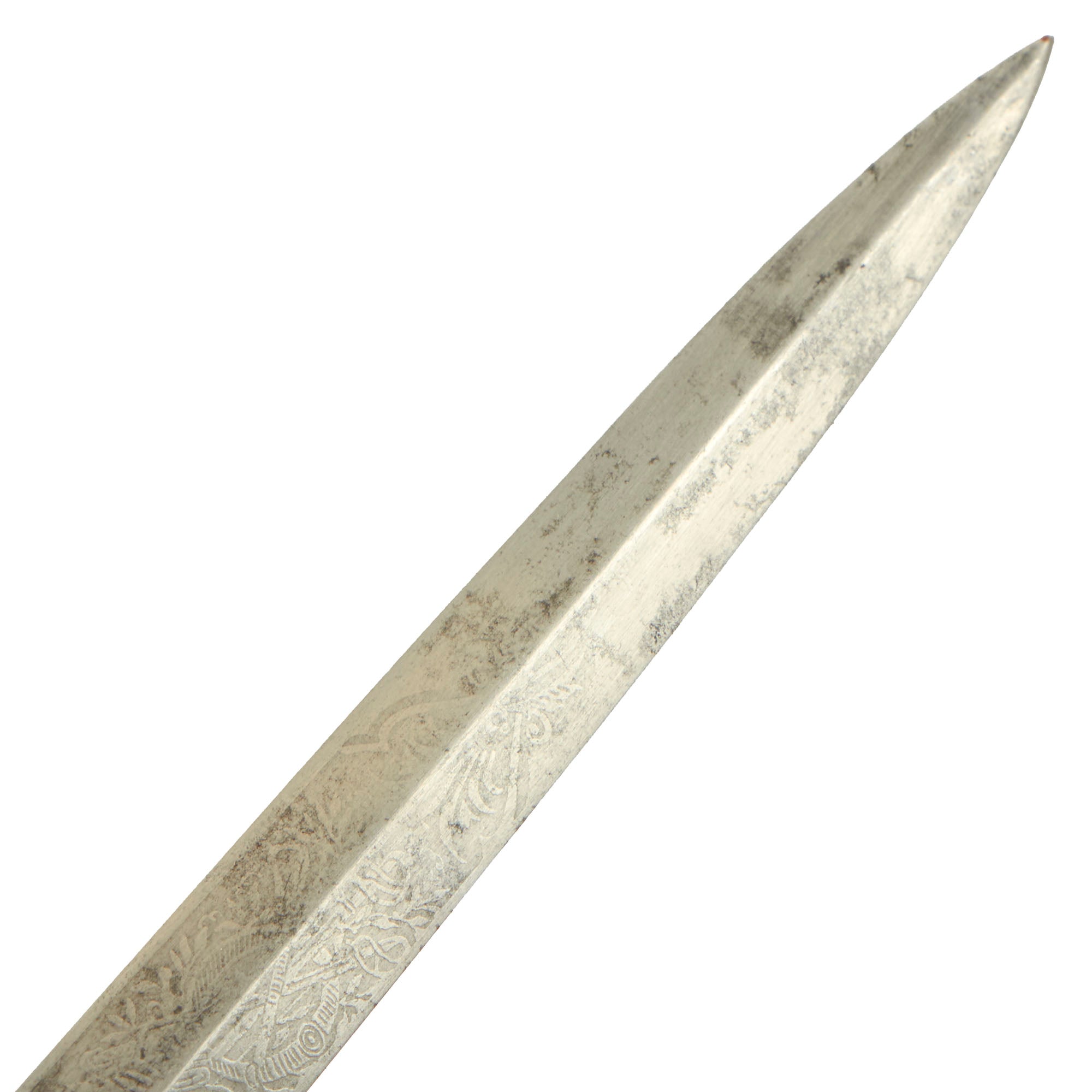 The nickel finish is very well retained, with the usual runner wear and some light oxidation near the tip, where the plating is most worn. The nickel-plated brass mounted leather scabbard is in great shape with most of the finish on the leather retained. Both suspension rings are well-retained.