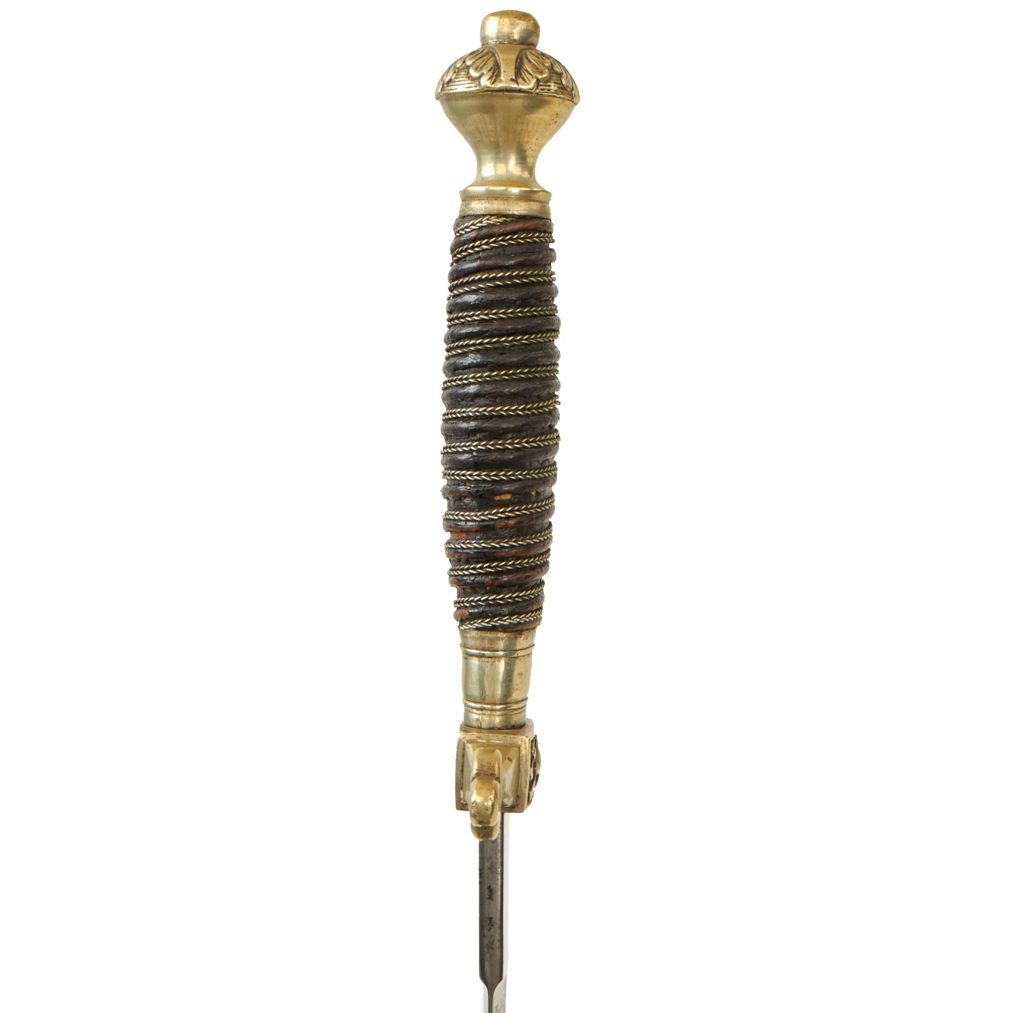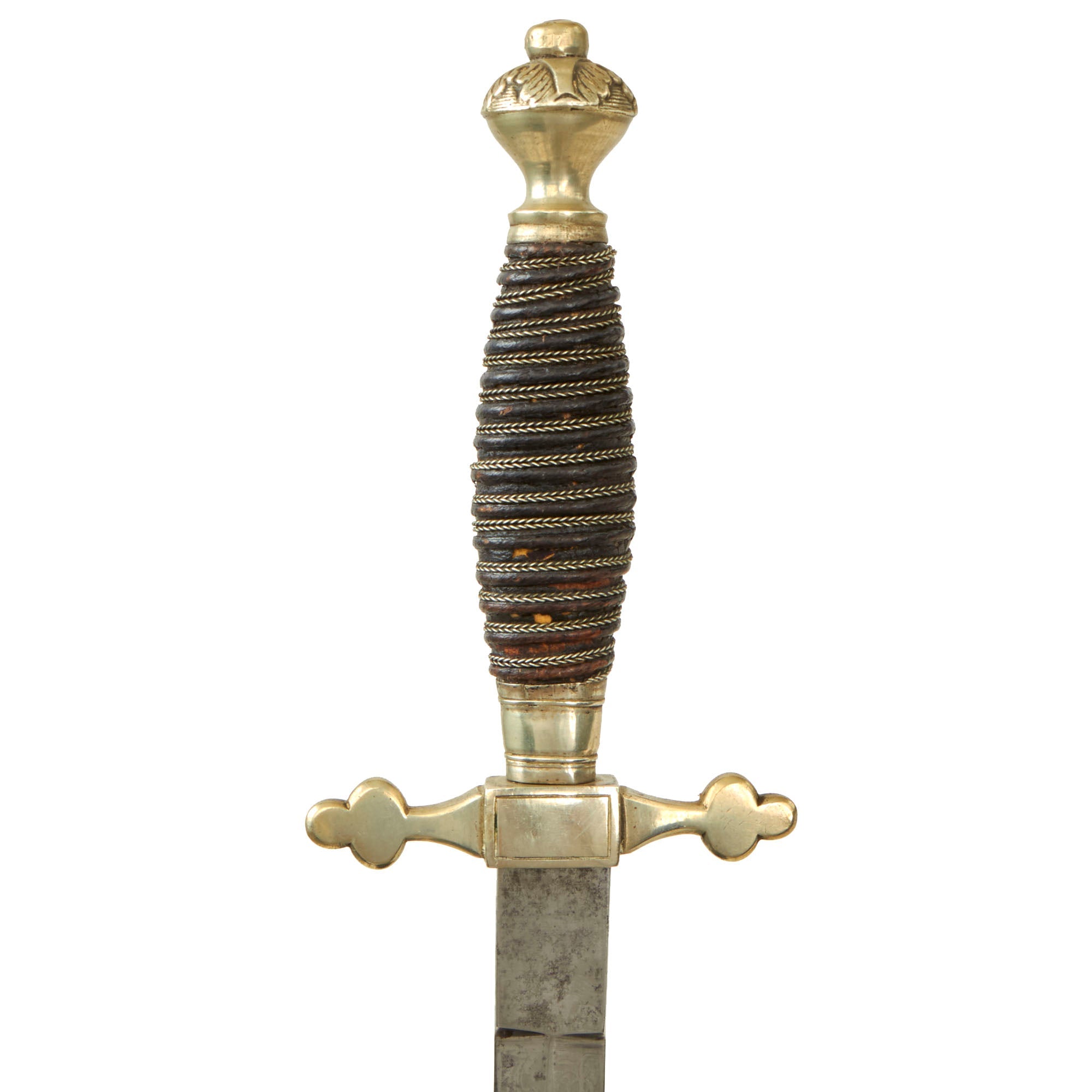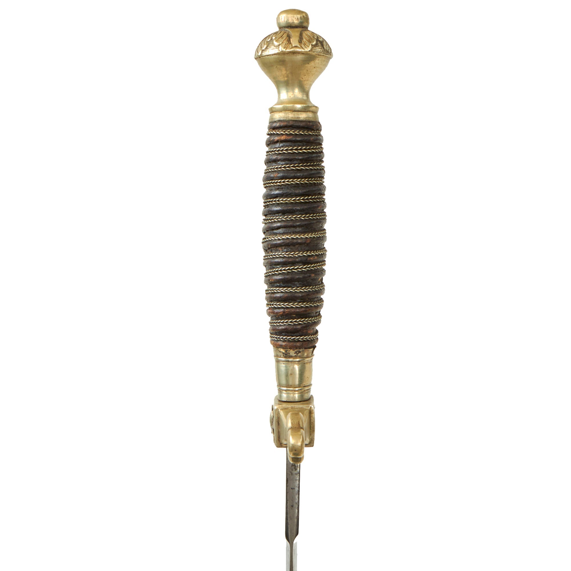 The nickel finish is very well retained, with the usual runner wear and some light oxidation near the tip, where the plating is most worn. The nickel-plated brass mounted leather scabbard is in great shape with most of the finish on the leather retained. Both suspension rings are well-retained.