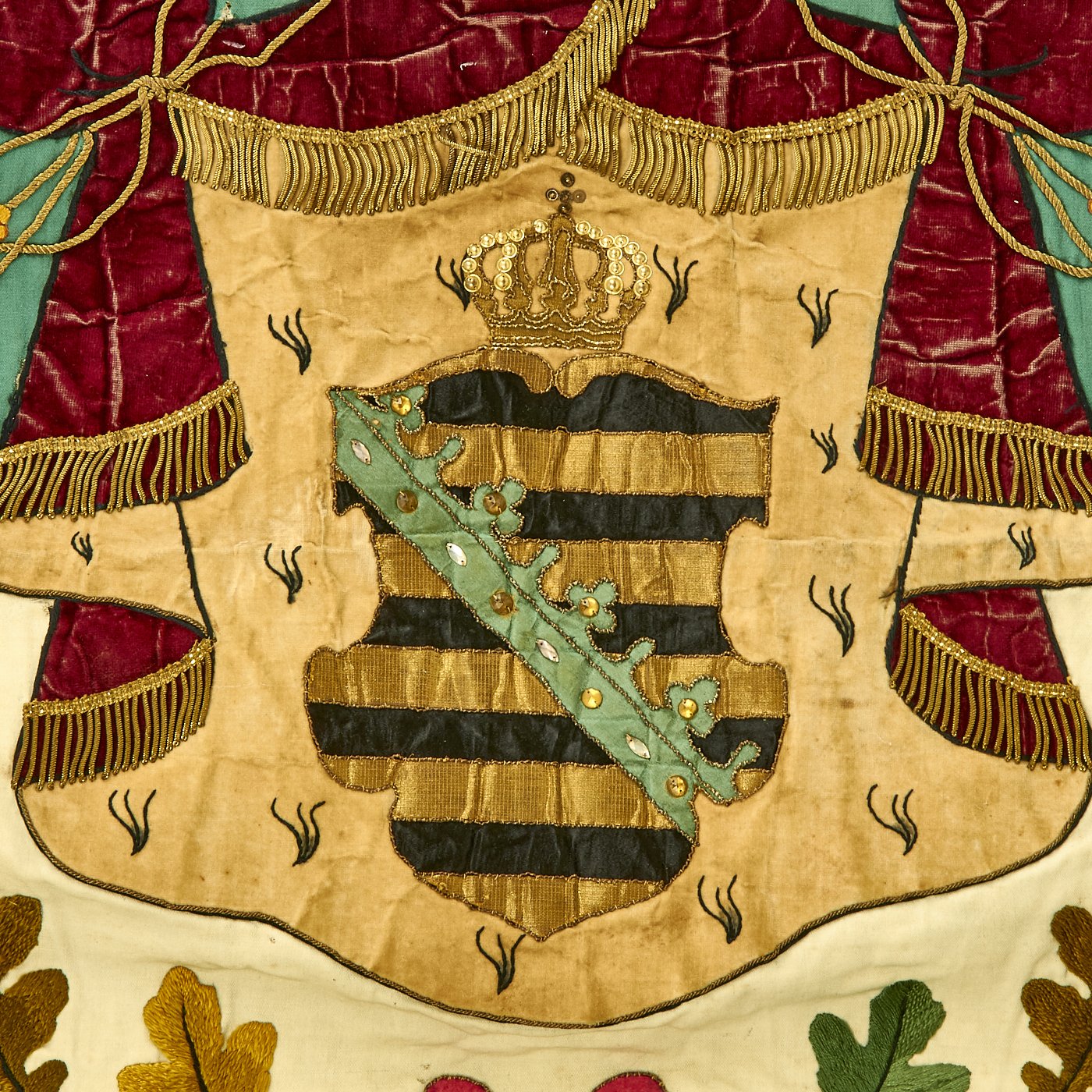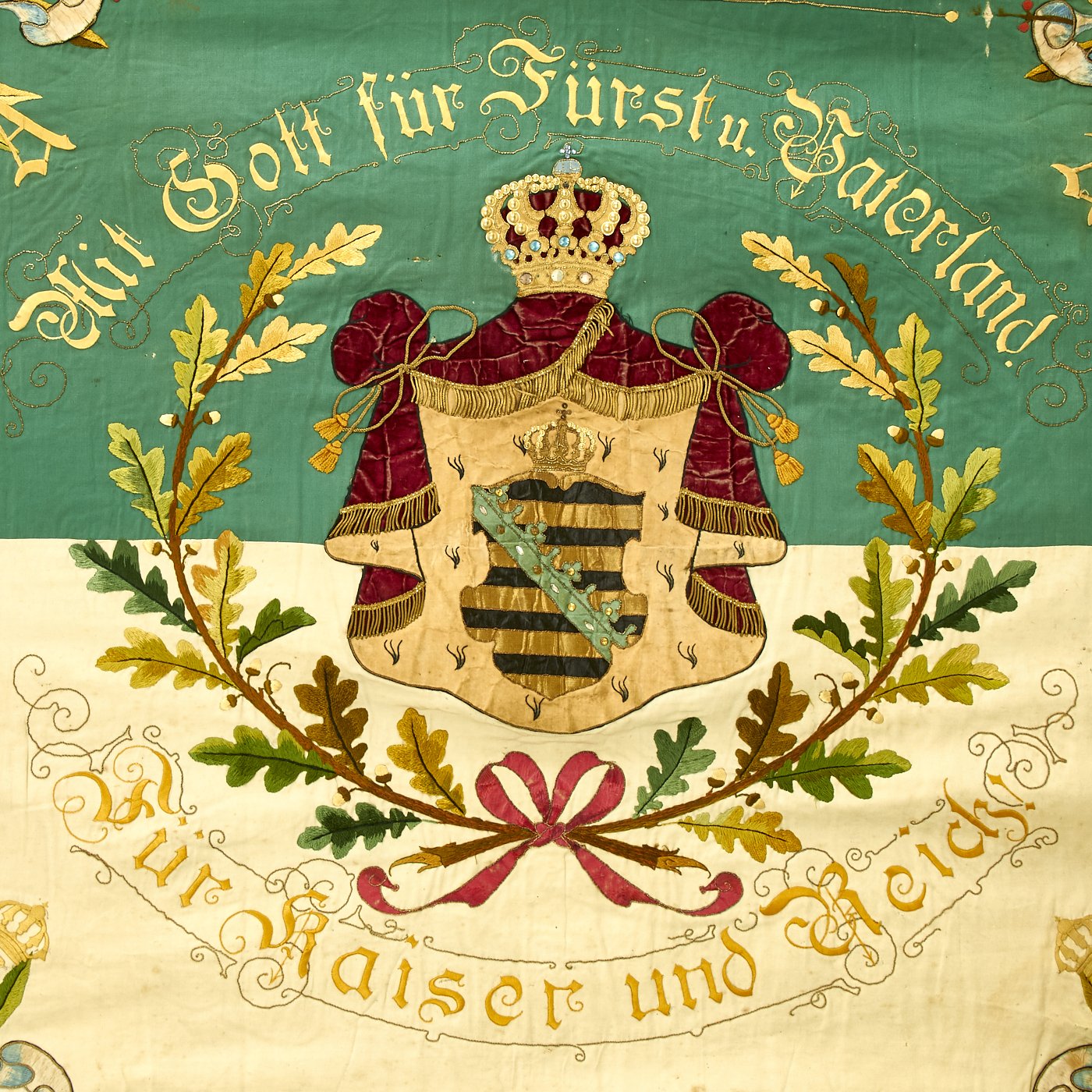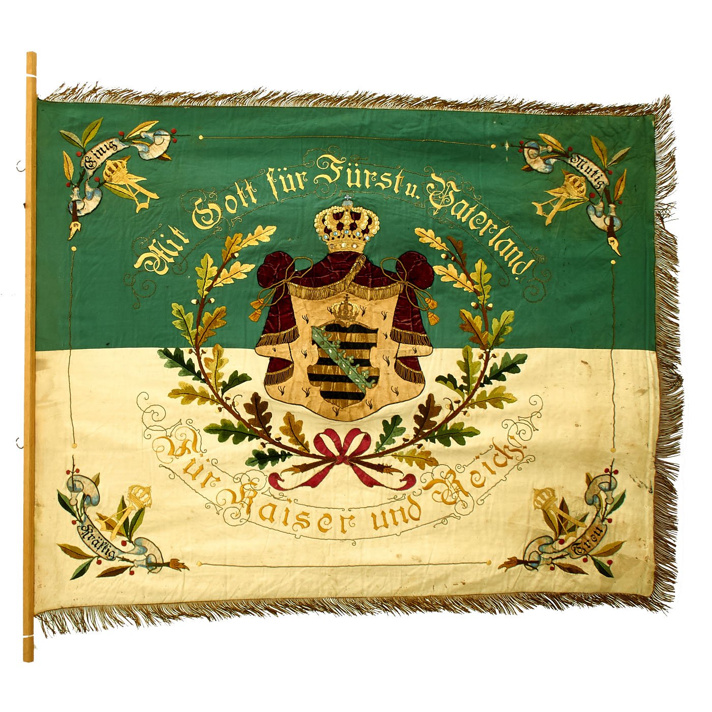 The front, or Saxon side of the flag has a Green and White background, the State Colors of Saxony. The center of course has the Coat of Arms of the Kingdom of Saxony under a crown, which itself is surrounded by an embroidered Banner. Around this is an Oak leaf wreath, which is surrounded by the phrases: Mit Gott für Fürst u. Vaterland (With God for Prince and Fatherland) and Für Kaiser und Reich (For Emperor and Country).