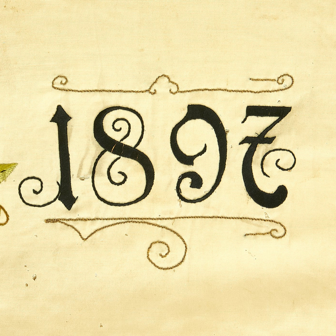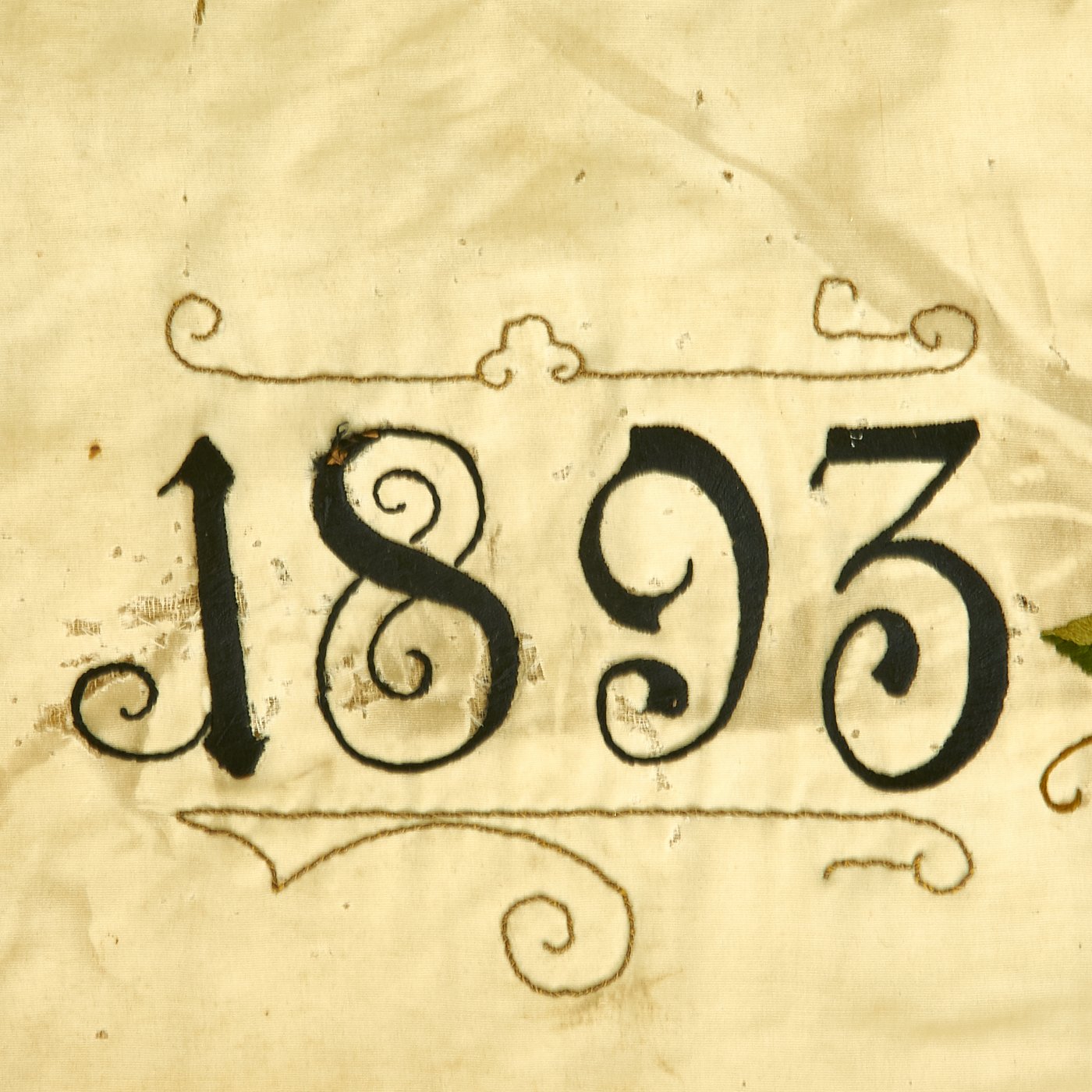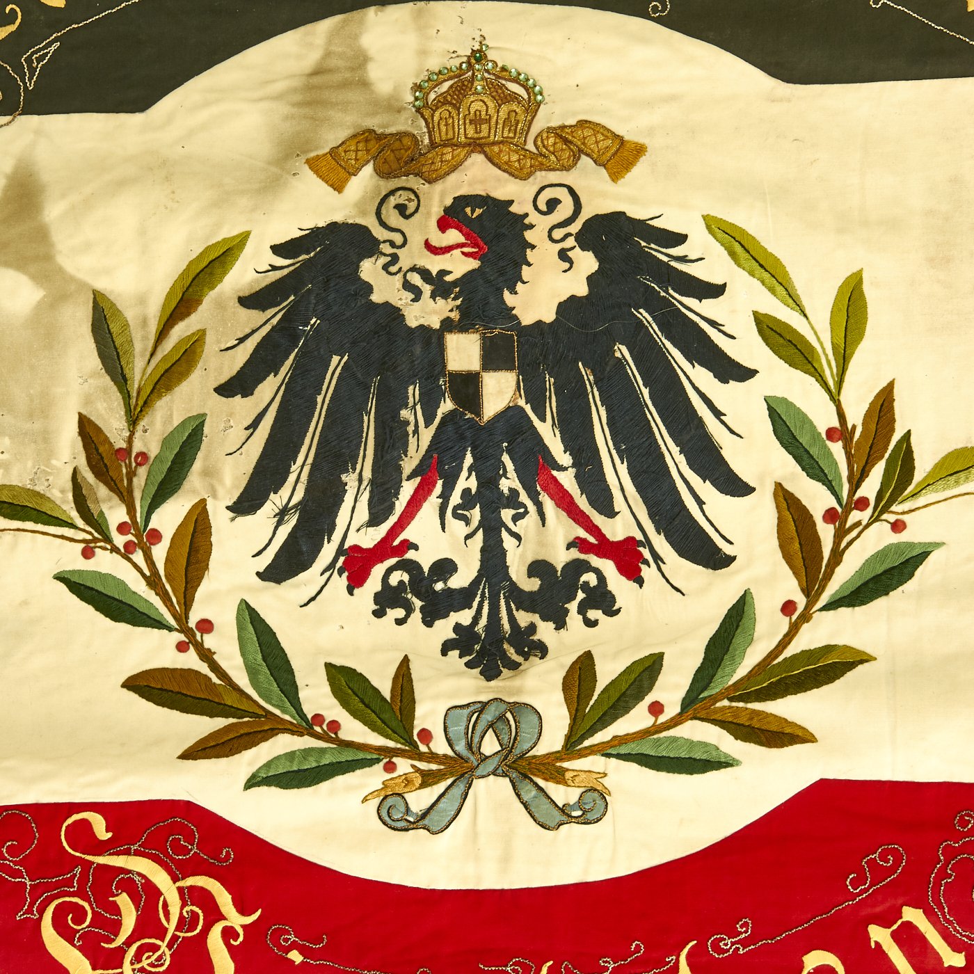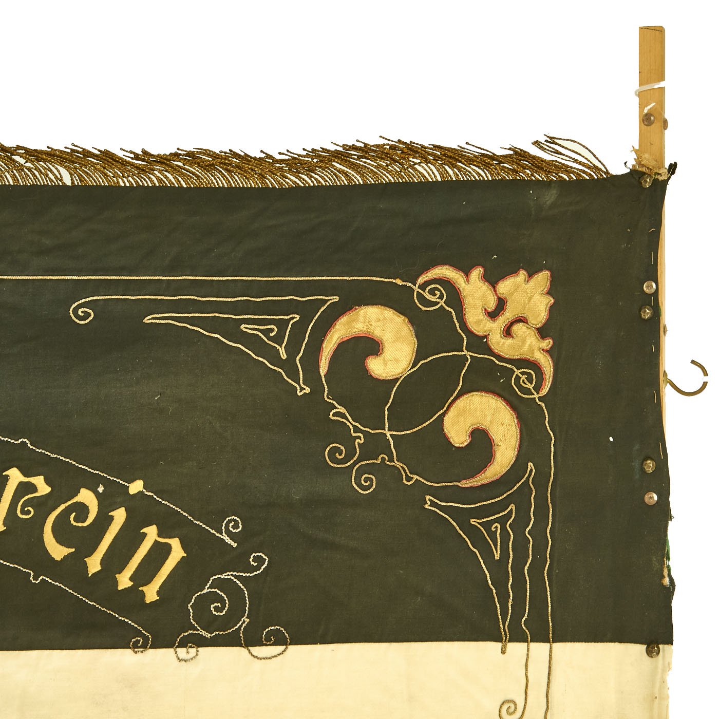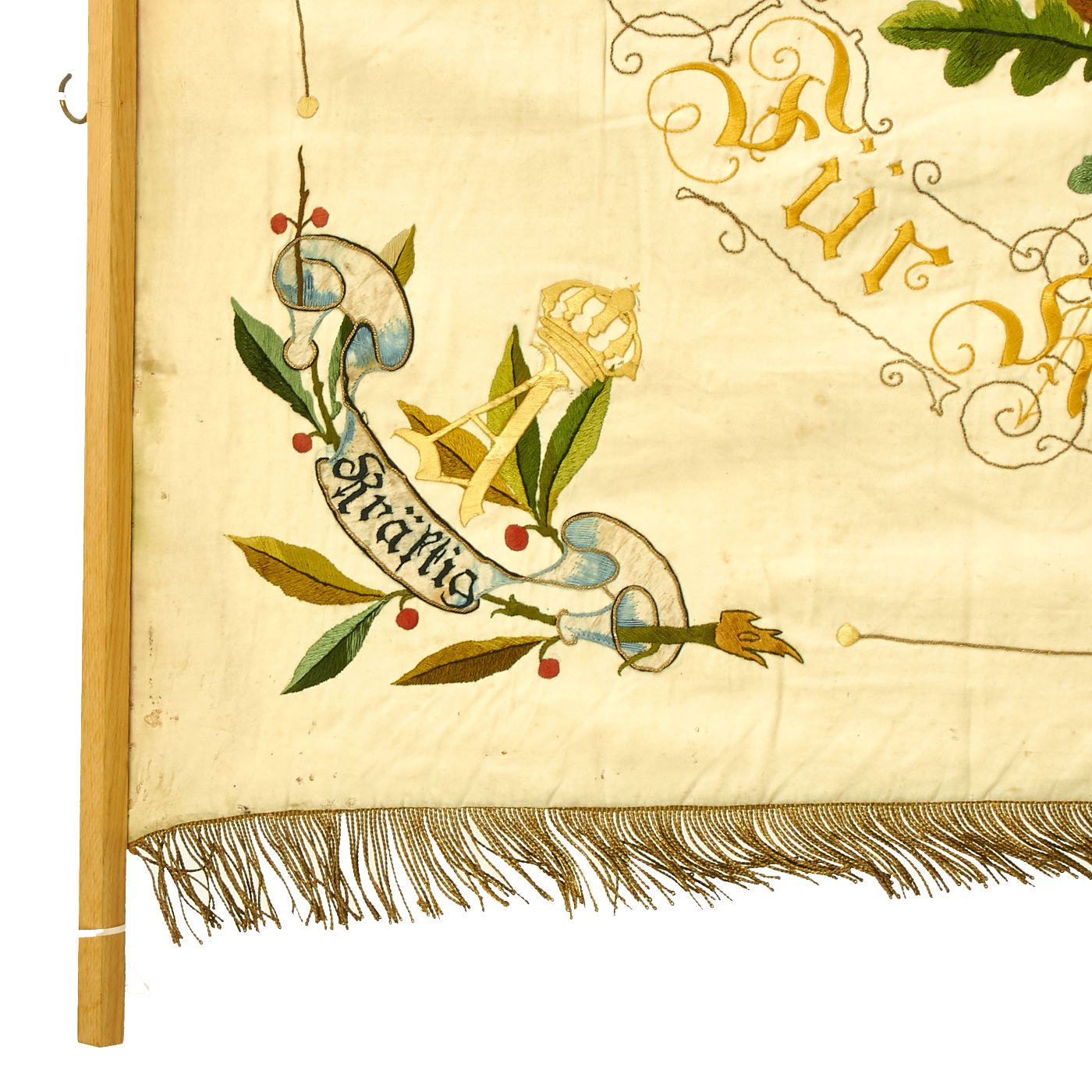 The rear of the flag has the Imperial Black White and Red colors as a background, with a lovely bullion embroidered border around the edge. In the center is the Coat of Arms of the Kingdom of Prussia, and eagle with a Black/White Shield on its breast, surrounded by a Laurel wreath. The years 1893 and 1897 are embroidered on either side, and around this are the embroidered German words Landwehr-Verein (Landwehr Association) and Wiegleben, which is an area in Germany. We are not quite sure about the location, as the ornate Blackletter Script is hard to decipher.