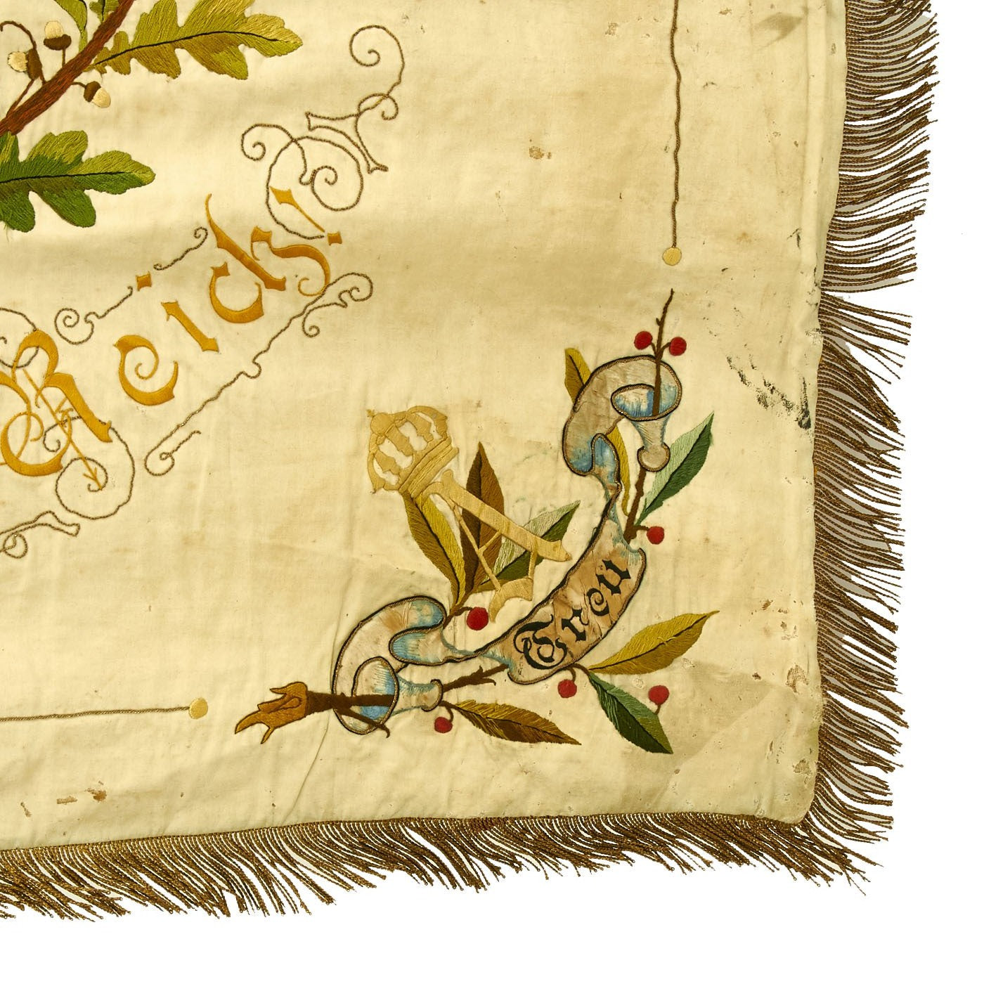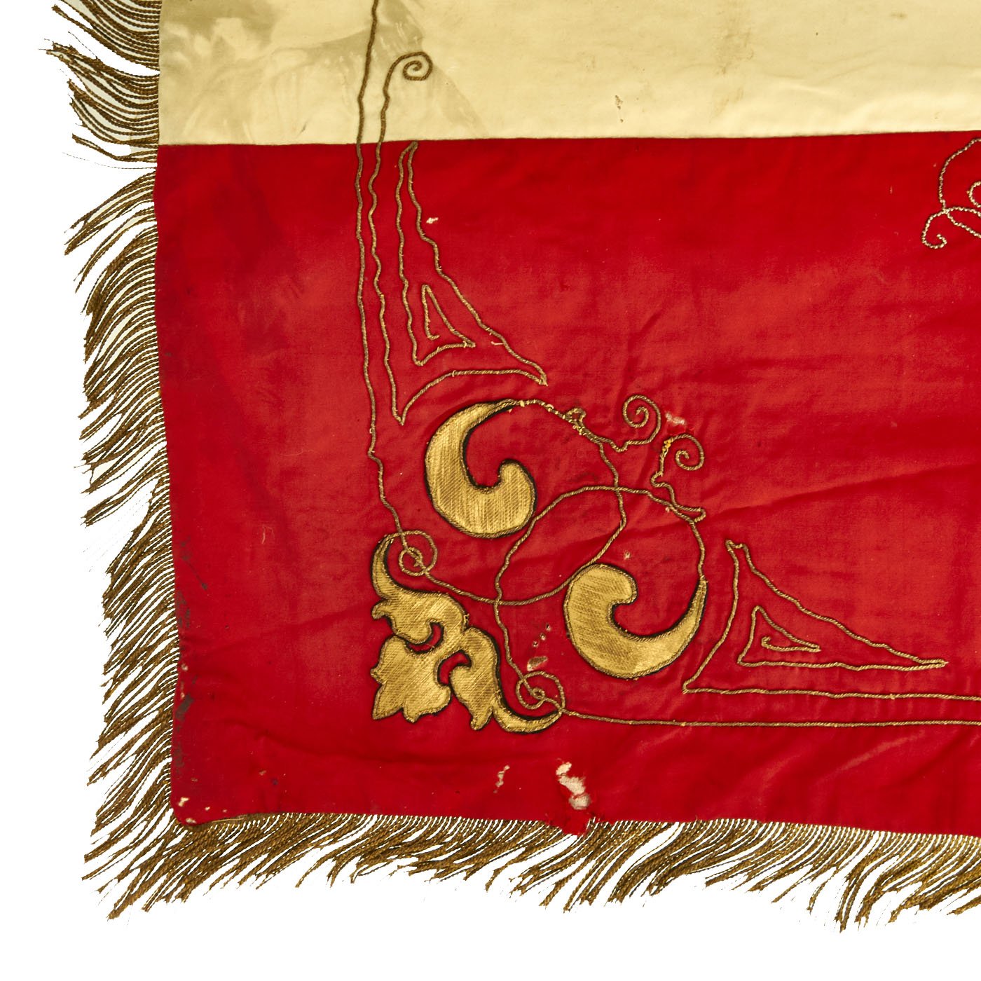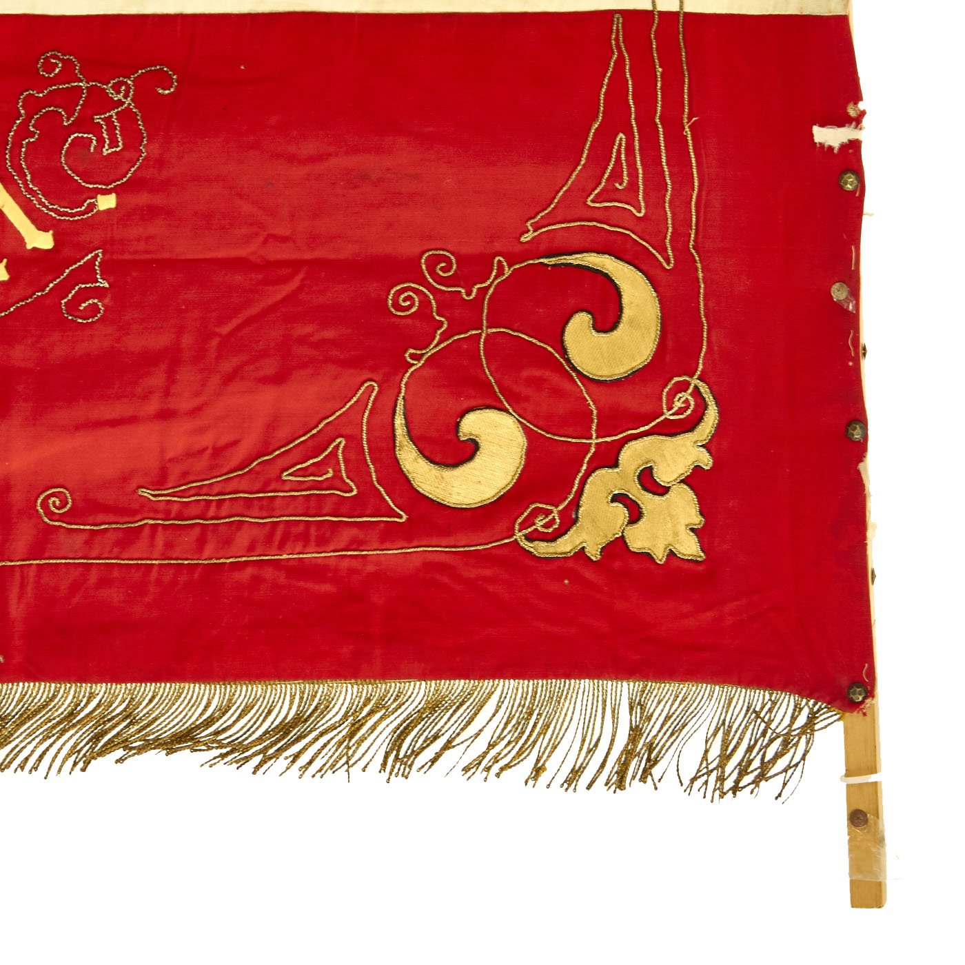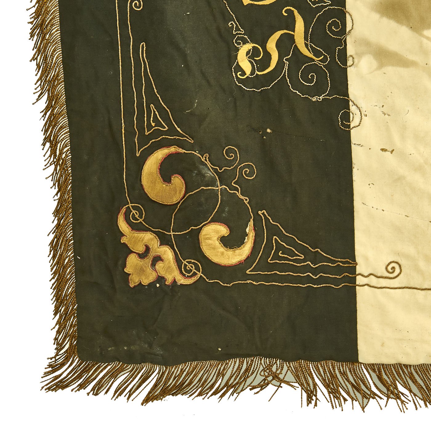 Original Item: Only one available. This flag came from a large collection in the Pacific Coast of the United States and is a spectacular item! It measures a very displayable 56-inches wide by 47-inches tall, with a bullion fringe going around three of four sides. It is double sided, and is of what looks to be cotton construction, with lots of embroidery, including lots using bullion thread. There are even bullion fringes embroidered onto the flags in the design! And immense amount of time must have gone into this lovely flag.