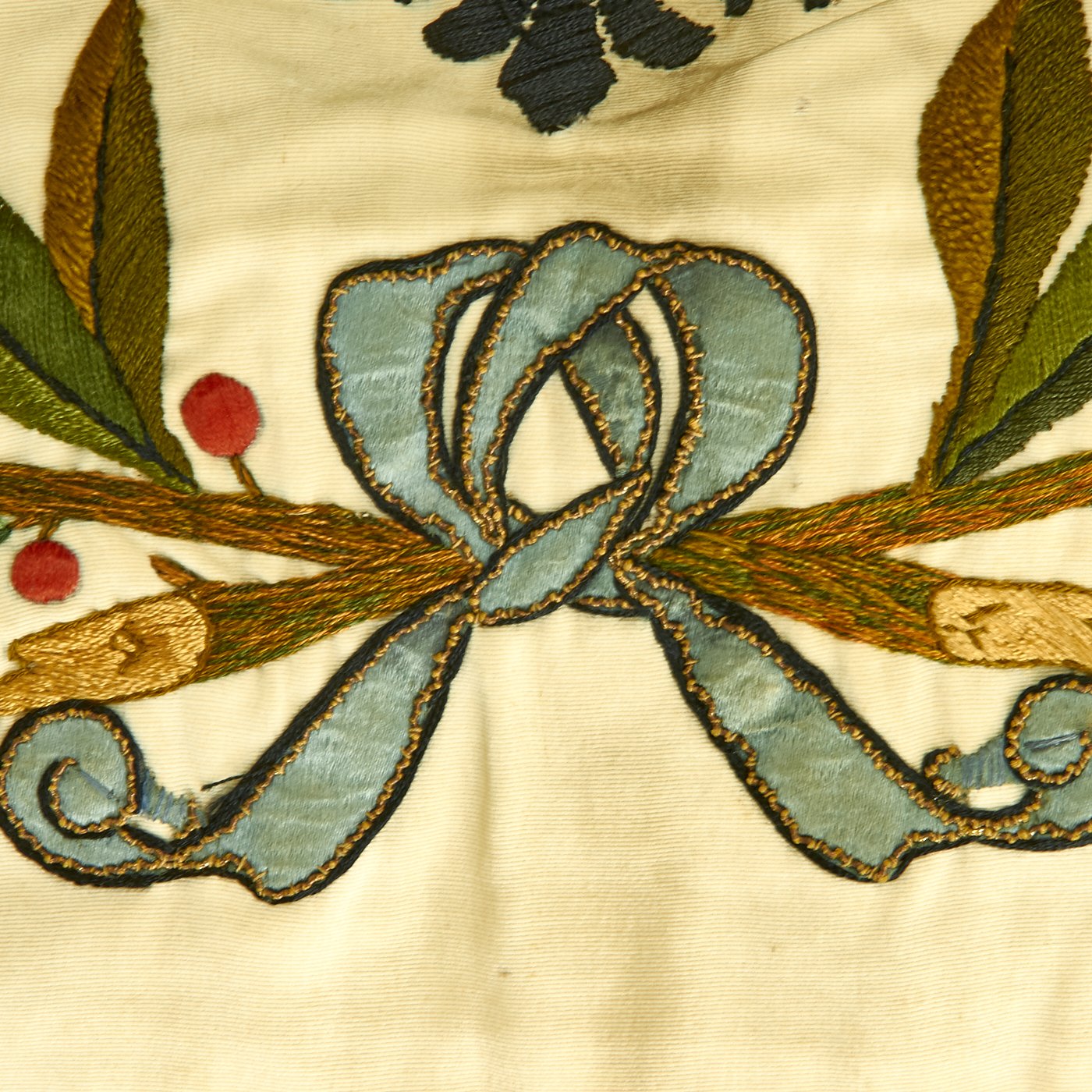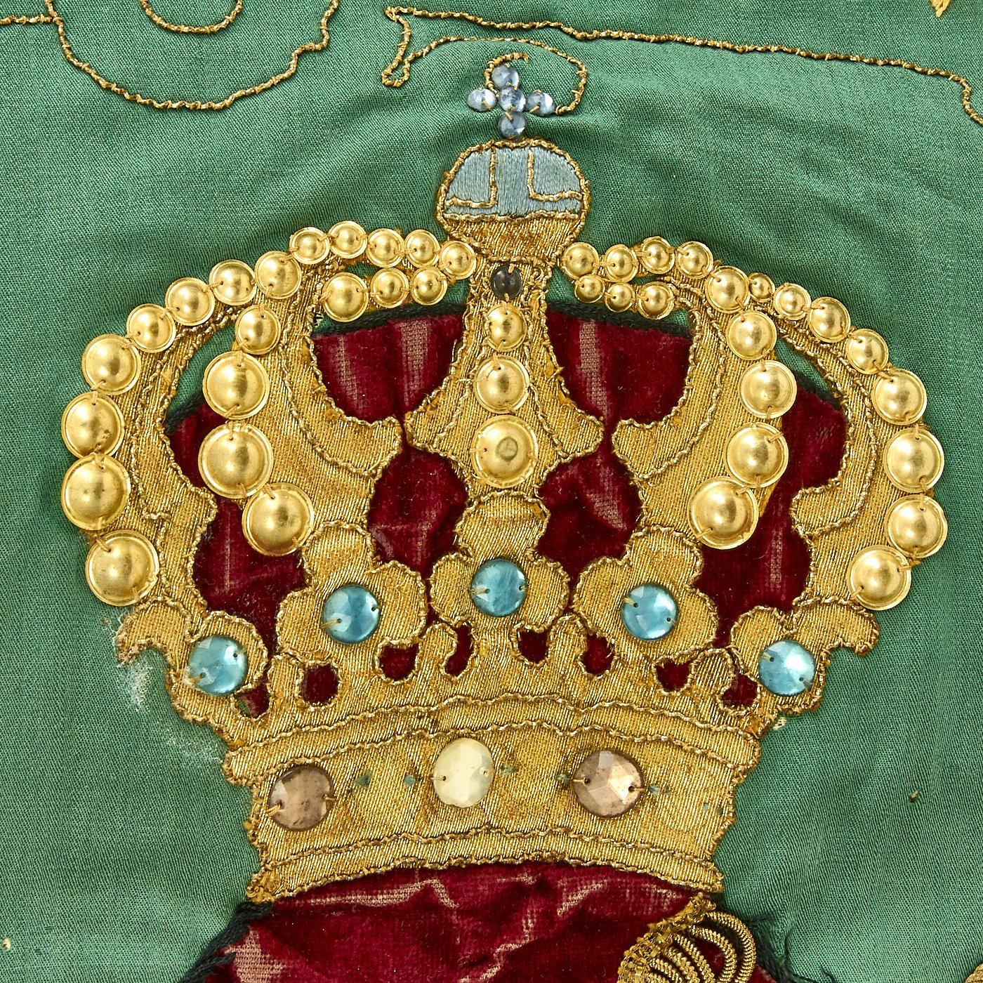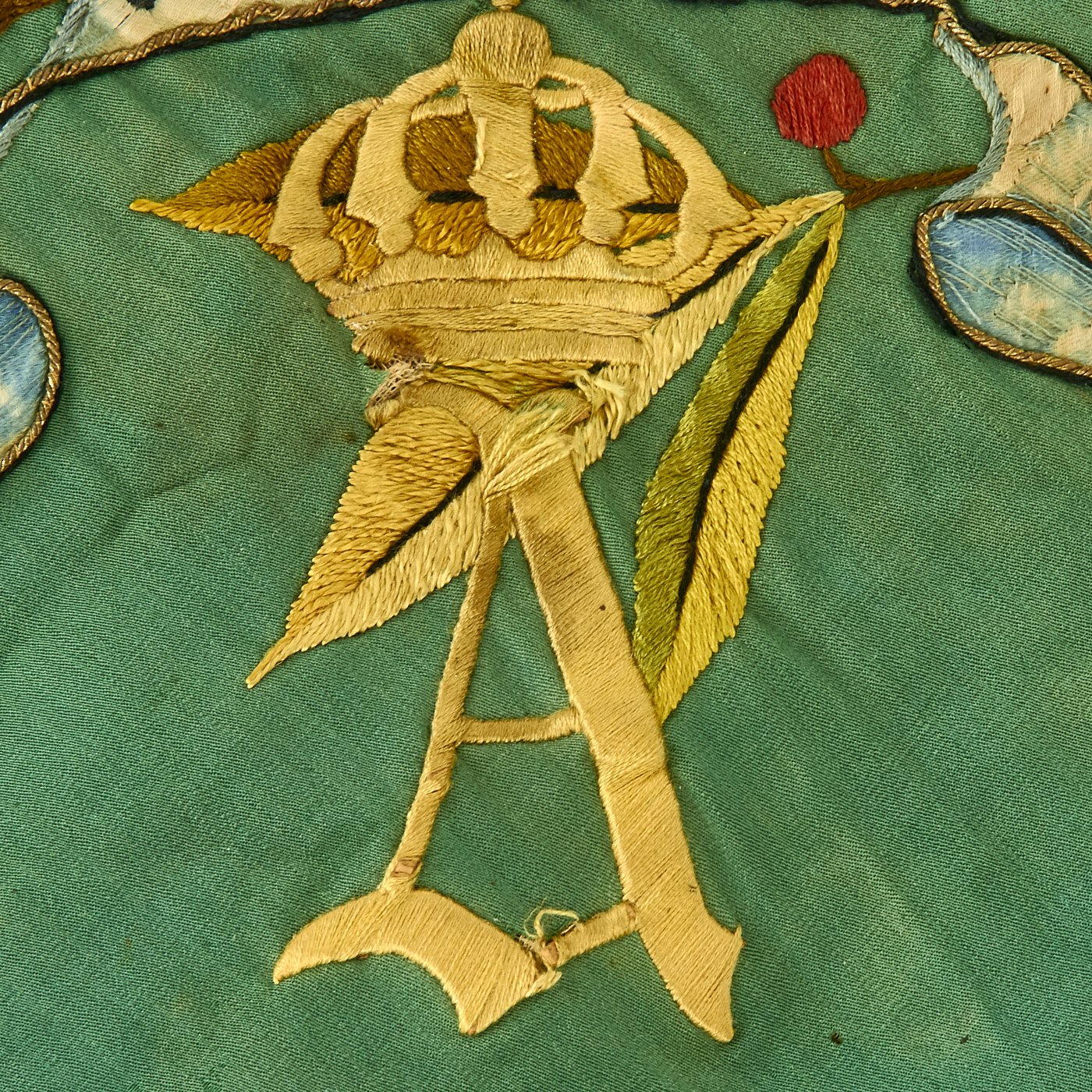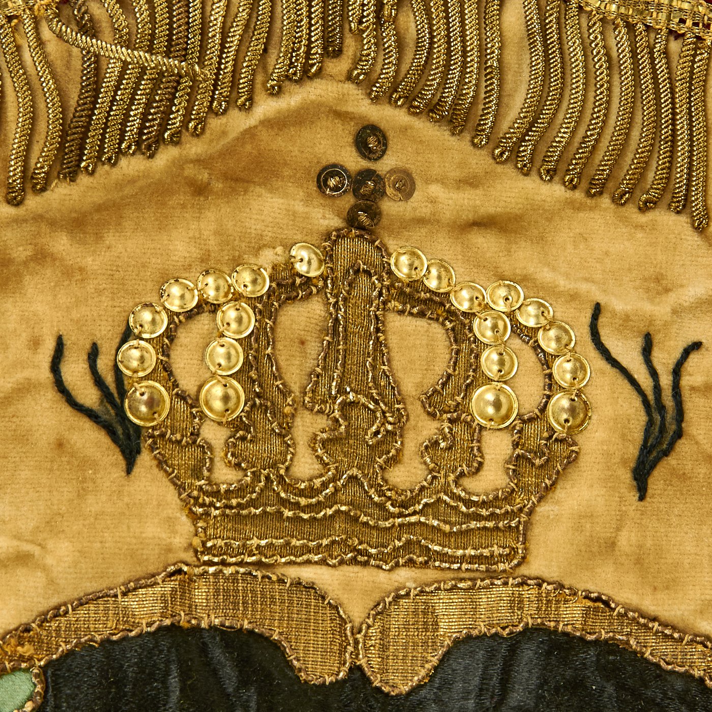 Original Item: Only one available. This flag came from a large collection in the Pacific Coast of the United States and is a spectacular item! It measures a very displayable 56-inches wide by 47-inches tall, with a bullion fringe going around three of four sides. It is double sided, and is of what looks to be cotton construction, with lots of embroidery, including lots using bullion thread. There are even bullion fringes embroidered onto the flags in the design! And immense amount of time must have gone into this lovely flag.
