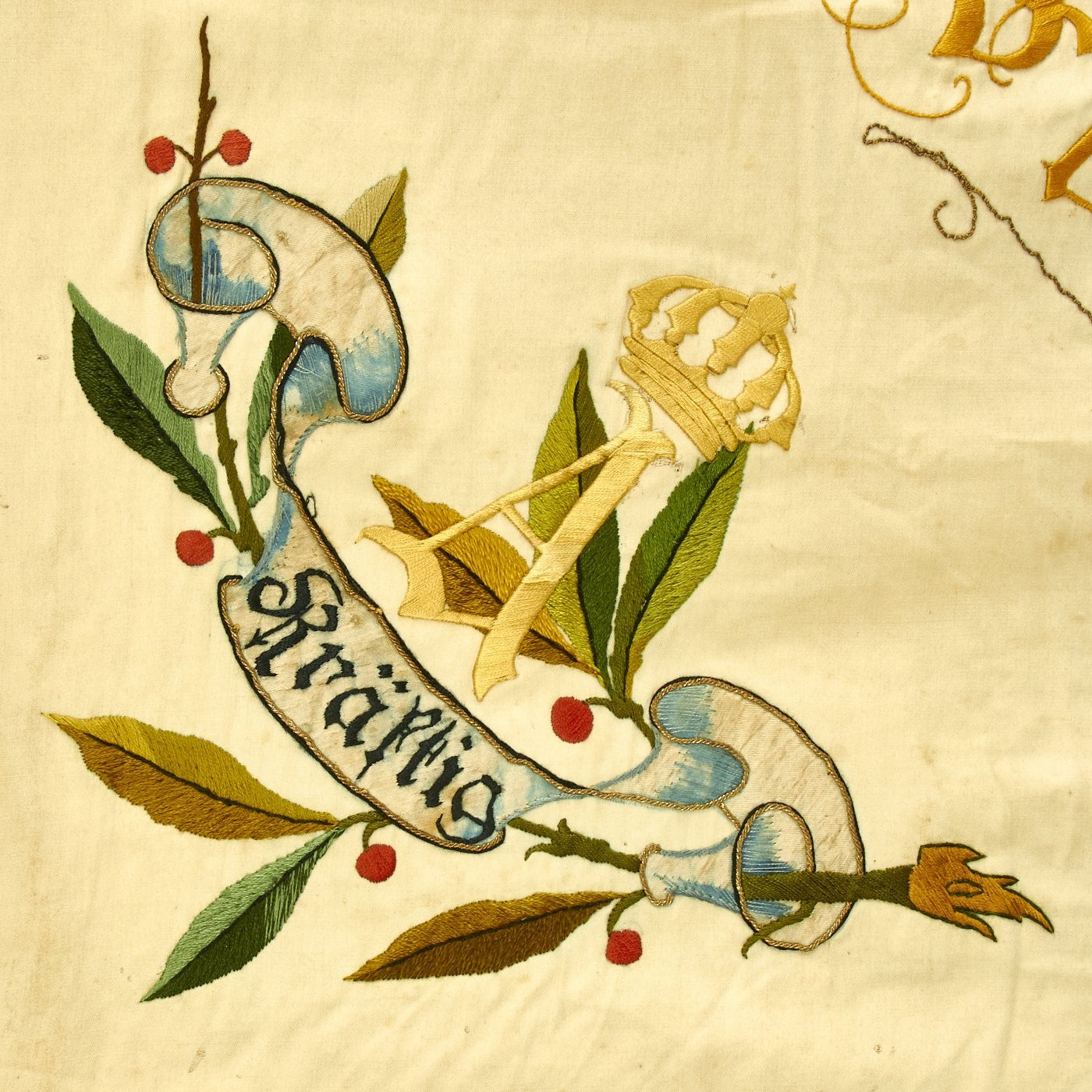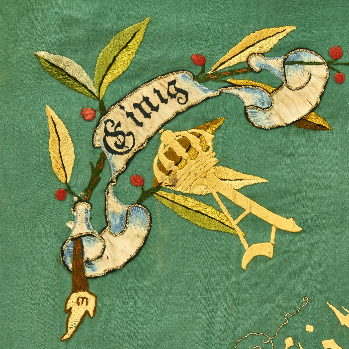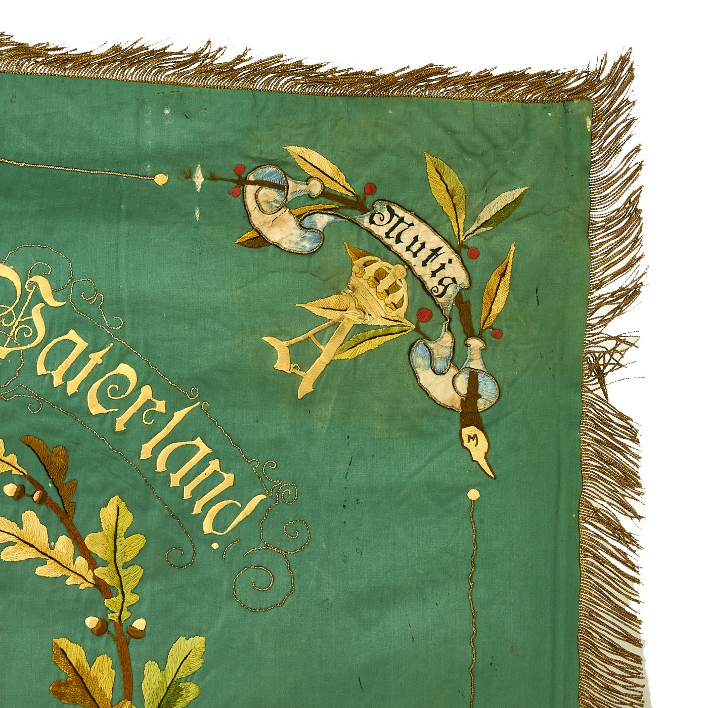 There are also flowers and CROWN / A in each corner, for King Albert of Saxony, who reigned 1873 - 1902, which pretty firmly puts this flag right around the turn of the century. Next to each of these four is a banner with a different German word (clockwise from upper Left): Einig (United), Mutig (Brave), Treu (Faithful), and Kräftig (Strong). These are common attributes desired for good soldiers, and are very common on these Veteran's flags.